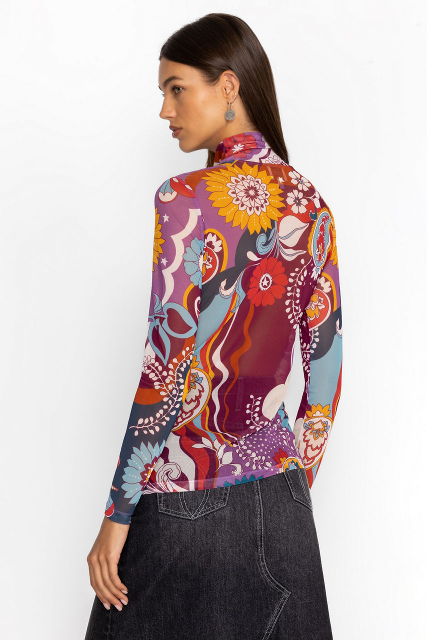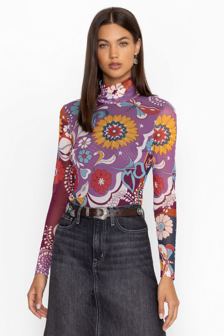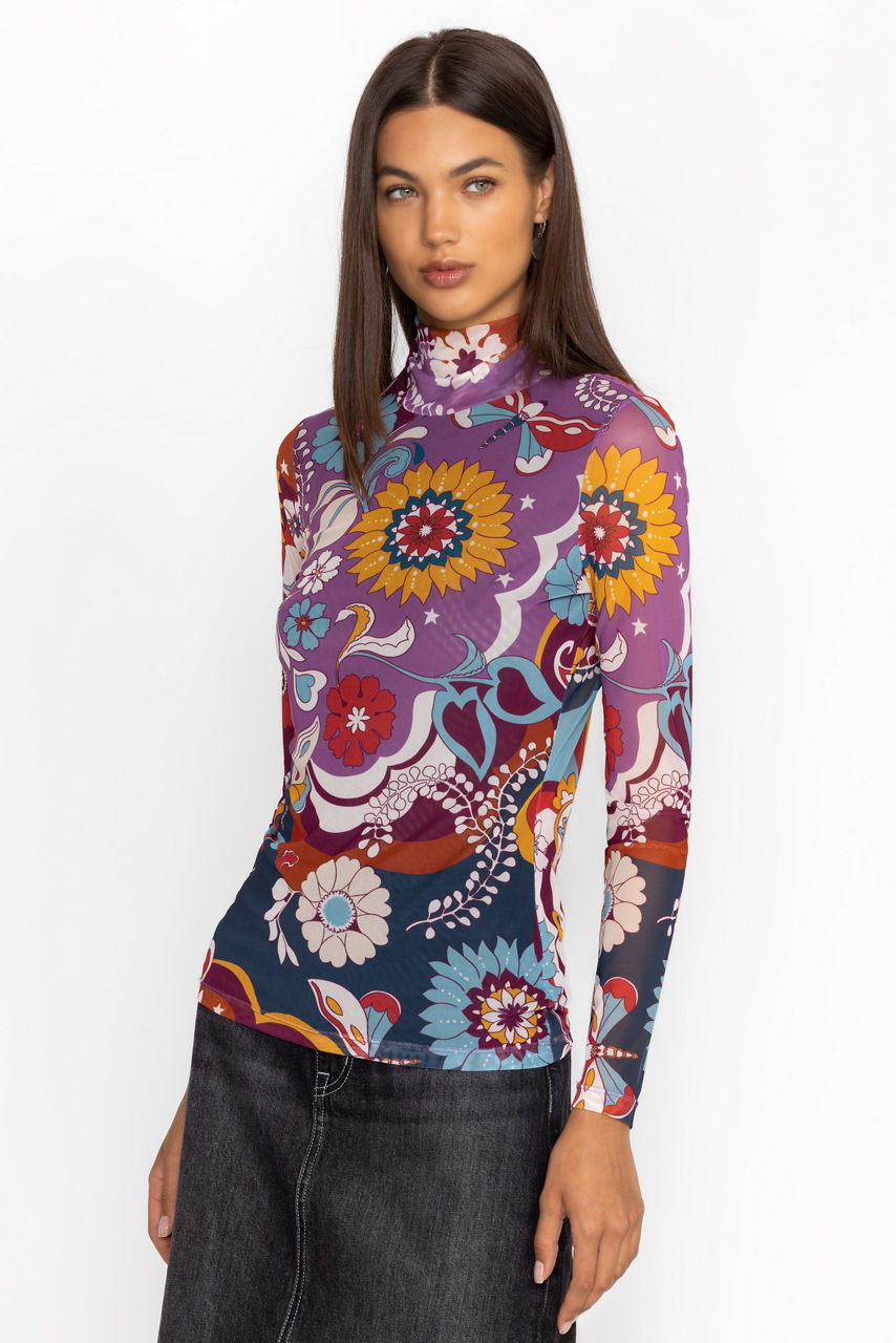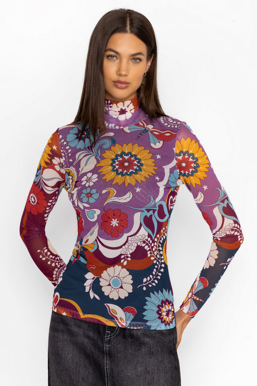 Beautifully adorned with a bold and vibrant print, the Rebecca Mesh Mock Neck Long Sleeve Tee is crafted from a lightweight mesh fabric with a hint of stretch. Featuring a mock neckline and long sleeves, this mesh top is embellished with intricate placement embroidery for added texture. Pair with a pencil skirt and coordinating blazer for a fresh work look.
