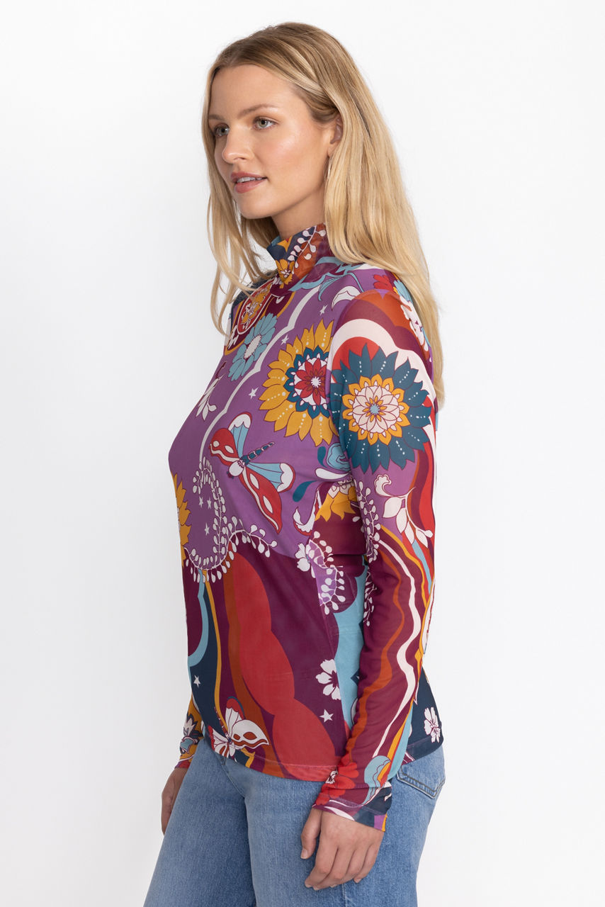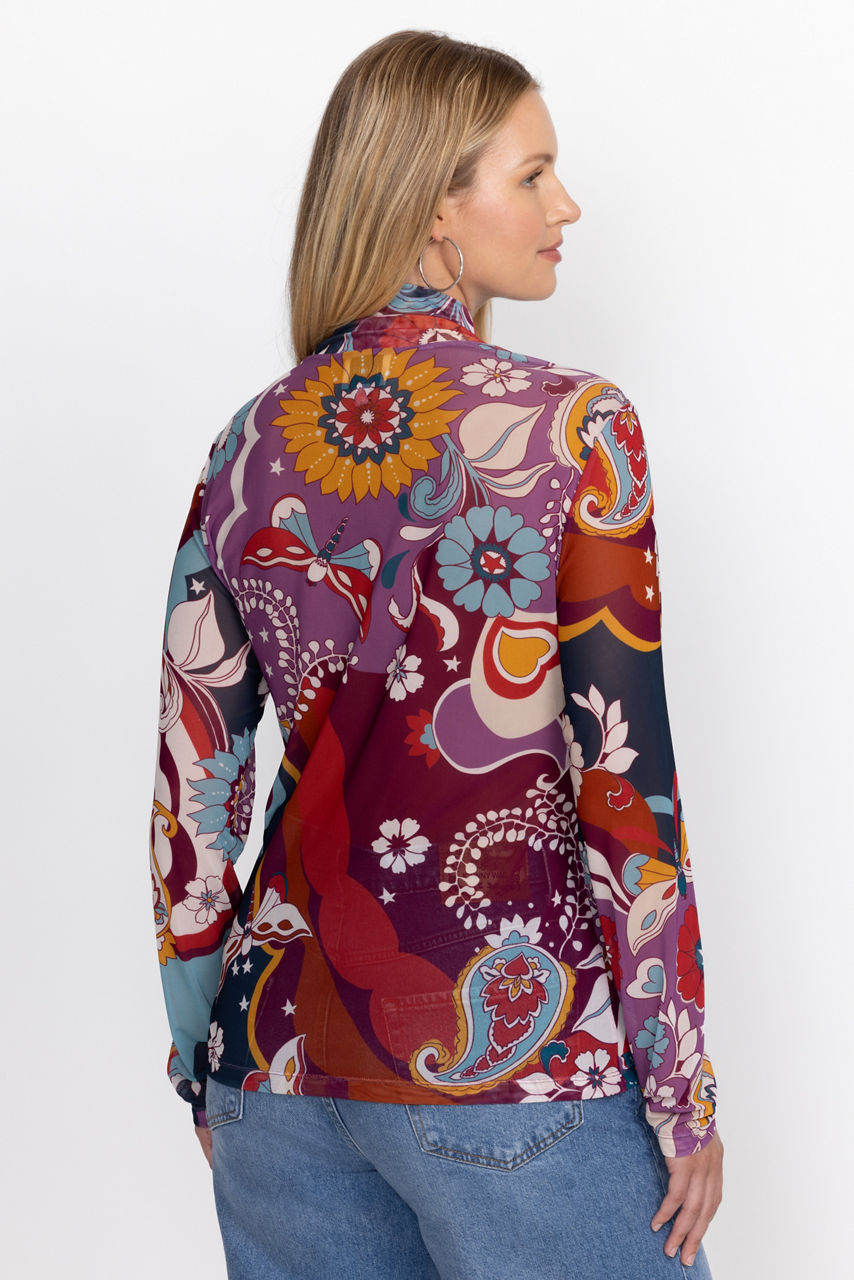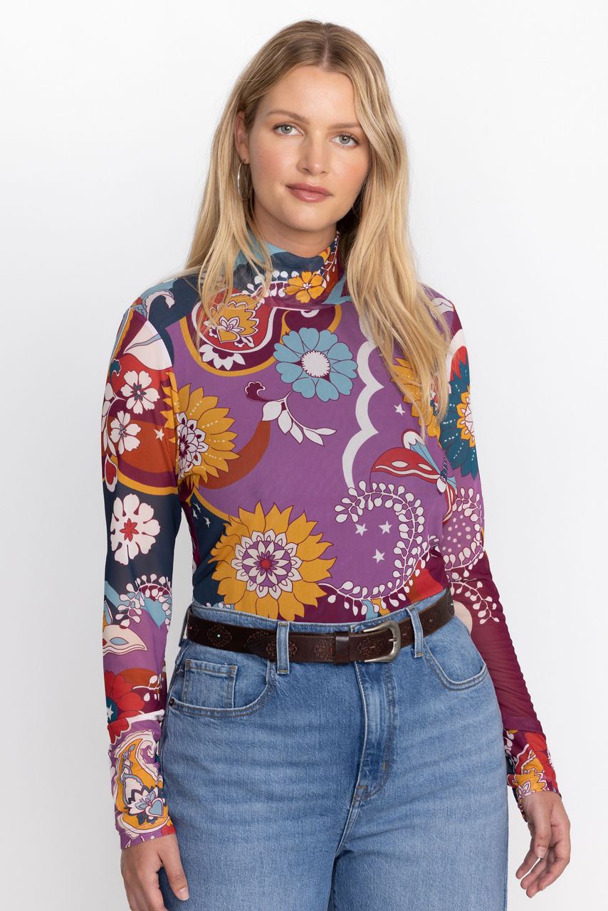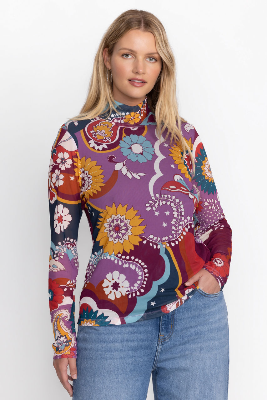 Beautifully adorned with a bold and vibrant print, the Rebecca Mesh Mock Neck Long Sleeve Tee is crafted from a lightweight mesh fabric with a hint of stretch. Featuring a mock neckline and long sleeves, this mesh top is embellished with intricate placement embroidery for added texture. Pair with a pencil skirt and coordinating blazer for a fresh work look.