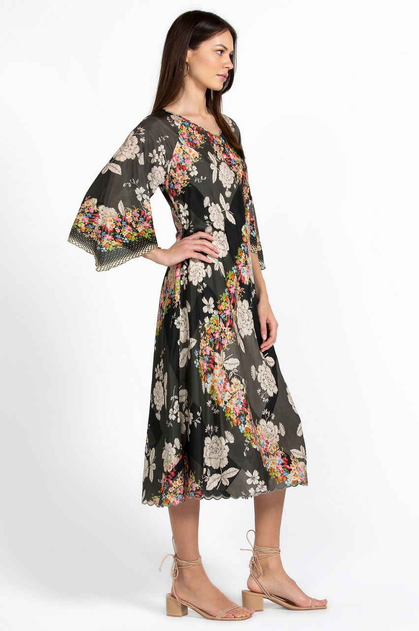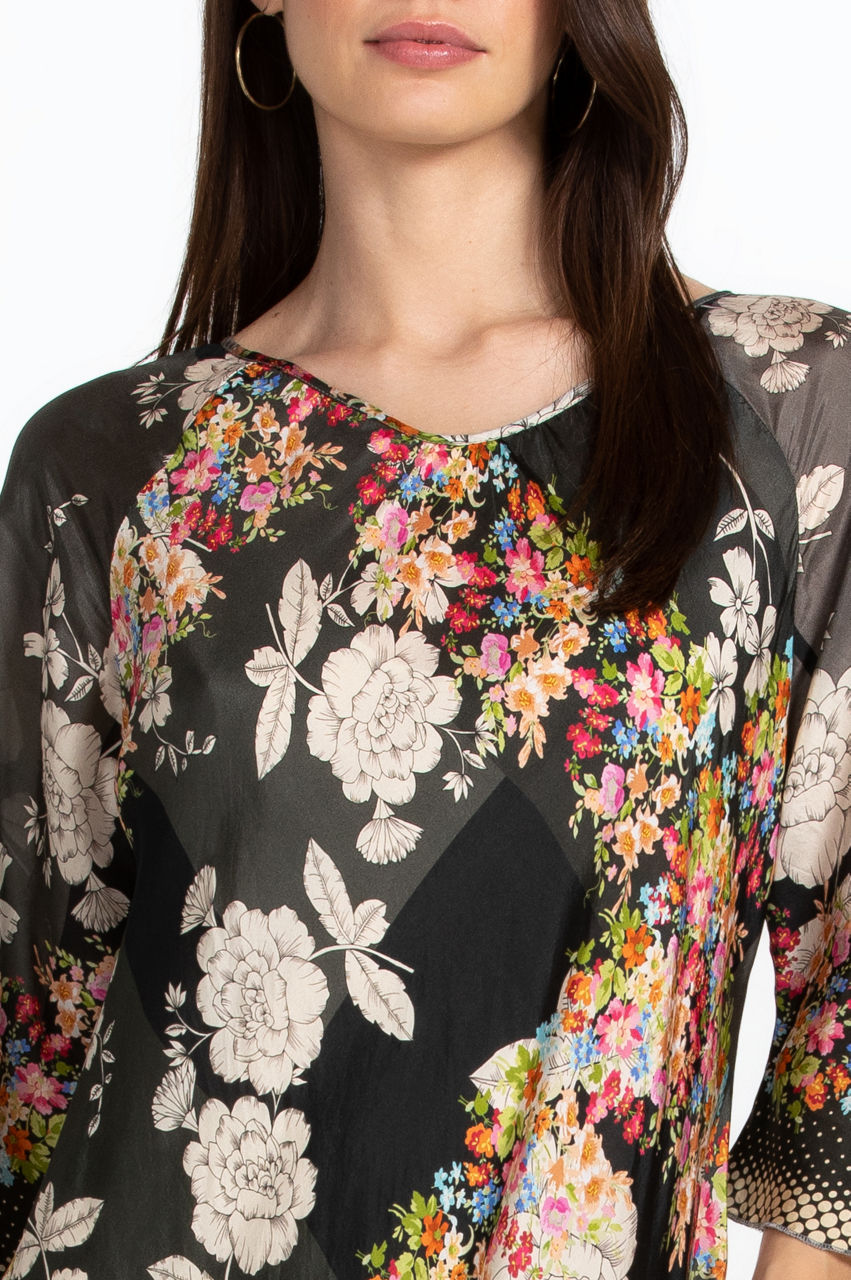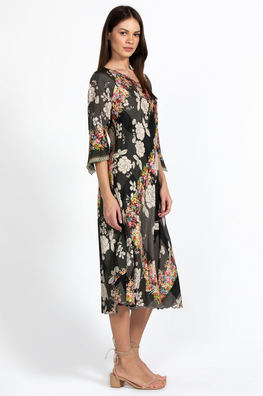 A free-flowing cut and arty details bring the Redland Raluca Dress to life. Enhanced by a contrasting color palette, this dress is spun from lustrous silk and features a monochromatic background complete with a multicolored floral print for a bold finish. Finished with a round neck and asymmetric sleeves, it can be worn with flats or dressed up with heels to soirees and family gatherings.