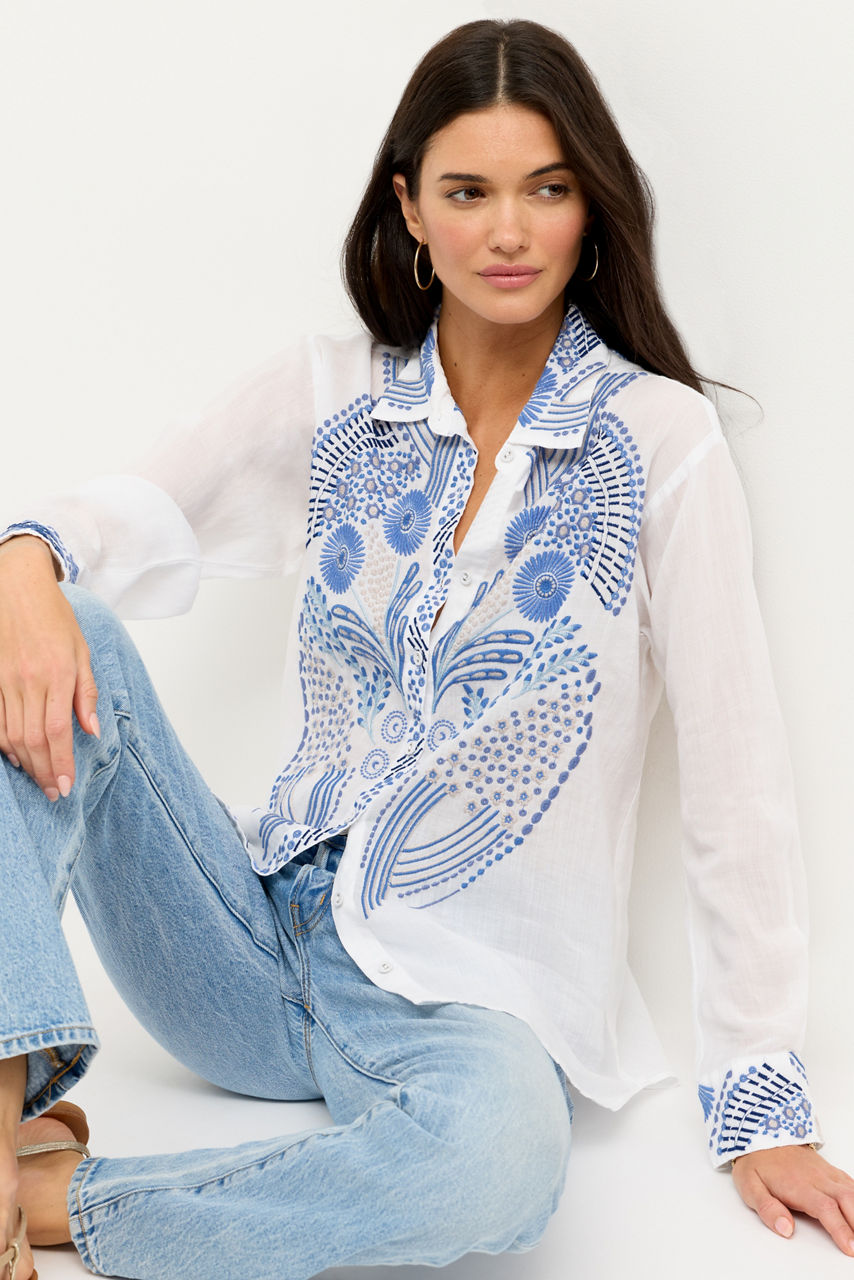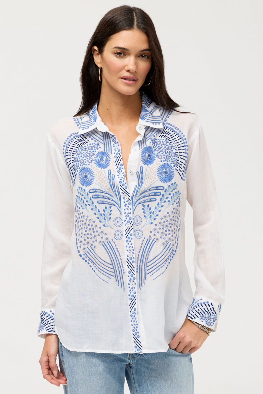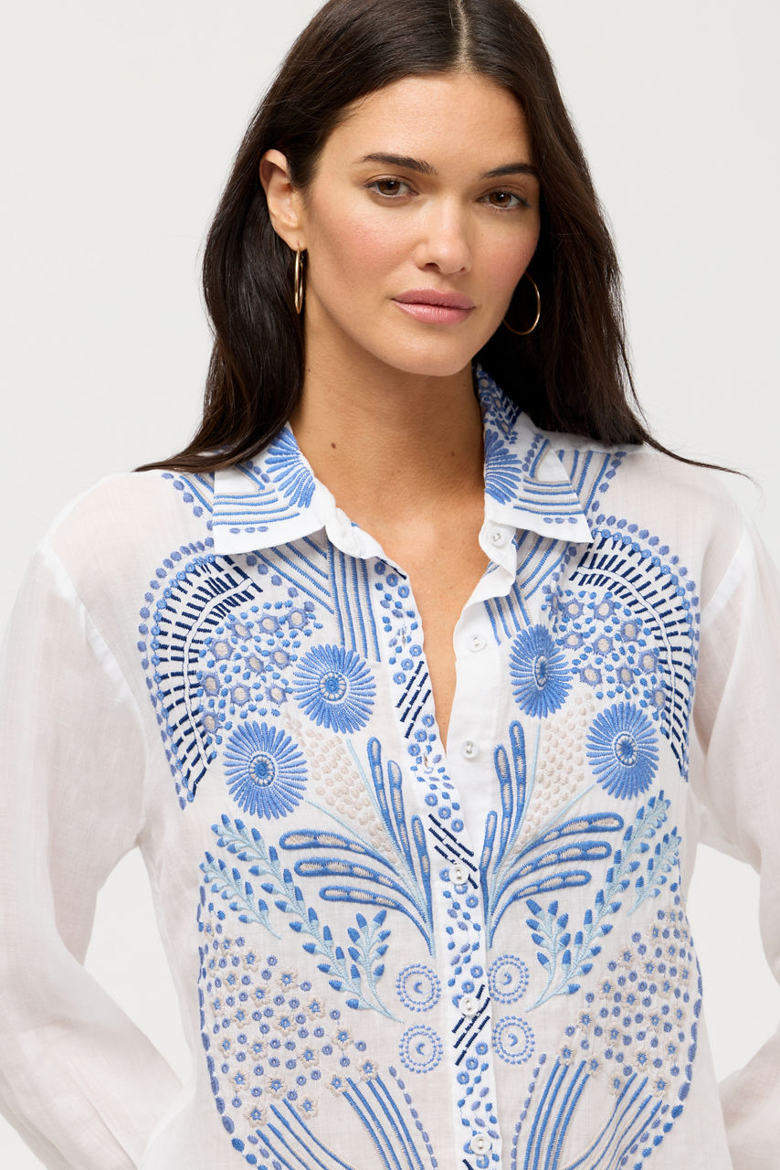The Relaxed Button Down Shirt is beautifully embellished with an intricate embroidered pattern featured on the front and back of the shirt and along the sleeves. Designed with a collared button-front and long sleeves, this lightweight shirt is versatile and comfortable. Pair with relaxed-fit jeans and trendy ankle boots for a fun girls' night out.