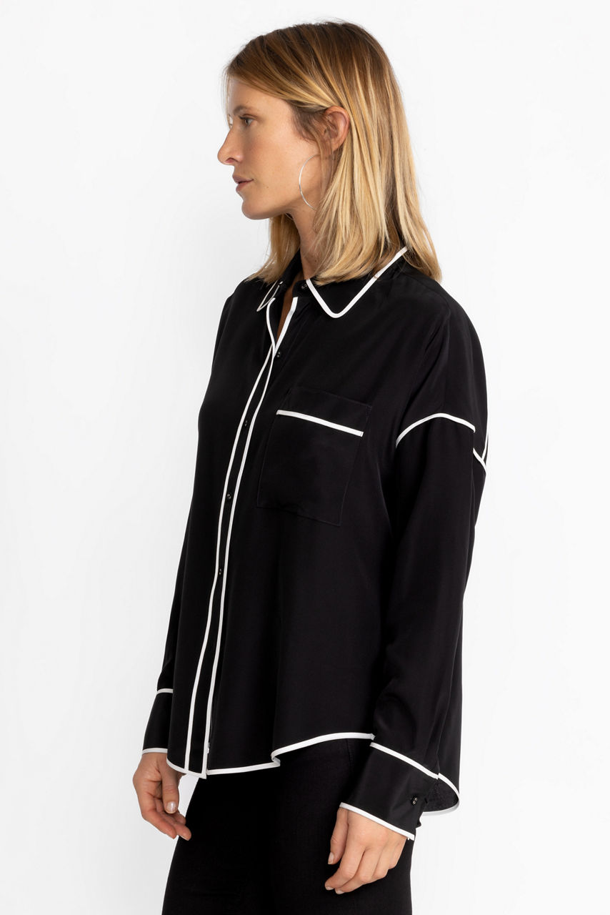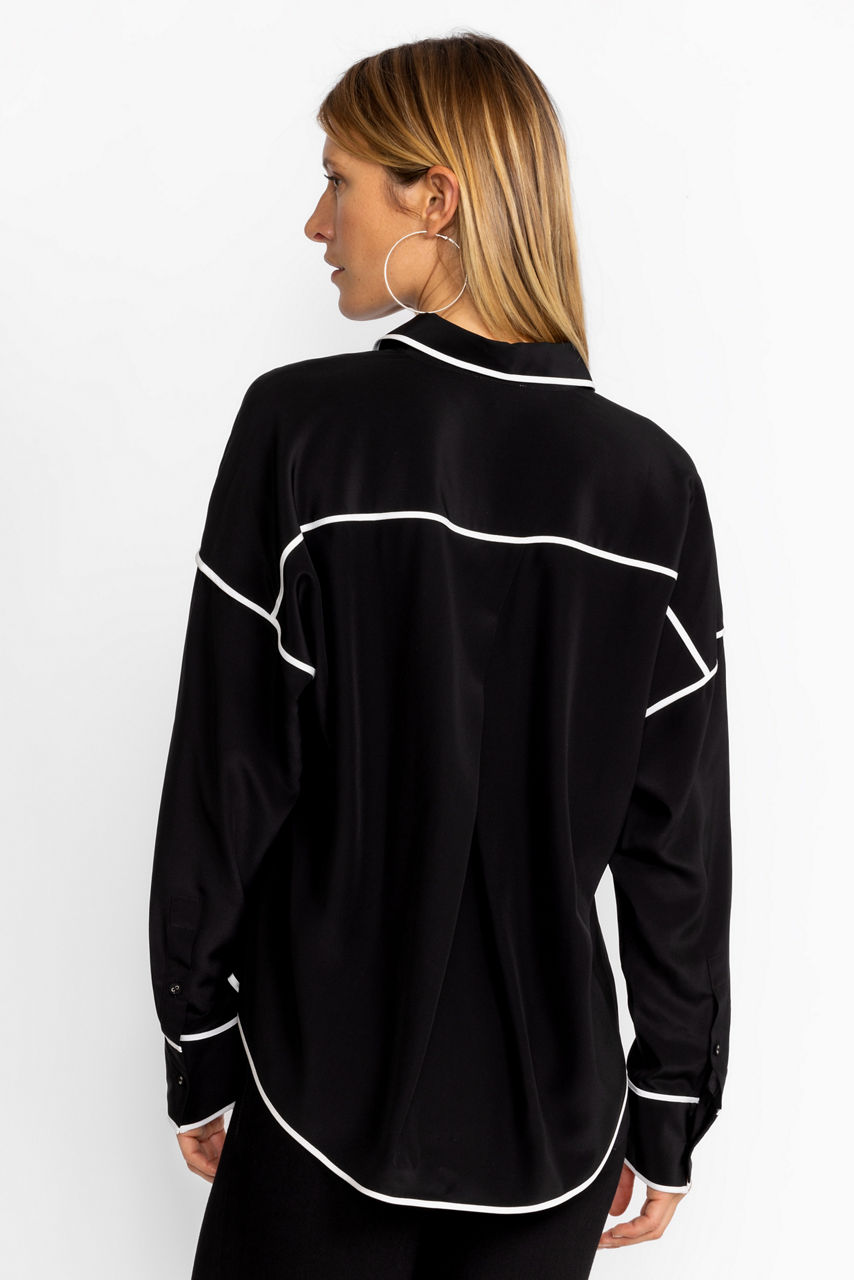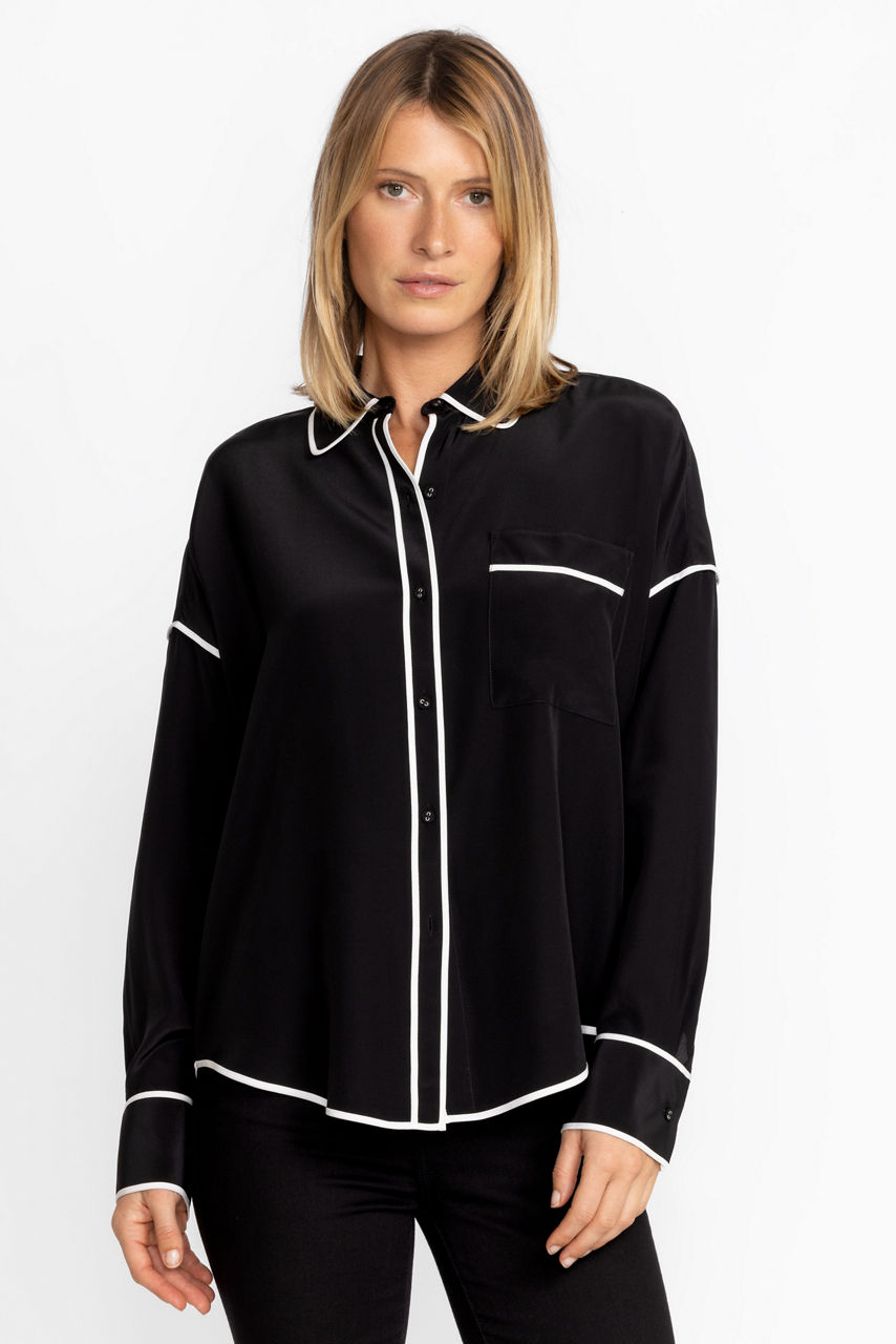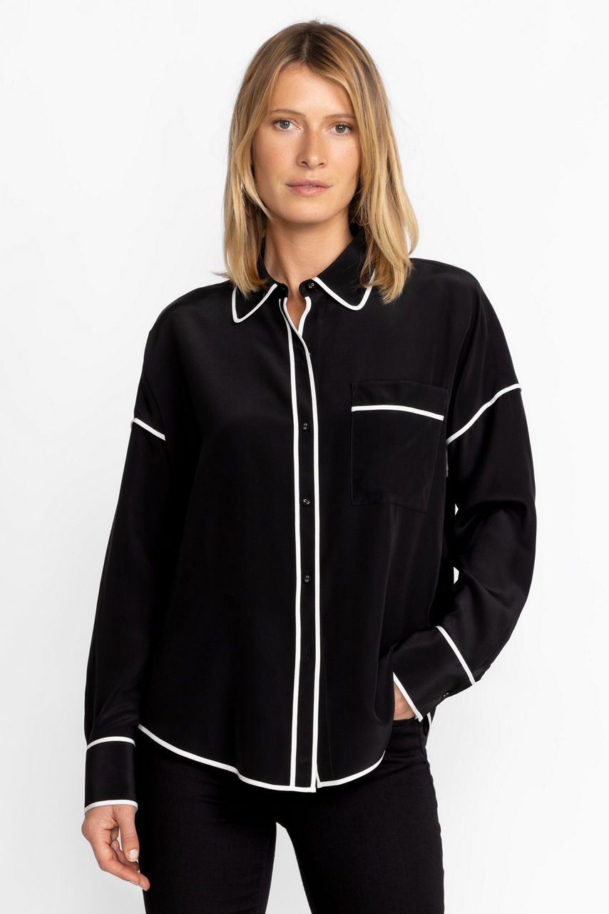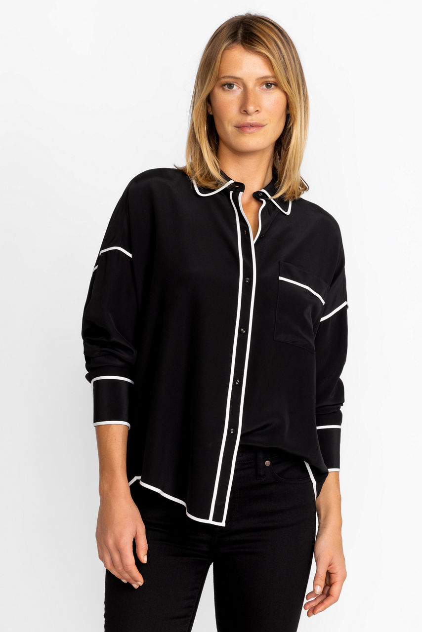 Adding a fun twist to a traditionally masculine silhouette, the Relaxed Button Down with Piping adds new life to an old favorite. Crafted from 100% flowing silk, this button-front blouse features a relaxed fit and high-low hem as well as contrast piping for a sophisticated finish. Pair with white wide leg pants and kitten heels for a night out.