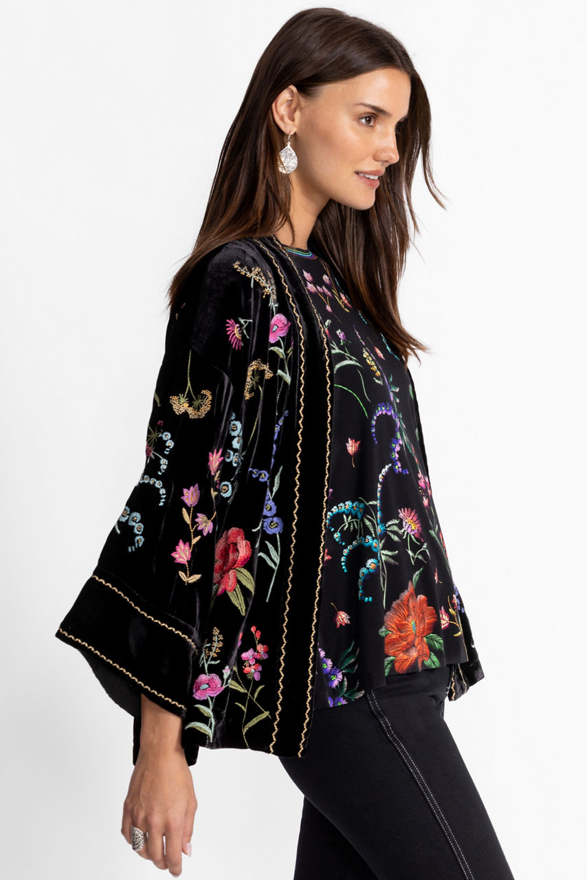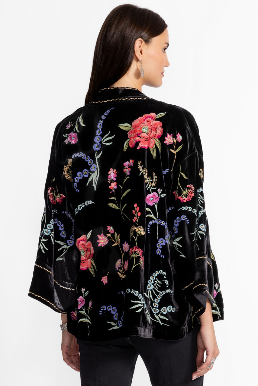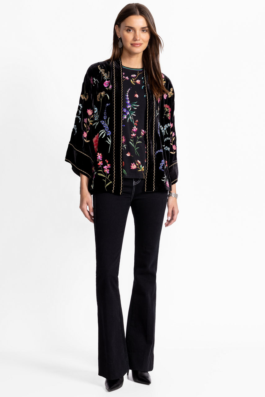 Embellished with an intricate floral embroidered pattern, the Relaxed Schiffli Cropped Kimono is accented with bold color. Crafted from a luxurious silk blend, this open-front kimono features a contrasting trim and is finished with wide sleeves and a relaxed fit. Layer over a bold cami top paired with silk pants for a posh evening look.