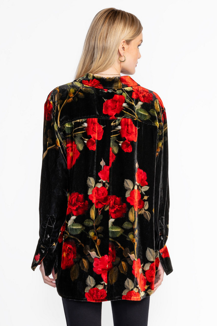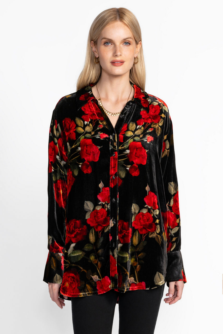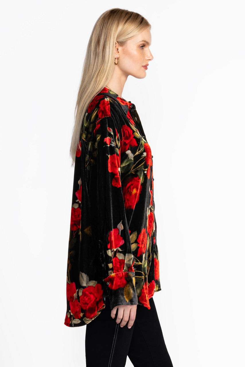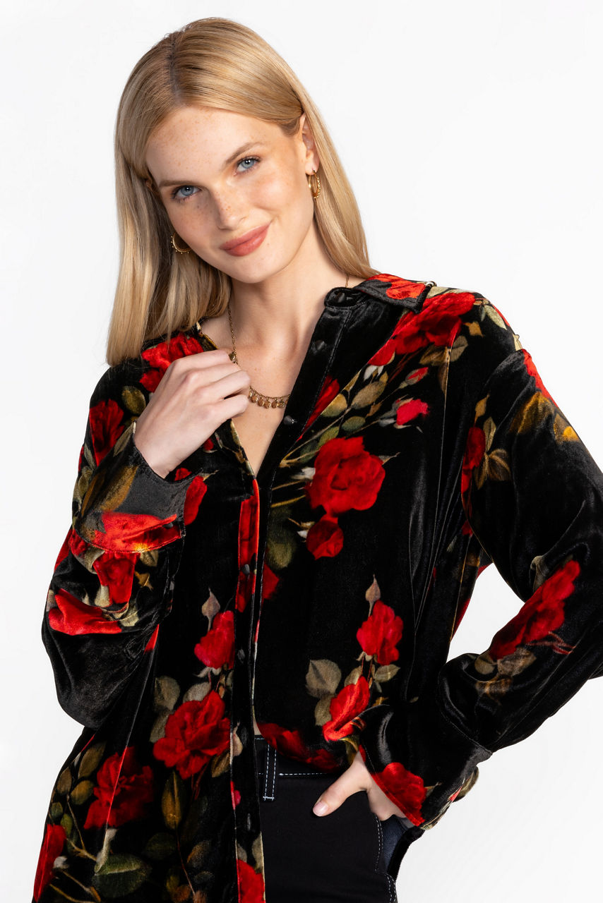 Beautifully adorned with bold red roses in bloom, the Relaxed Seamed Shirt offers a feminine twist on traditional shirting. Designed with a classic collared button-front, this stunning lightweight blouse is finished with unique seamed detailing and is finished with a curved hemline for a modern silhouette. Pair with fitted pants and bold flats for an eye-catching look.