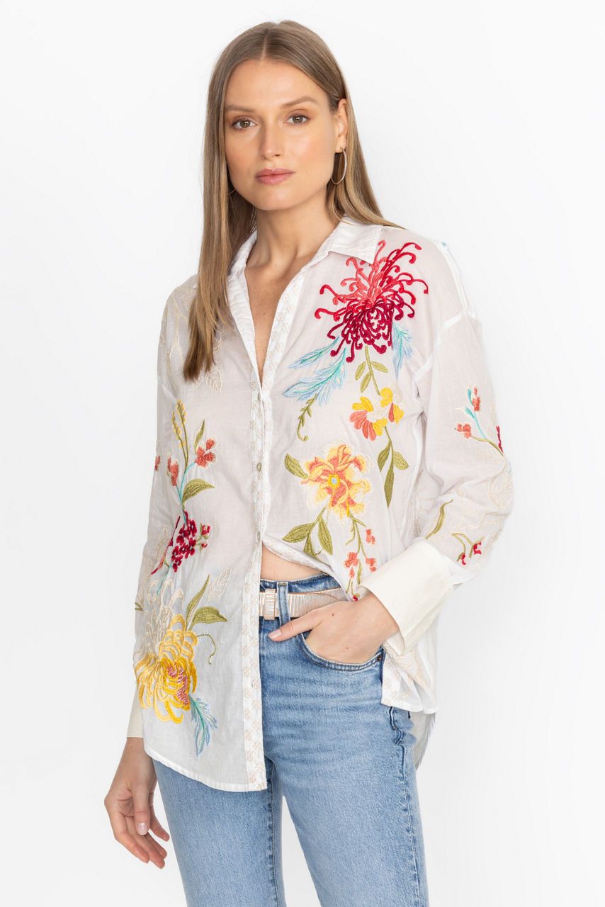 Crafted from 100% cotton, the Malory Relaxed Seamed Shirt offers a whimsical twist on a classic button-down. Featuring a traditional collared button front, this long sleeve shirt offers a relaxed fit and is finished with vibrant placement embroidery. Pair with wide leg trousers and polished flats for a modern work look.