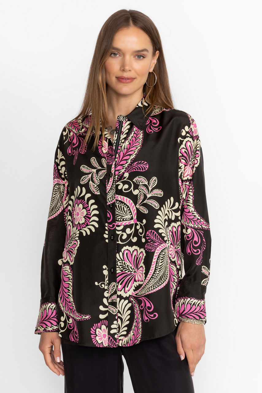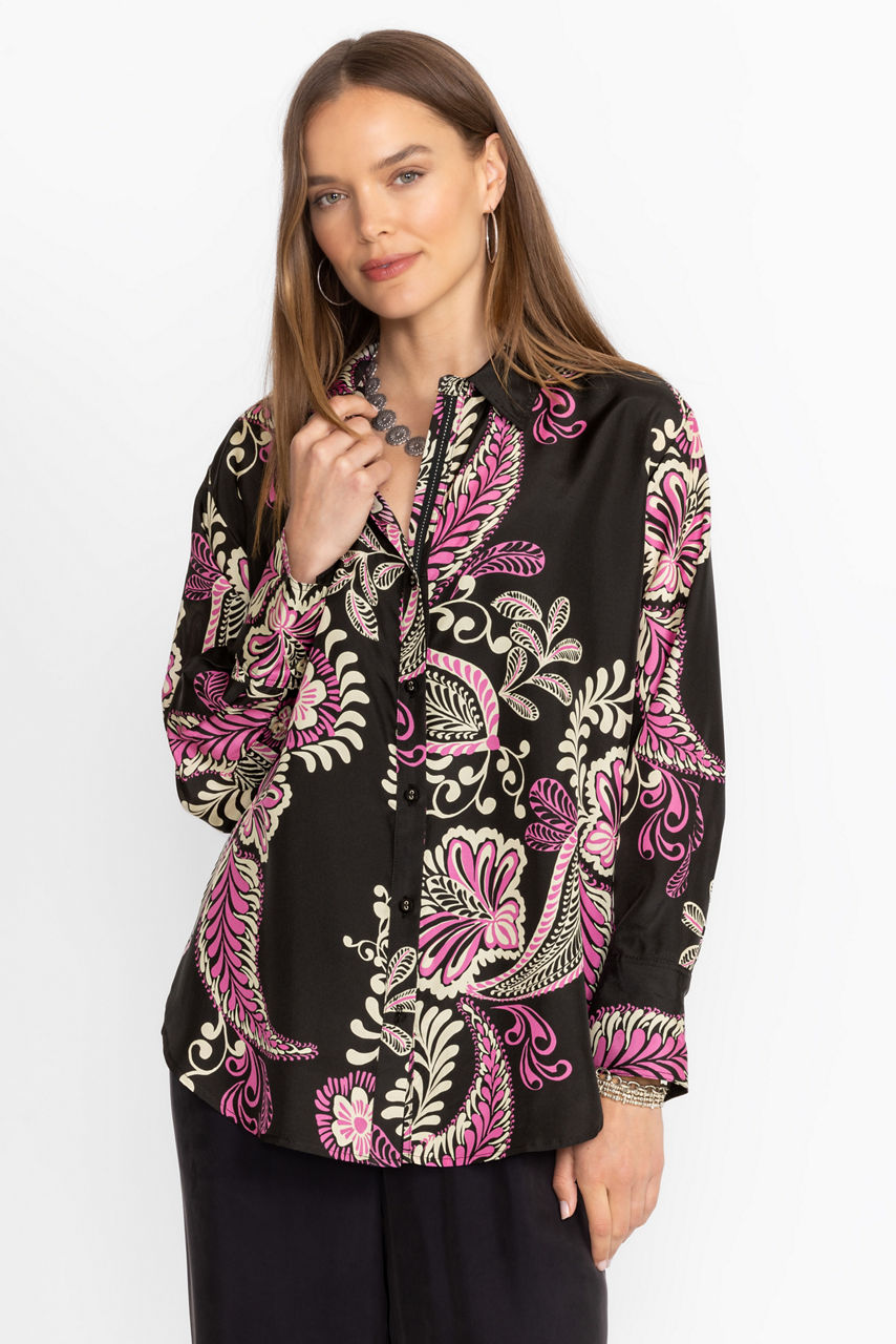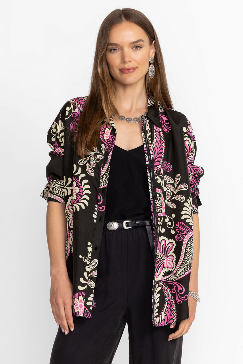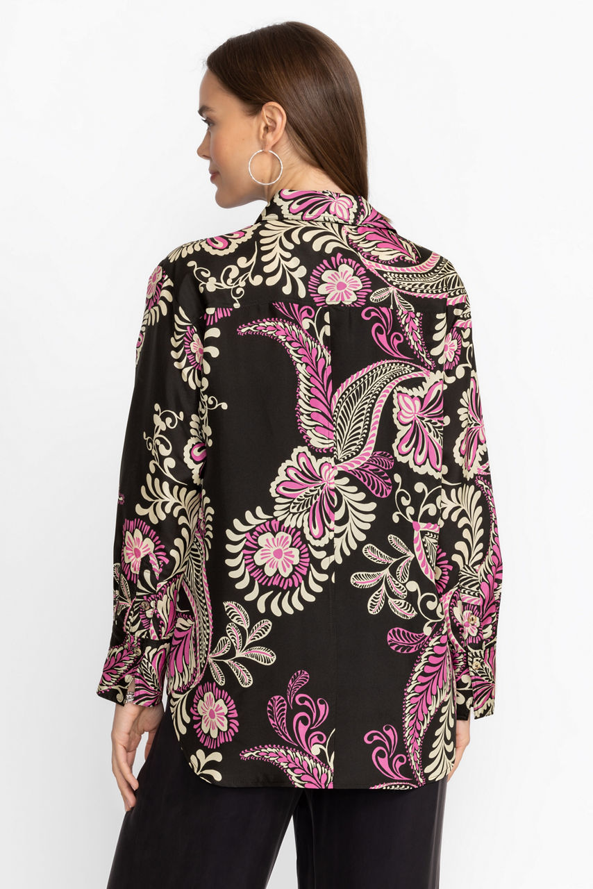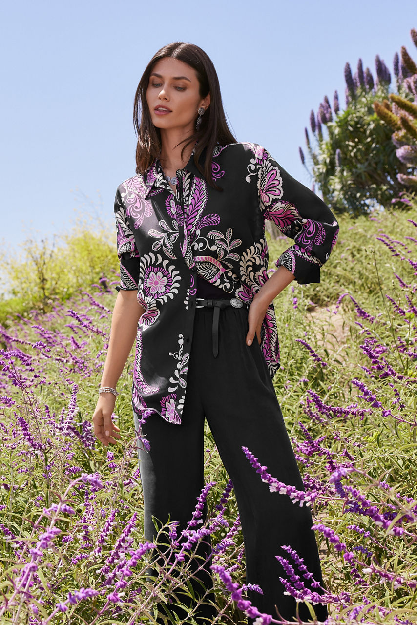 Crafted from 100% sumptuous silk, the Relaxed Seamed Shirt offers an elevated take on a traditional button-down. Featuring a classic collared button front, this blouse is adorned with bold floral blooms and is finished with a gently curved hemline. Pair with relaxed trousers and kitten heels for a polished look rich in style.