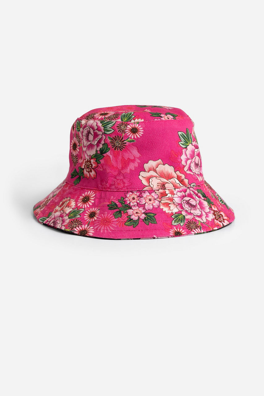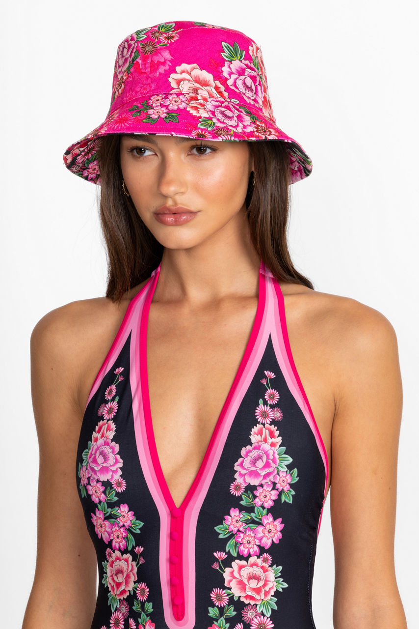 Equal parts flirty and fun, the Reversible Bucket Hat provides added protection from the sun and heat. Featuring two distinctive patterns embellished with bold floral accents, this fully reversible hat is crafted from 100% breathable cotton. Pair with the Blum Halter One Piece and the V-Neck Kaftan for a fresh poolside look.