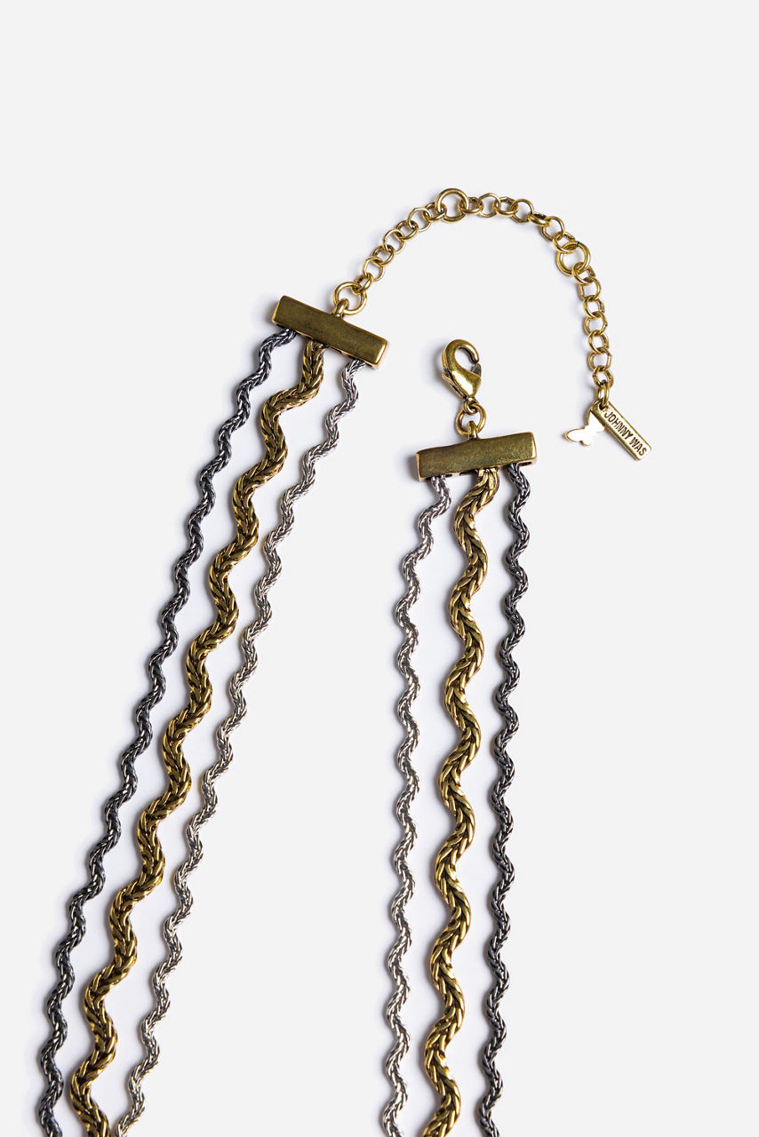 Inspired by the rolling waves of the ocean, the Ric Rac Triple Strand Necklace adds a touch of shine to any look. Thoughtfully crafted by combining three unique necklace strands of metallic ric rac, this eye-catching necklace is finished with a gold-tone metal lobster clasp closure. Combine with the Triple Strand Drop Earrings and the Seven Strand Bracelet for a coordinated jewelry set.