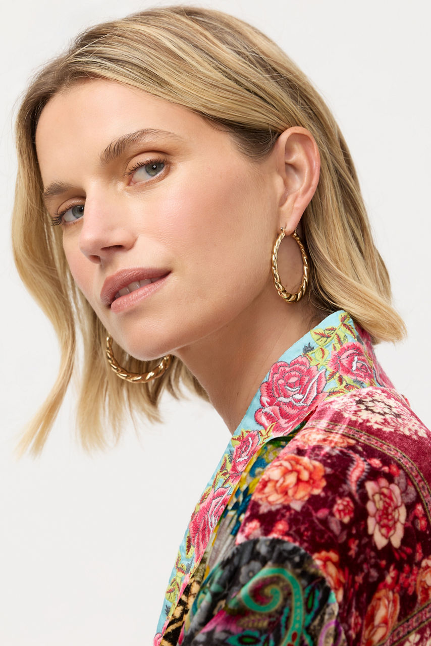 The Ridged Rope Hoops embody timeless elegance with a modern, free-spirited twist. Crafted in a radiant gold tone, these hoops feature intricate detailing reminiscent of artisanal rope work, adding depth and texture to their sculptural form. Wear them to elevate everyday looks or pair with flowing silhouettes for an effortlessly bohemian statement.
