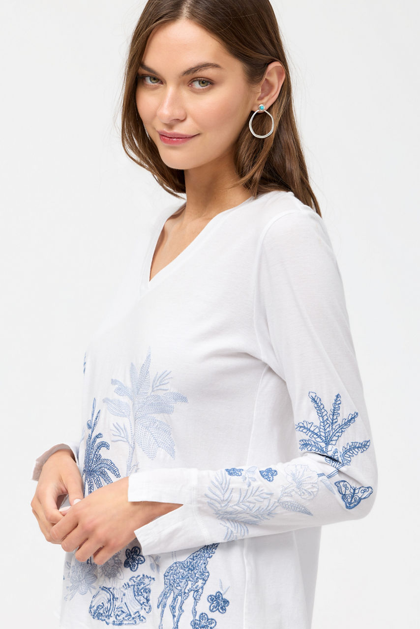 Crafted from breathable 100% cotton, the Slit Sleeve Tee is intricately embroidered with a bold pattern. Designed with a V-neckline and long sleeves, this casual tee is finished with a gently curved hemline and split cuffs for an elevated look. Pair with medium wash denim and crisp white sneakers for a casual weekend.