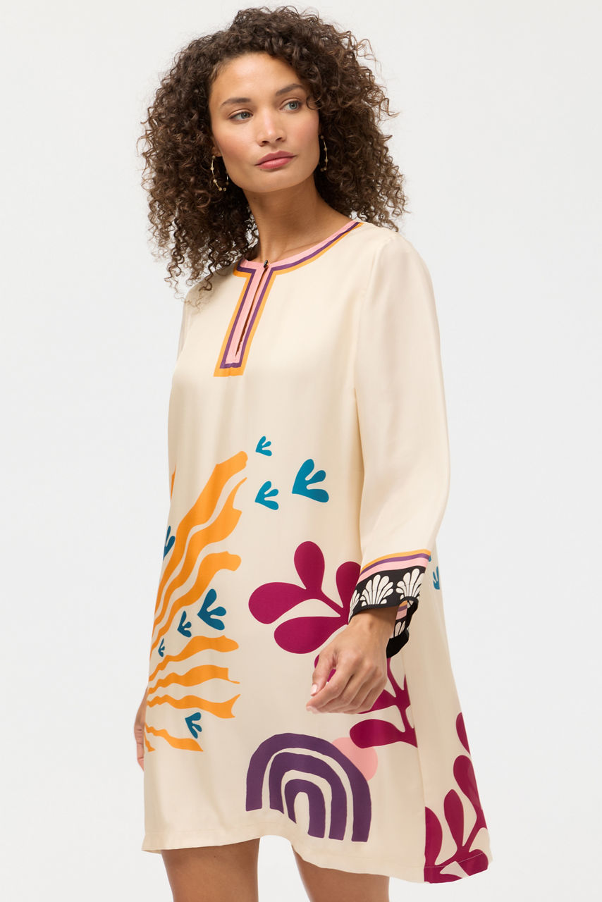 Embellished with vibrant accents and rich color, the Ringo Mini Dress is crafted from a unique silk blend. Featuring a split V-neckline and wide 3/4 sleeves, this bold mini dress is finished with a classic A-line silhouette. Pair with espadrille wedges and eclectic jewelry pieces for an unforgettable daytime look.