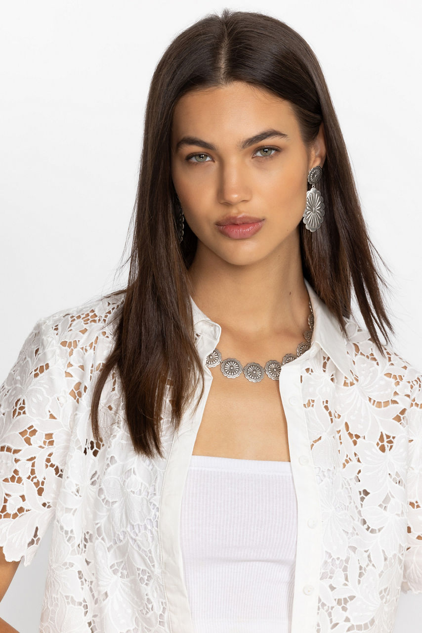 Crafted from 100% Brass with silver ox plating, the River Ranch Concho Necklace takes inspiration from history. Featuring a series of small conchos connected by a link chain, this eye-catching necklace adds texture and shine to your look. Pair with the River Ranch Concho Earrings for a perfectly coordinated look.