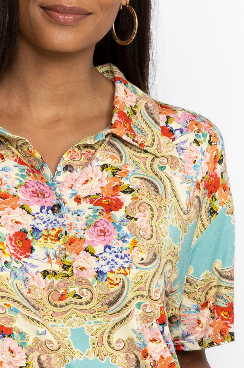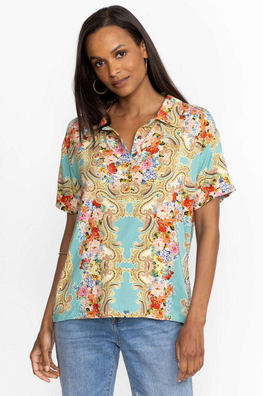 A fresh twist on a classic favorite, the Rivoray Short Sleeve Polo Tee gives the timeless silhouette a bold feminine update. Adopting a relaxed A-line silhouette while boasting an intricate floral design, this top allows for unrestricted movement and abounding comfort. Pair with golf pants for a sunny day on the course.