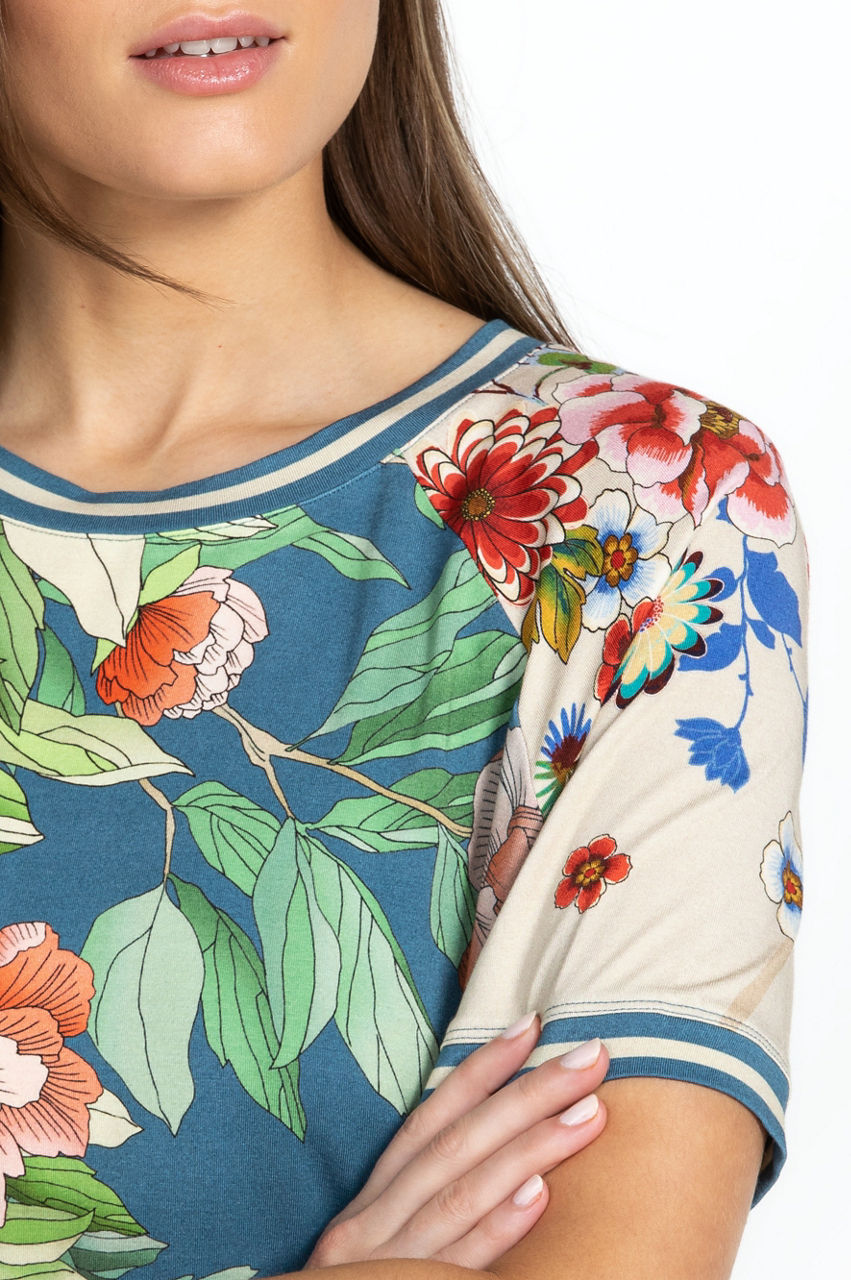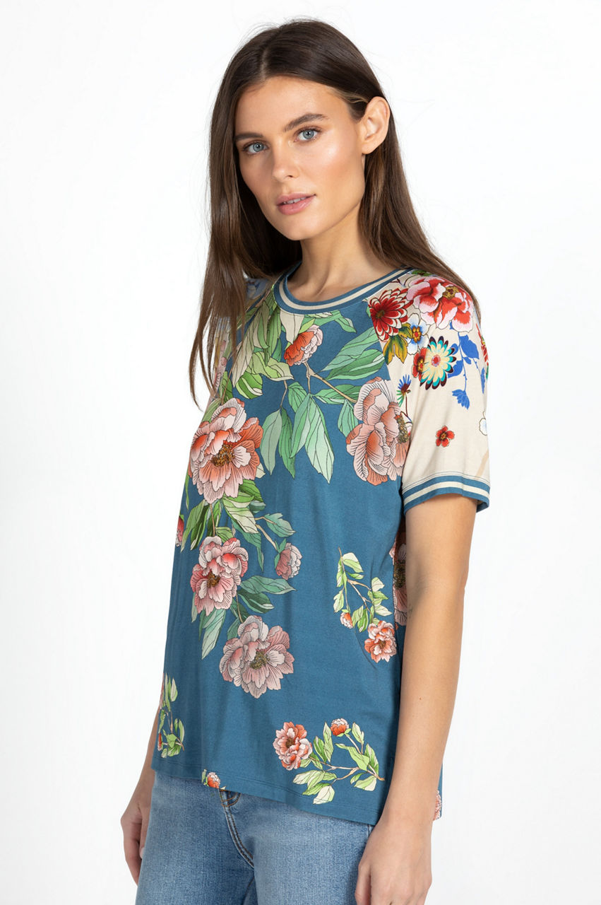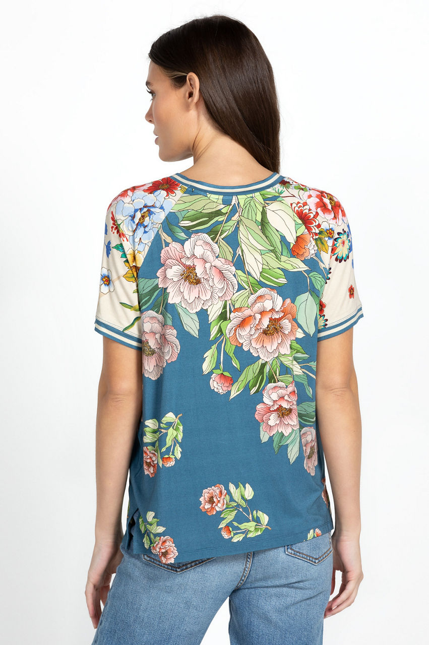 Cut in a regular fit, the Romano Raglan Tee makes a case for leisurely off-duty glamour. This tee reworks a casual sports-inspired style with a selection of antique roses and a lighthearted floral pattern across the short raglan sleeves. Finished with a round neck, this tee can be teamed with relaxed pants or styled with shorts for a colorful vacation-ready outfit.