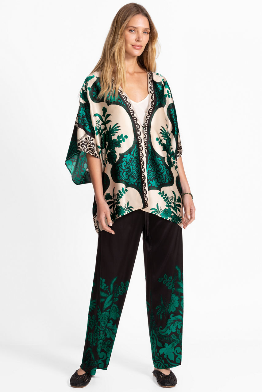 Ornately embellished in hues of cream and green, the Ronan Kimono is crafted from a unique silk blend with a hint of stretch. Designed with draped kimono sleeves and a simple loop closure, this kimono is finished with a contrasting trim at the opening. Layer over a cream top and classic black trousers and pair with jade jewelry accents for a polished evening look.