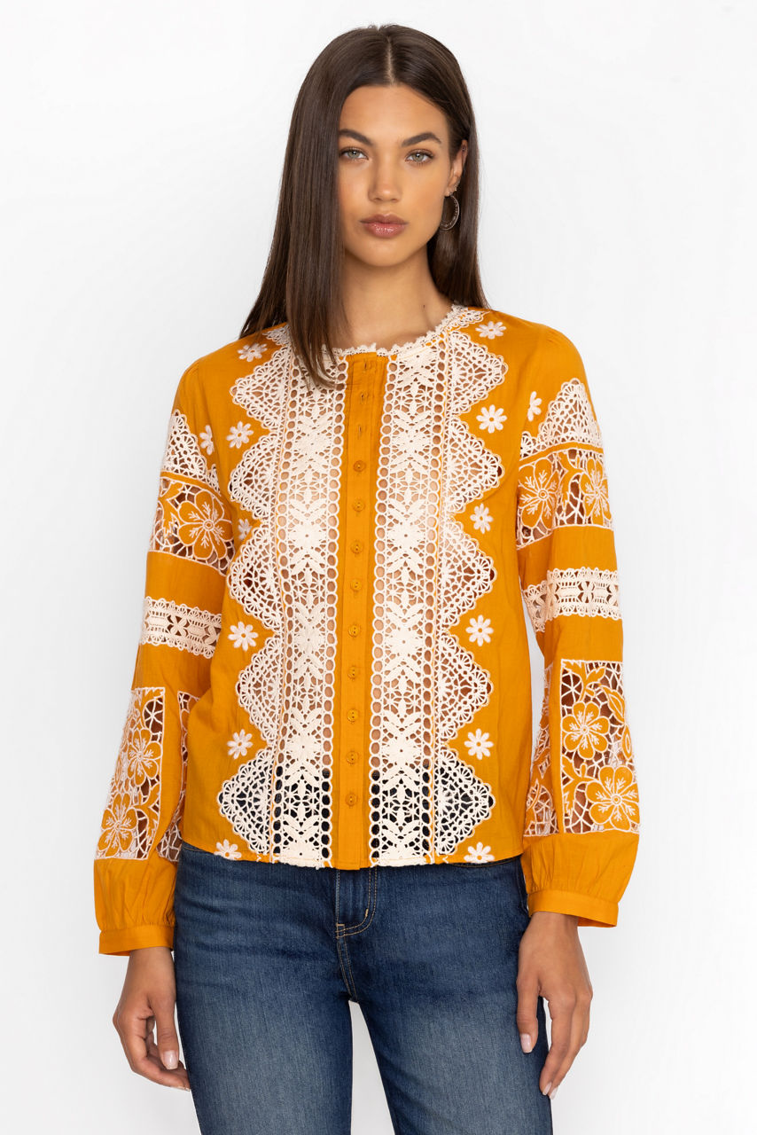Crafted from 100% breathable cotton, the Ronnie Button Down Blouse adds a hint of whimsical charm to a classic silhouette. Featuring a high, rounded neckline and a button front, this slip-lined blouse is embellished with contrasting lace for a uniquely feminine look. Pair with wide-leg pants and polished pumps for a stunning work ensemble.