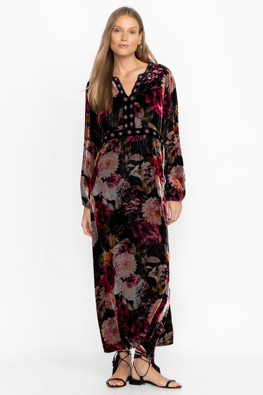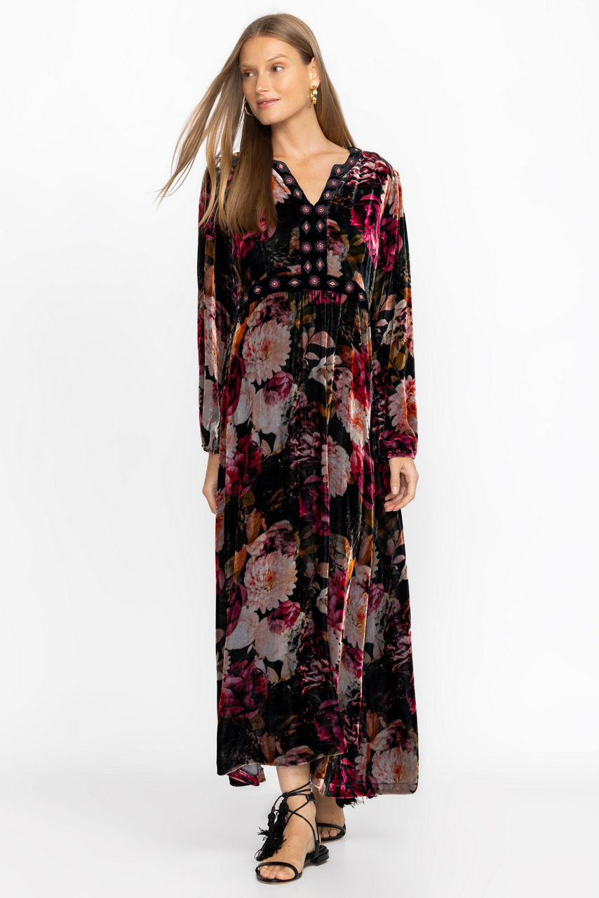 Adding a distinctly feminine flair, the Rosa Velvet Front Notch Dress is saturated with floral bouquets in full bloom. Featuring detailed embroidery, this silk blend velvety dress includes a zipper at the side for easy dressing. Pair with a beaded clutch and rose-colored heels for an upscale dinner date.