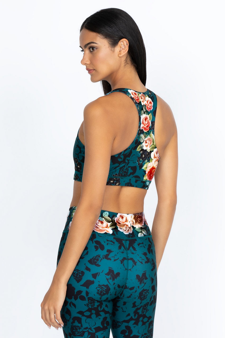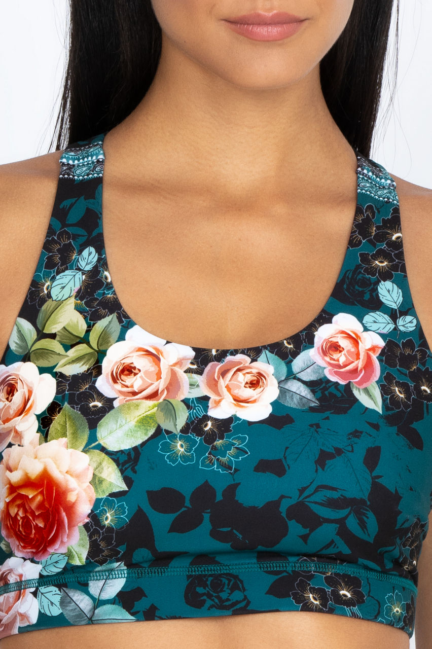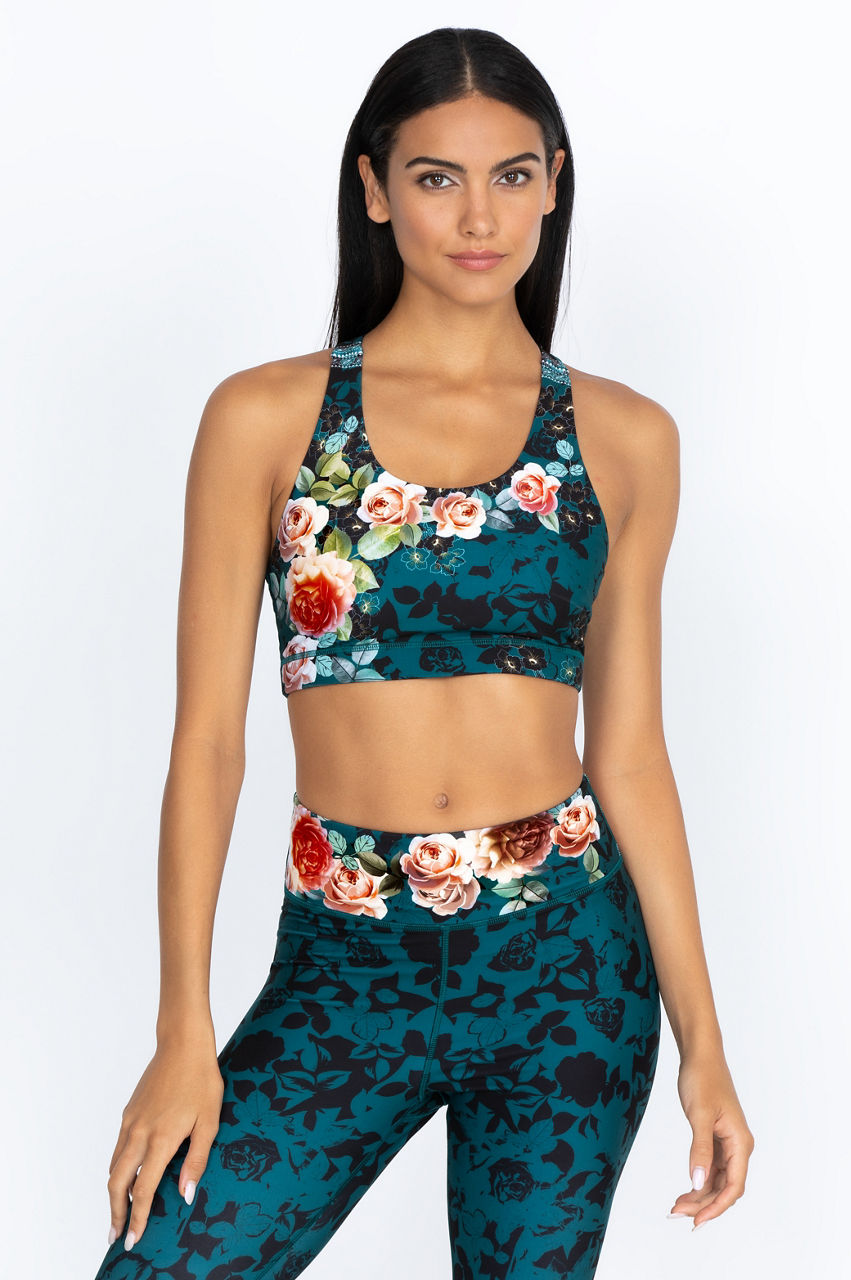 Teal colors and floral accents make the Rosabel Bee Active sports bra an eye-catching choice to sport on a run around the block. The black silhouettes of flowers in bloom and bright pink roses make this racerback bra a memorable staple for any workout wardrobe. Pair with teal, black, or high-energy pink leggings for a burst of color to push you through your routine.