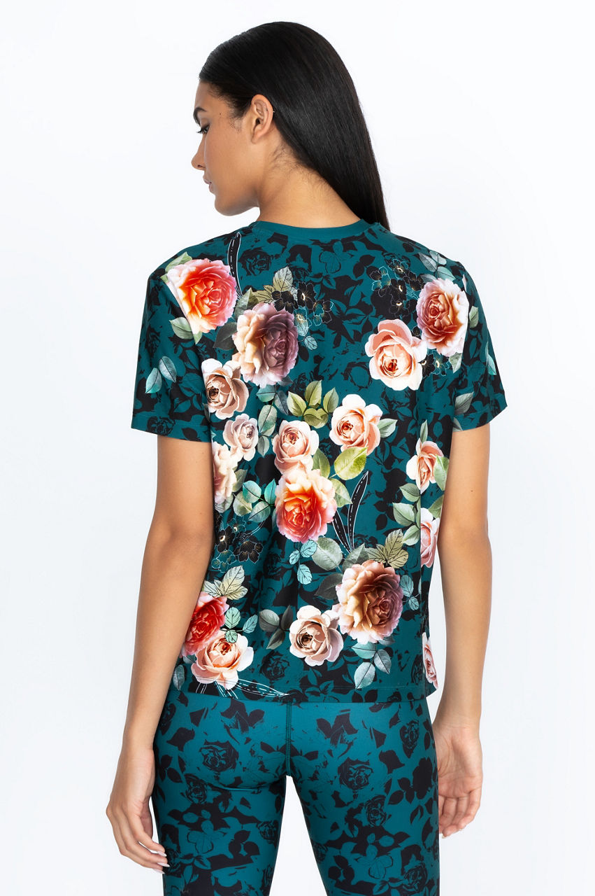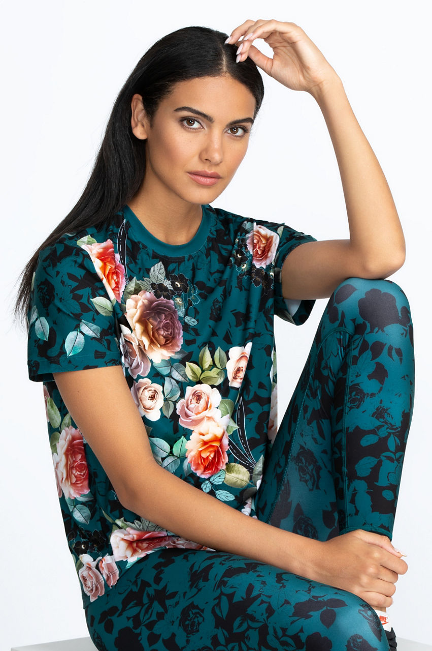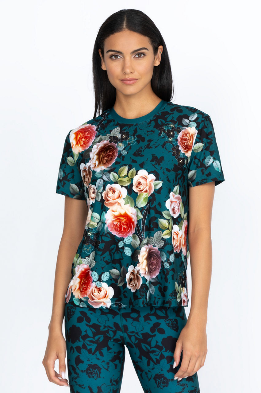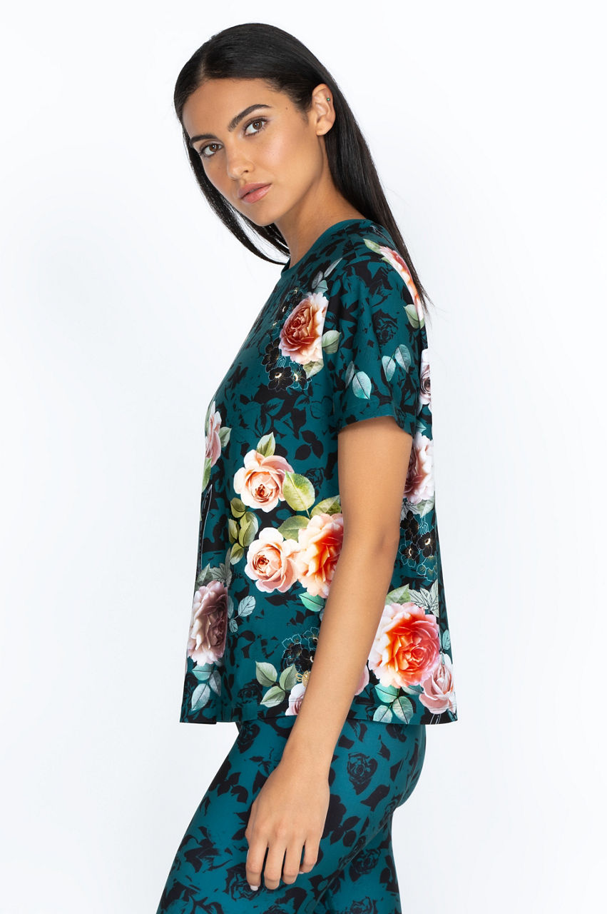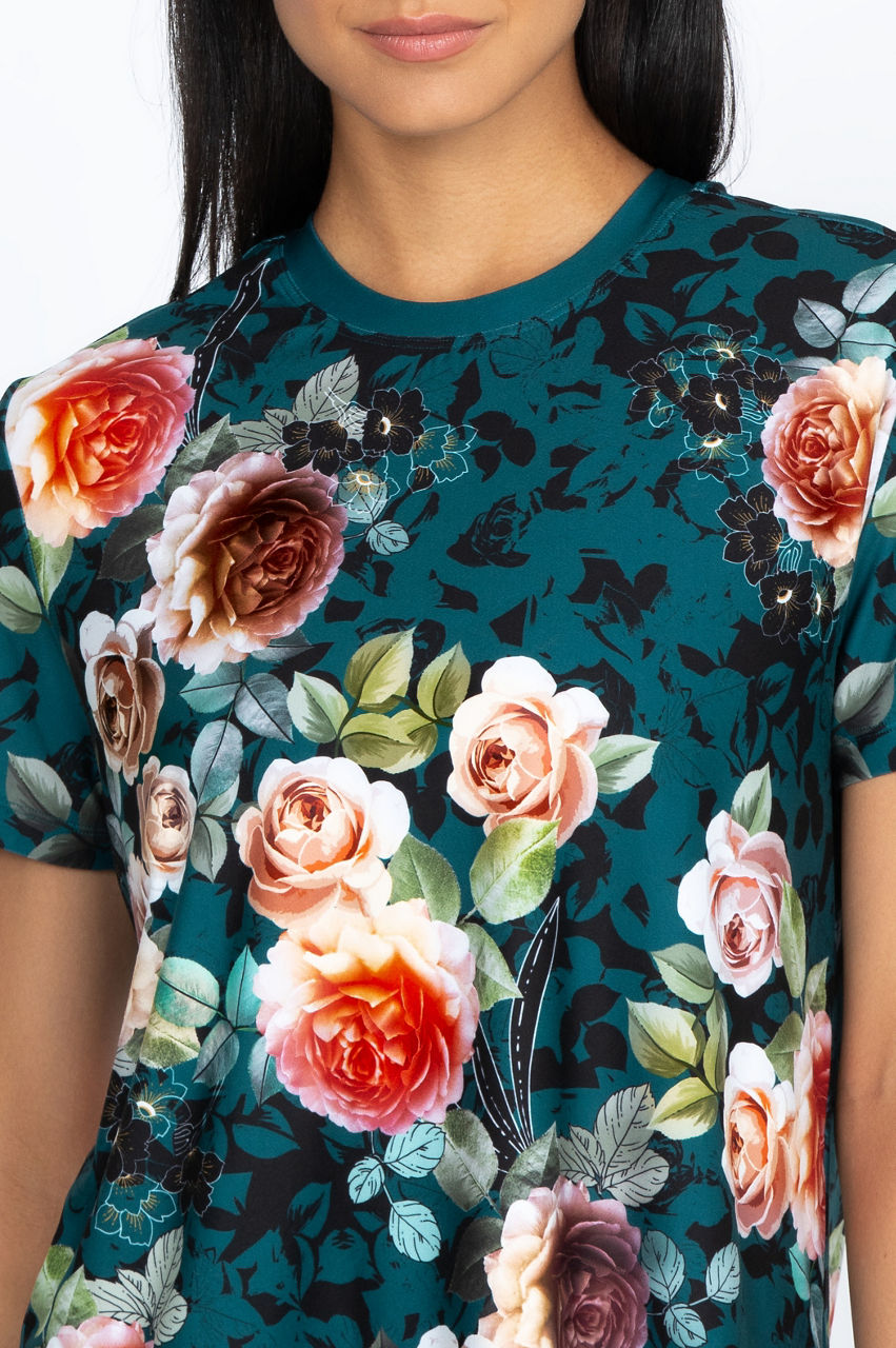 Our Rosabel crew neck tee boasts a stunning teal background of black, floral etchings and a bevy of sun-kissed blooms. Pair this short-sleeved tee with jeans for a casual day of shopping. Take your Rosabel top to the next level with dark black jeans, boots and a jacket for your next dinner out.