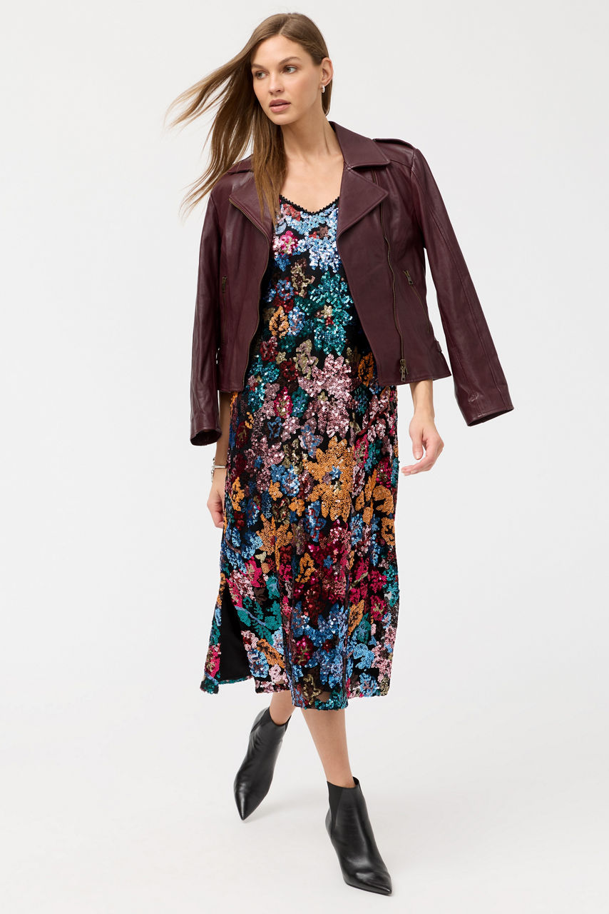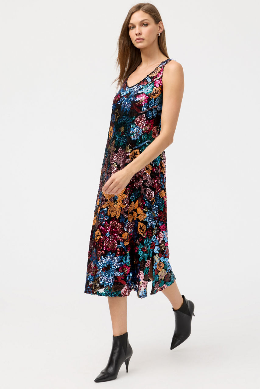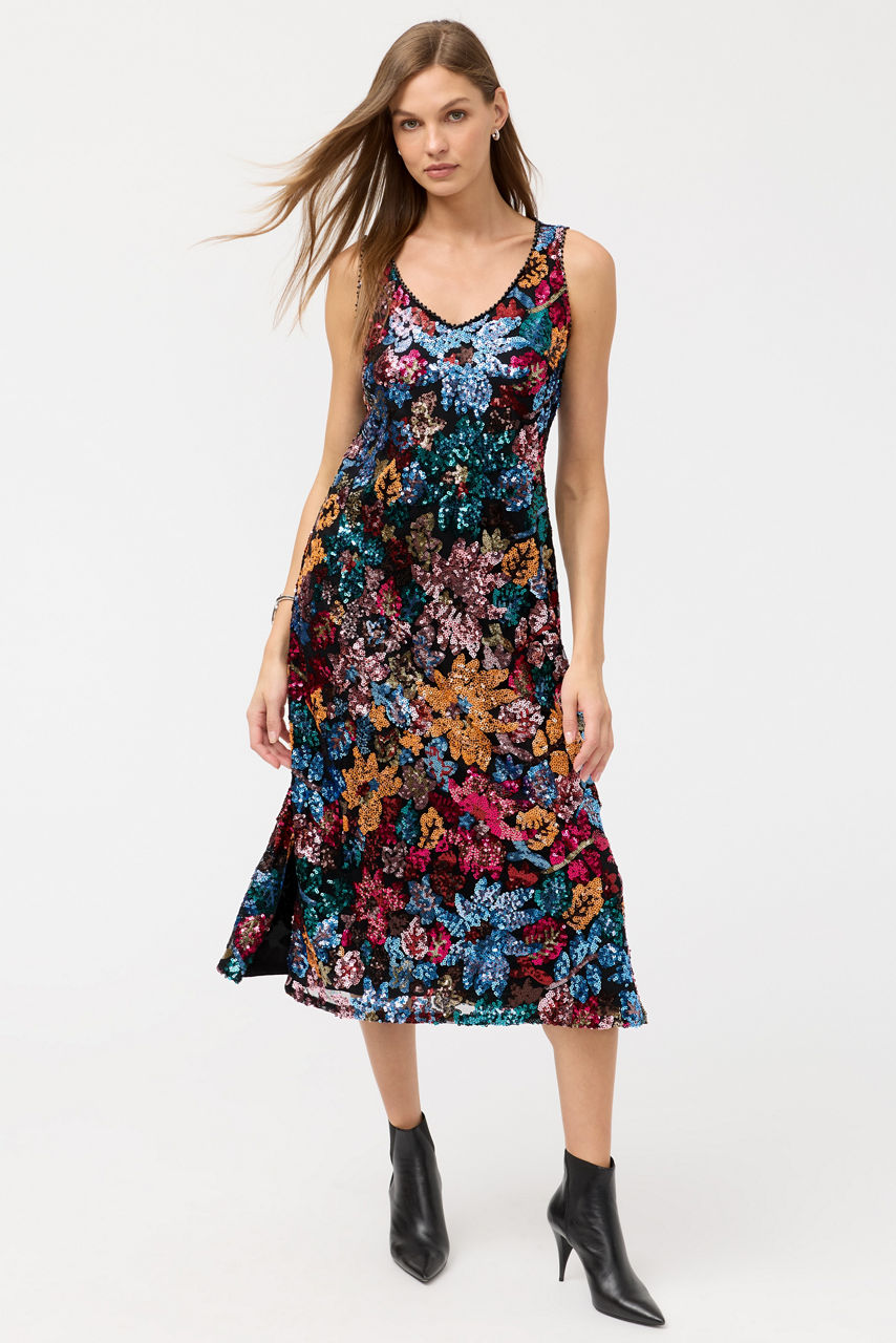 Beautifully embellished with a bold blend of sequin florals in vibrant color, the Rosali Sequin Dress is both elegant and unique. Designed with a V-neckline and wide shoulder straps, this sleeveless dress offers a classic A-line shape enhanced by sparkling florals. Pair with traditional pumps and the Rosali Sequin Clutch for an elevated evening event.