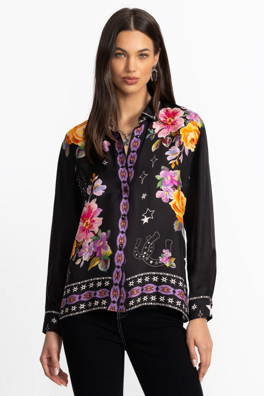 Crafted from a unique silk blend, the Rosalynda Button Down Shirt is embellished with brilliant florals in bold colors. Featuring a classic collared button-front, this blouse is adorned with a contrasting pattern along the button placket and along the hemline. Pair with a sleek pencil skirt and heels for a chic office look.