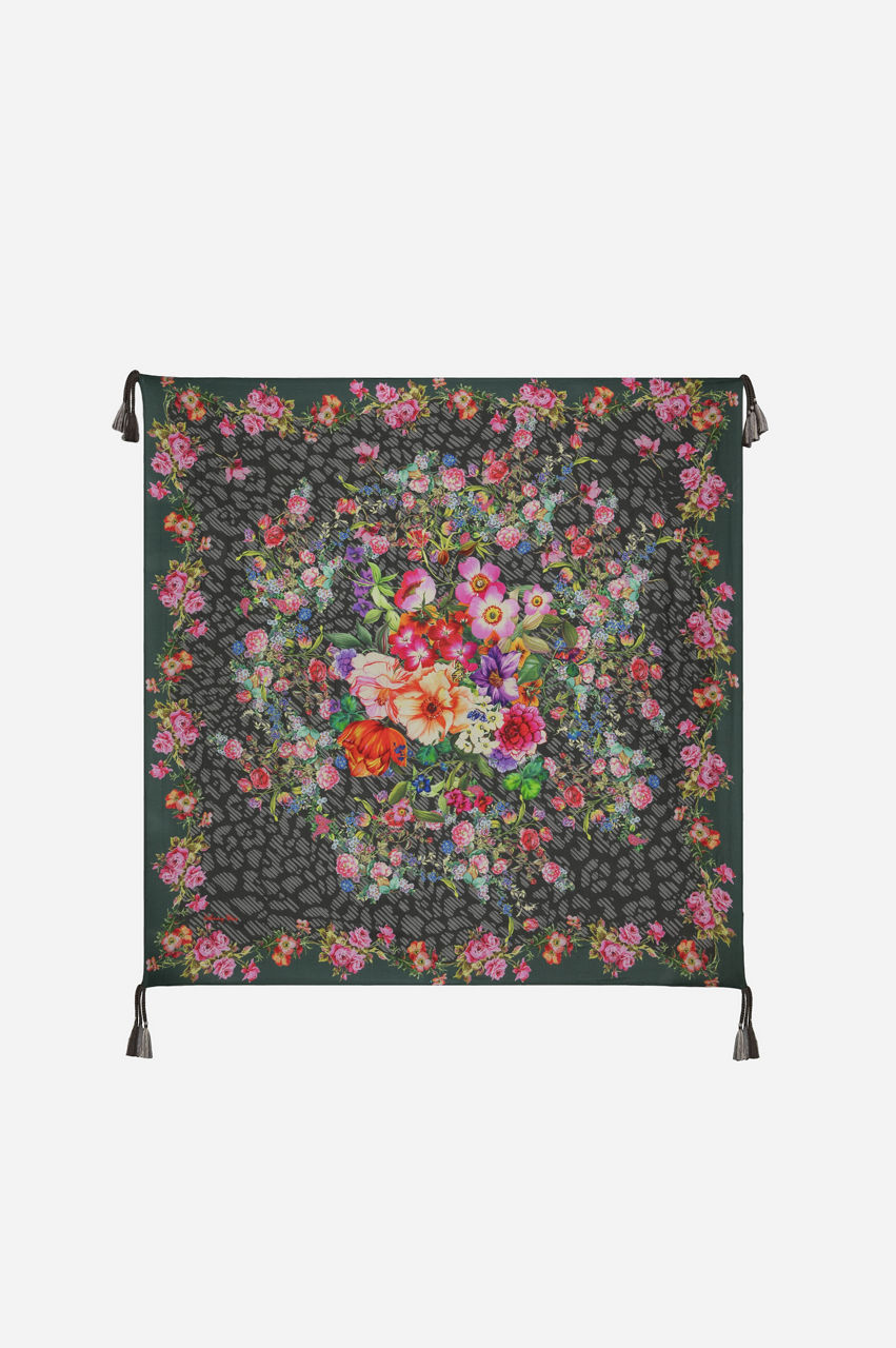 Make any outfit pop with our Rosey Rain Scarf. The beautiful floral motif stands out against the neutral grey background. Complete both casual and sophisticated outfits by pairing it with your favorite v-neck tee and jeans, or with a flowy skirt and blouse.