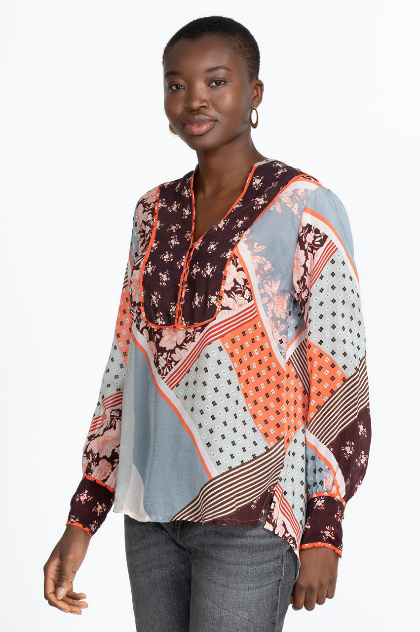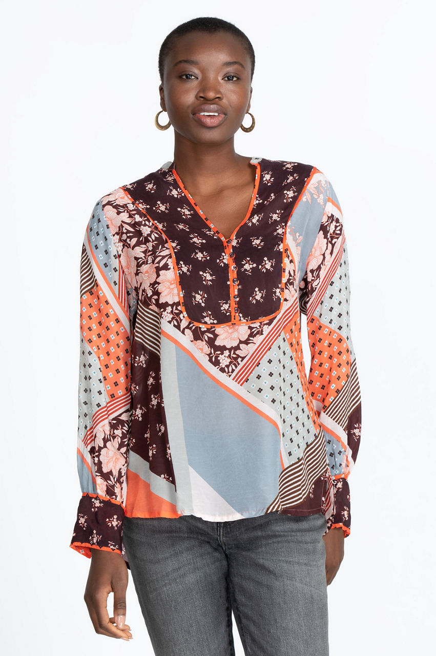 The Roslyn Toni Blouse is an exceptional piece that combines multiple prints for a dashing result. The bishop sleeves and V-neck collar evoke a boho-chic aesthetic, while the patchwork-inspired print creates visual interest. Elevate your favorite jeans with this boho-inspired staple by adding a leather bag, some ankle boots, and layered jewelry.