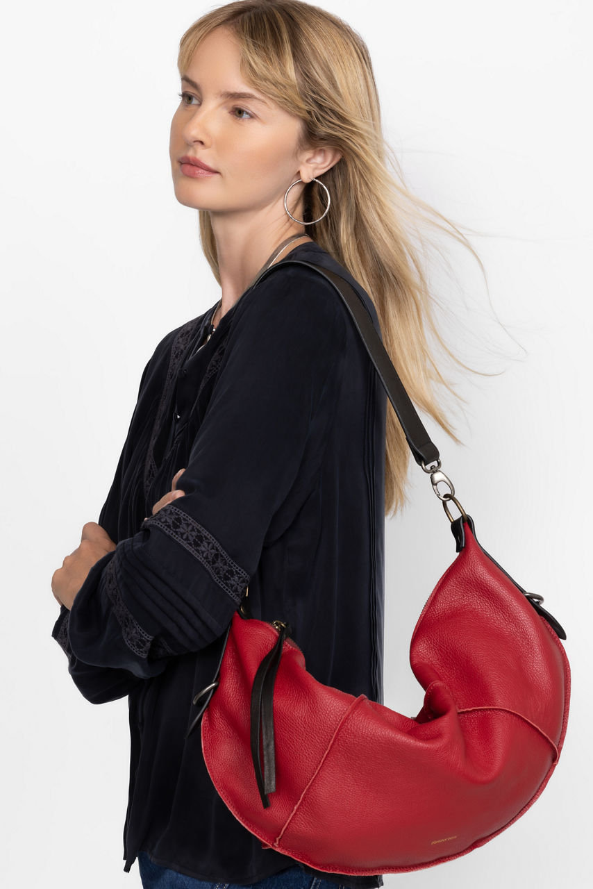 Crafted from 100% leather, the Rossa Italian Leather Raw Edge Faithful Bag is perfect for everyday. Featuring a wide shoulder strap and a unique crescent shape, this bag is finished with raw edges for a broken-in feel. Pair with a silk button-down and classic denim for a polished casual look.