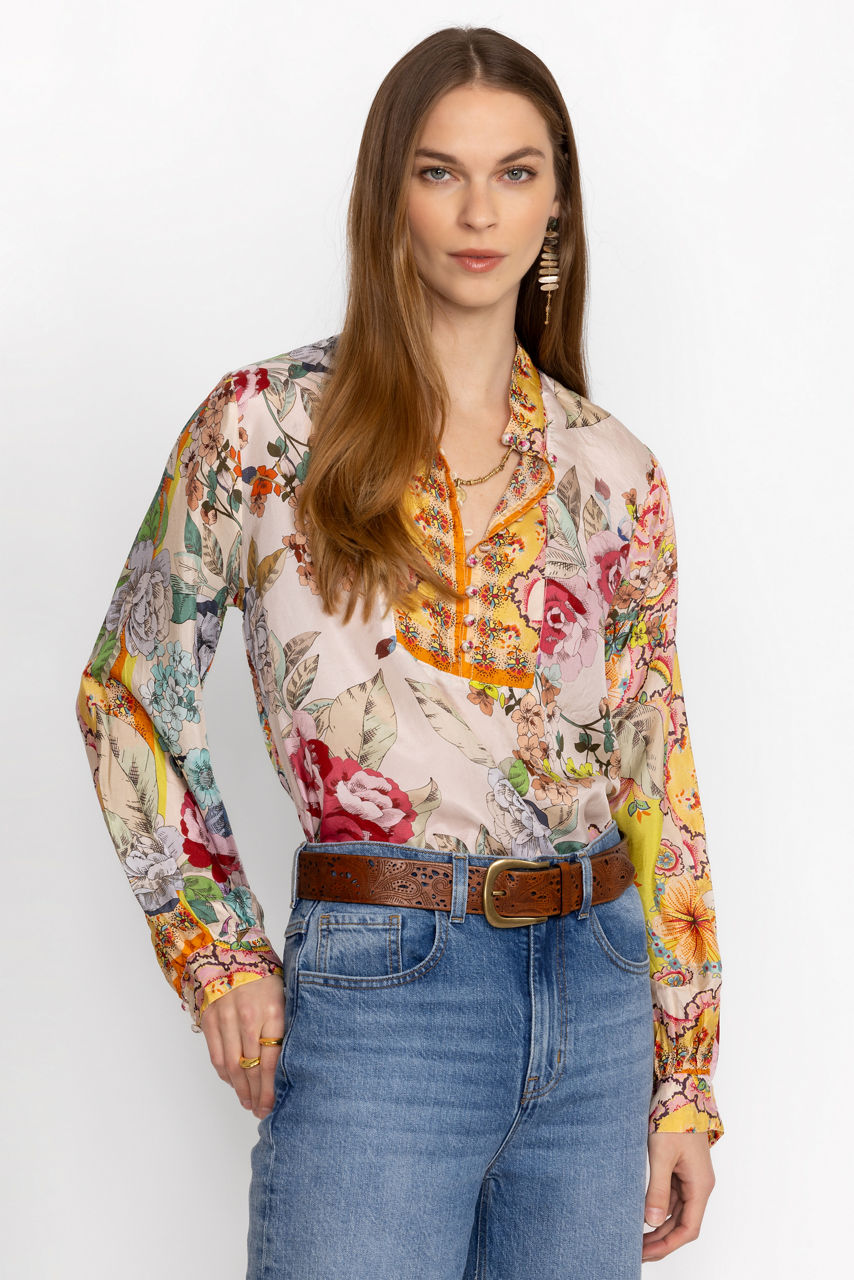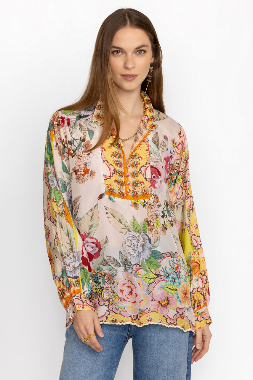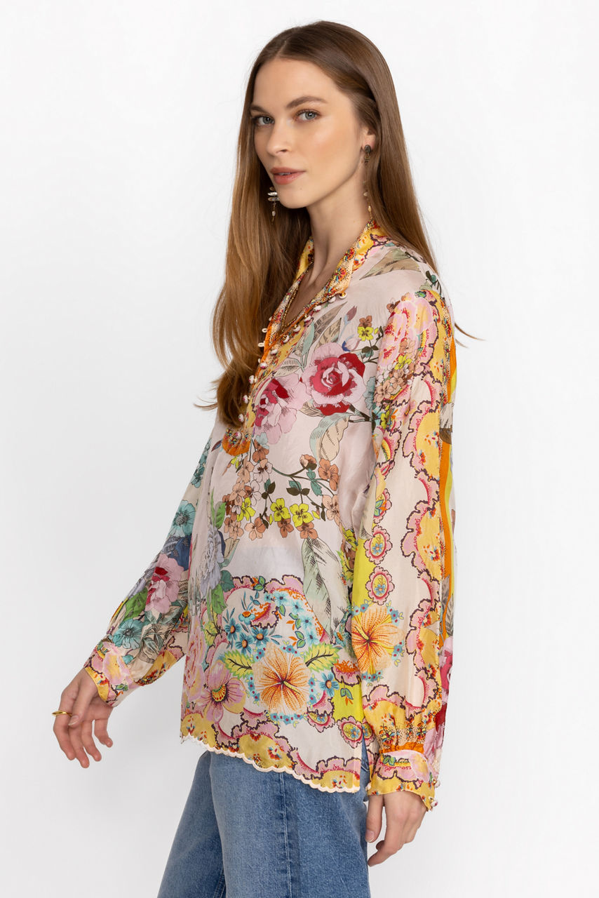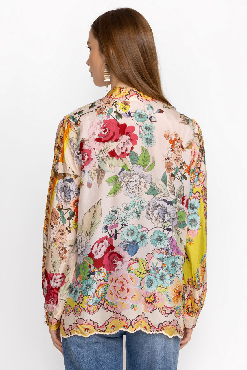 Crafted from 100% sumptuous silk, the Rossy Abby Blouse is defined by brilliant color and ornate pattern. Featuring a button-front high collar adorned with unique flower buttons, this blouse is finished with an eye-catching scalloped hem. Pair with classic black pants and kitten heels for a polished ensemble.