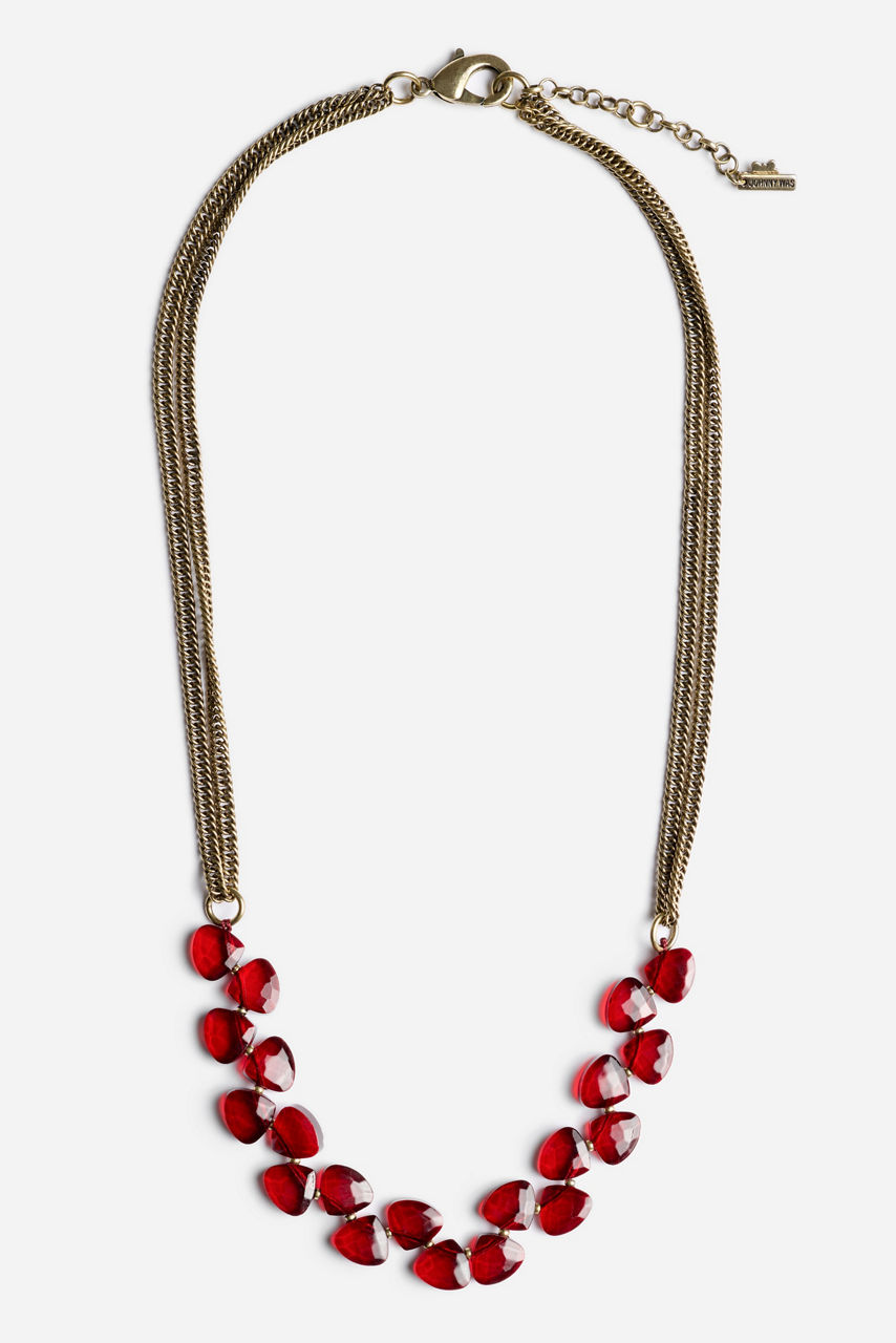 The Ruby Stone Beaded Necklace blends timeless sophistication and movement with a polished metal chain adorned with deep red stones. Each stone is artfully suspended to sway freely, adding subtle shimmer and dynamic elegance. Secured with a clasp closure, it pairs perfectly with the Ruby Stone Beaded Bracelet for a coordinated jewelry look.