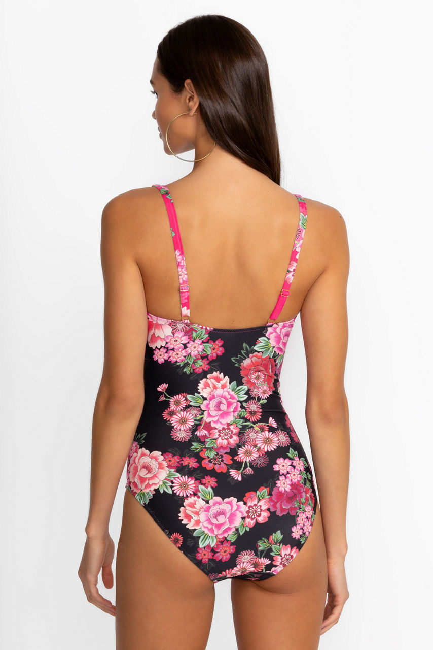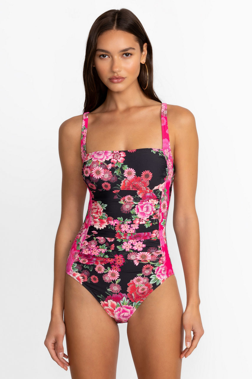 Flawless and feminine, the Blum Ruched One Piece is embellished with rich florals and bold color. Featuring a square neckline and adjustable shoulder straps, this vibrant swimsuit is finished with contrasting panels at the sides and a ruched center panel for an enhanced silhouette. Pair with V-Neck Kaftan and slides for a posh ensemble that easily goes from brunch to poolside.