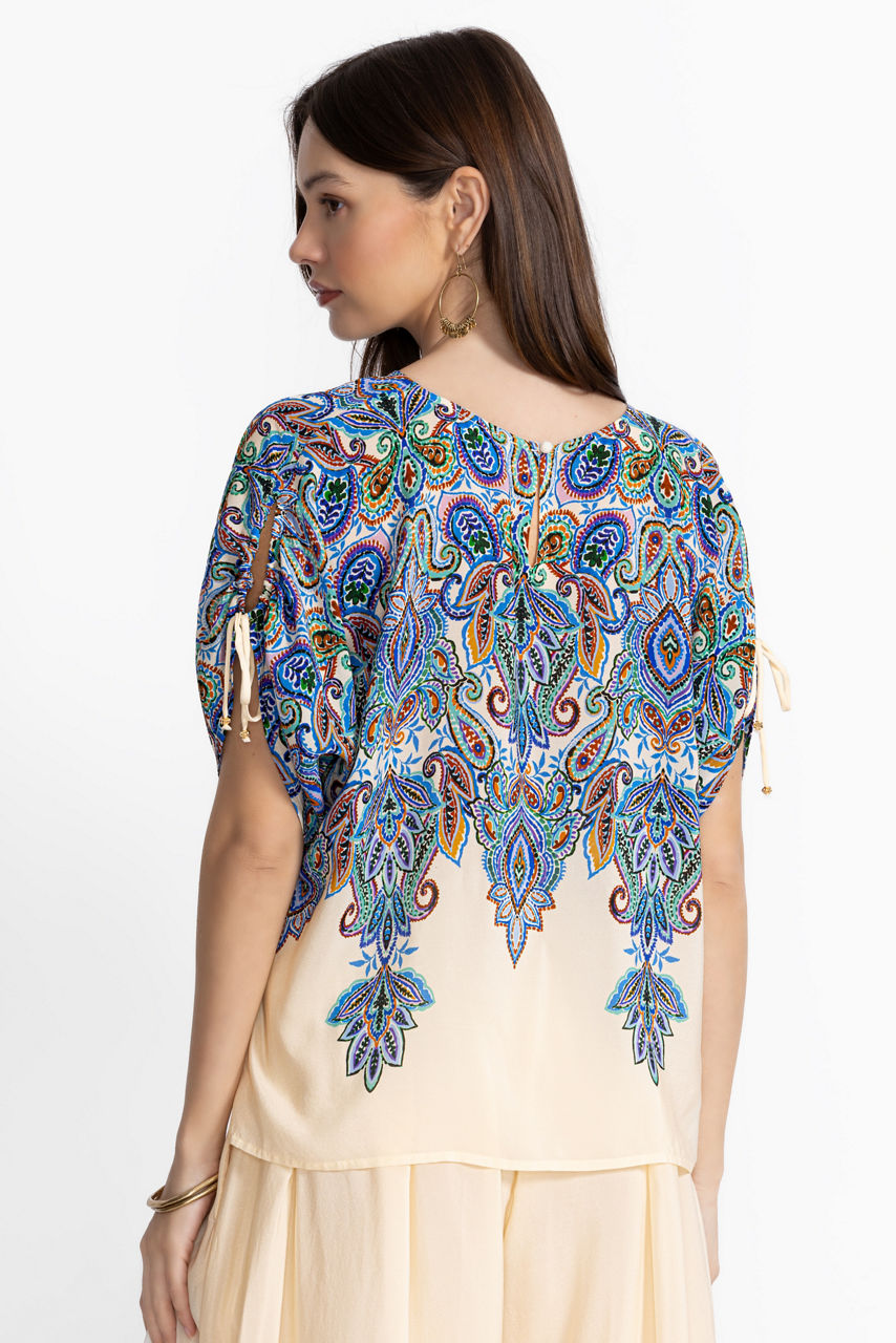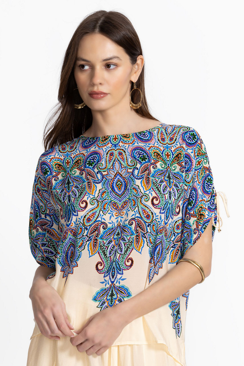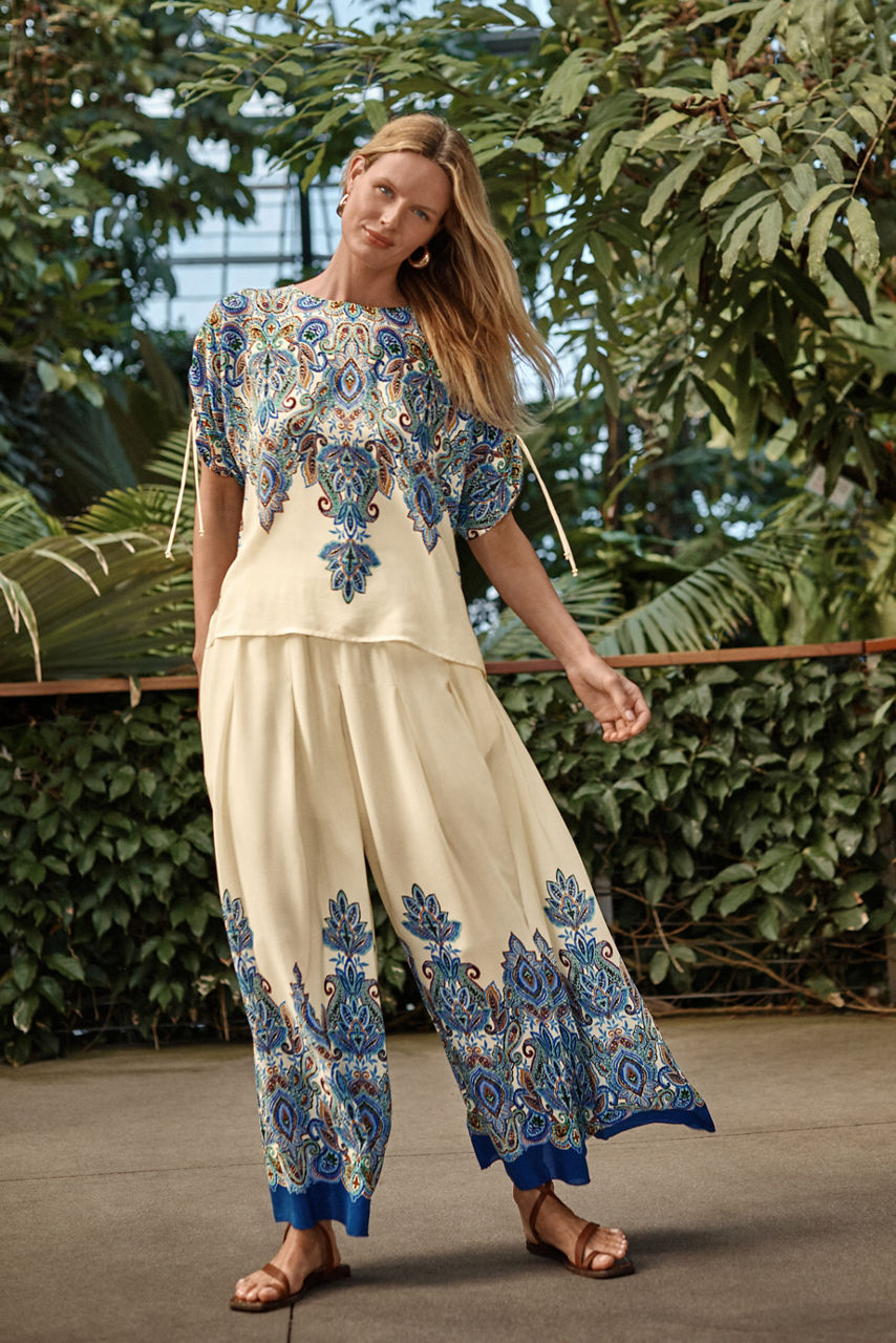 Crafted from 100% sumptuous silk, the Ruched Sleeve Blouse is embellished with an ornate scrolling pattern filled with vibrant color. Featuring a rounded neckline with a keyhole at the back, this relaxed-fit blouse is finished with ruched detailing at the sleeves. Pair with palazzo pants and neutral sandals for a comfortable ensemble with elevated style.