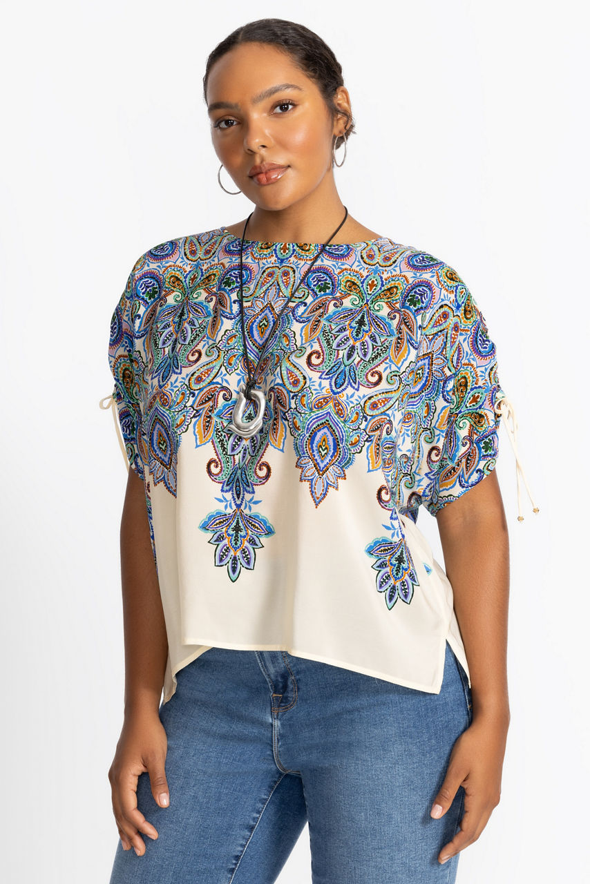 Crafted from 100% sumptuous silk, the Ruched Sleeve Blouse is embellished with an ornate scrolling pattern filled with vibrant color. Featuring a rounded neckline with a keyhole at the back, this relaxed-fit blouse is finished with ruched detailing at the sleeves. Pair with palazzo pants and neutral sandals for a comfortable ensemble with elevated style.