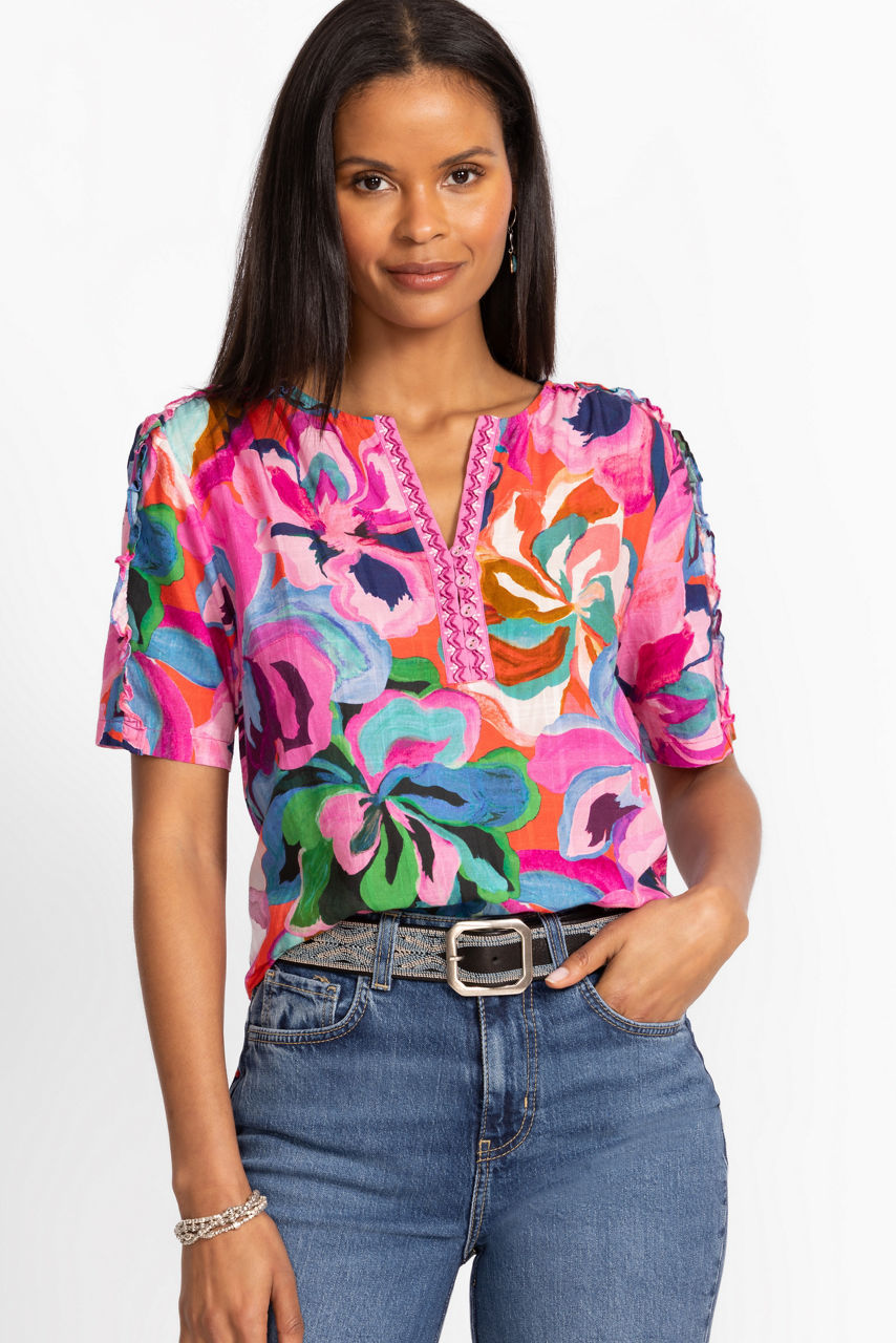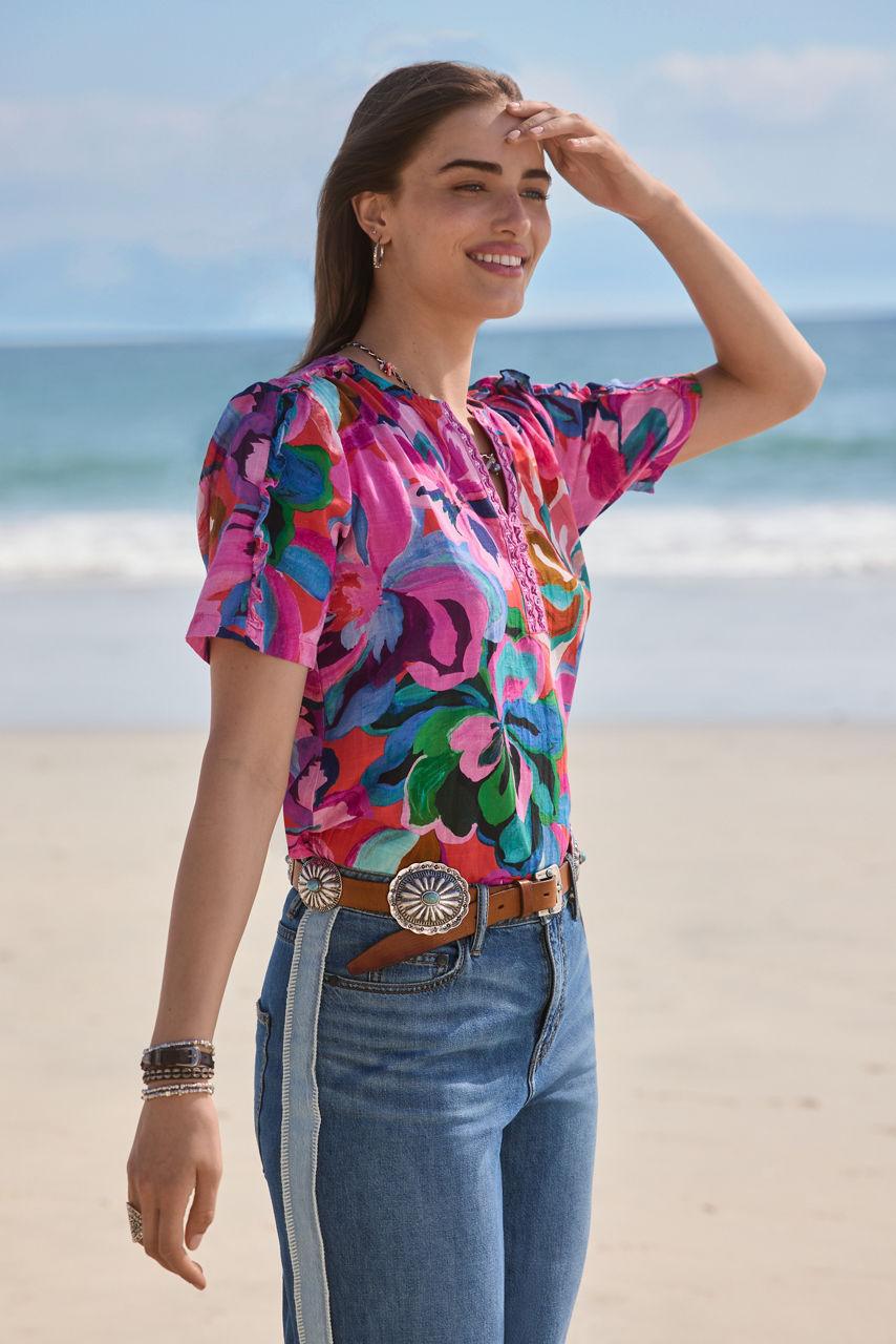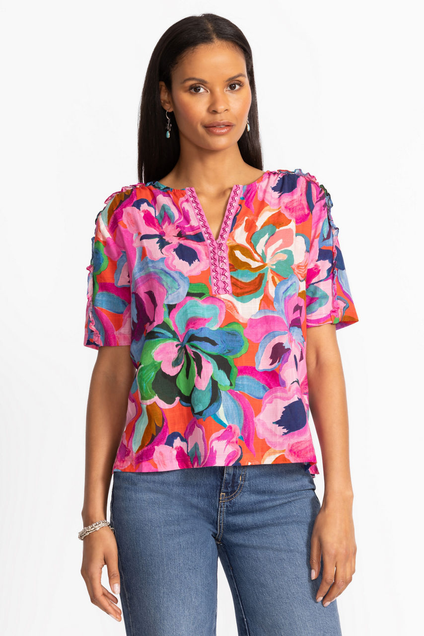 Beautifully adorned with vibrant color and bold patterns, the Ruffle Seam Top is crafted from 100% breathable cotton. Featuring a split V-neckline with an embroidered placket, this beautiful top is finished with a ruffle detail at the neckline and shoulder seams. Pair with dark-wash denim and colorful flats for casual days.