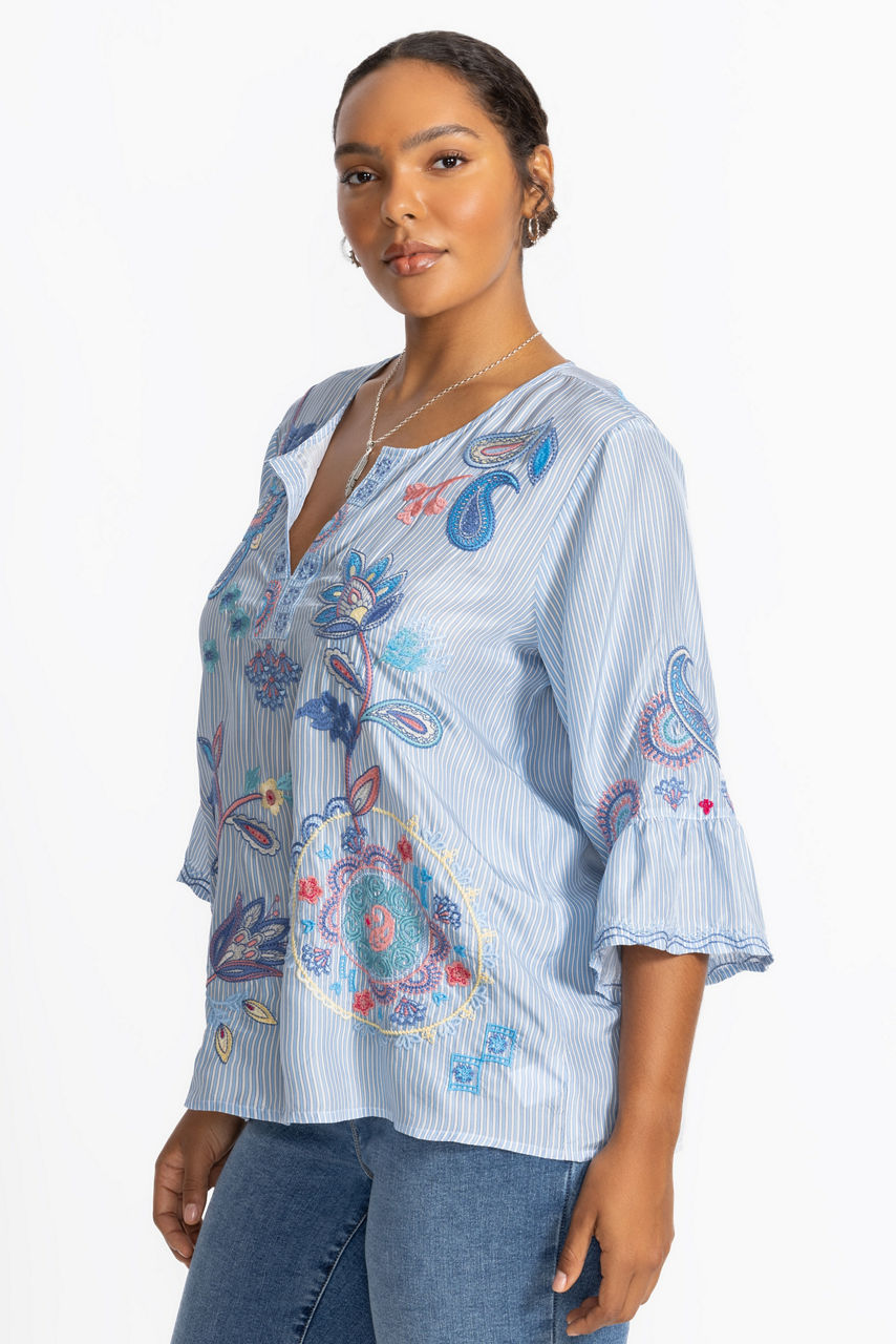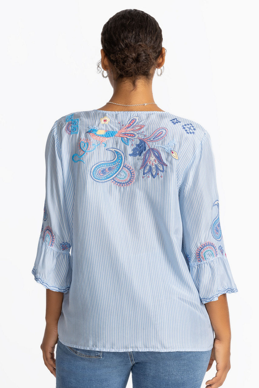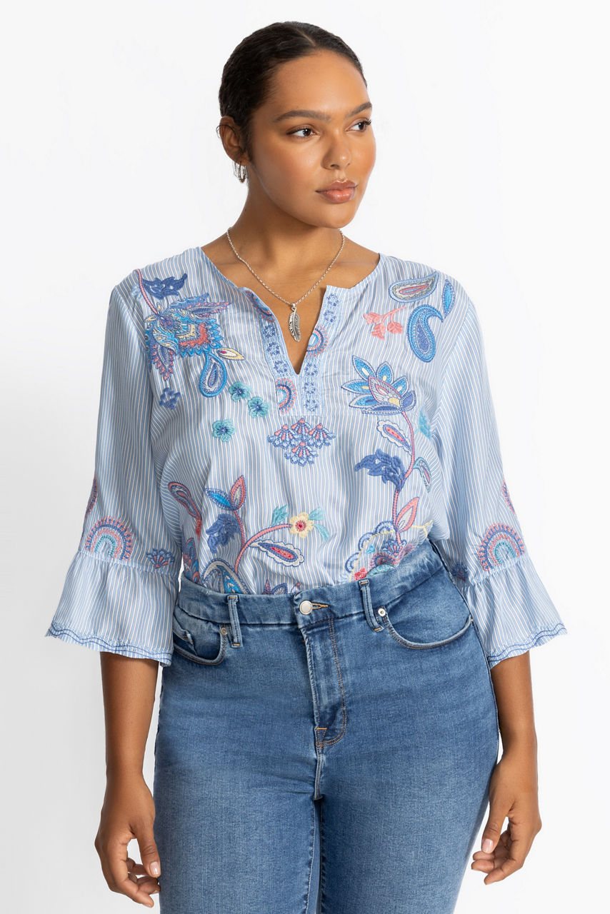 Beautifully adorned with rich color and intricate patterns, the Ruffle Sleeve Blouse is embellished with thoughtfully placed embroidered details. Crafted from 100% luxurious silk, this blouse features a split V-neckline and 3/4 sleeves with a ruffled trim. Pair with relaxed-fit denim and fashion sneakers for a casual look perfect for the weekend.