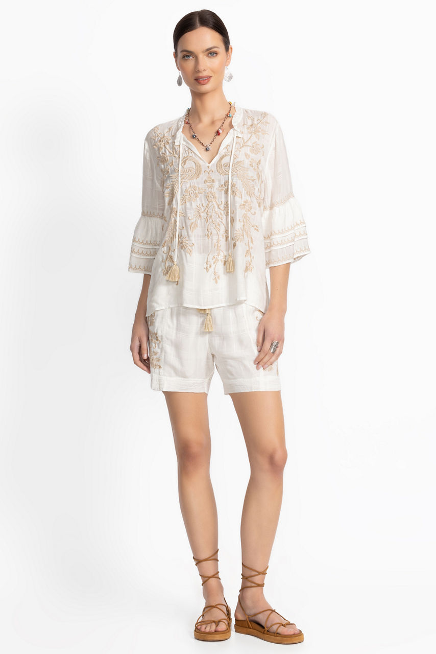 The Ruffle Sleeve Blouse is expertly embroidered with a stunning tone-on-tone floral design for a rich textured look. Featuring a split V-neckline finished with a tie and tassels, this relaxed-fit blouse is finished with dramatic tiered sleeves. Pair with white linen pants and casual sandals for a polished weekend ensemble.