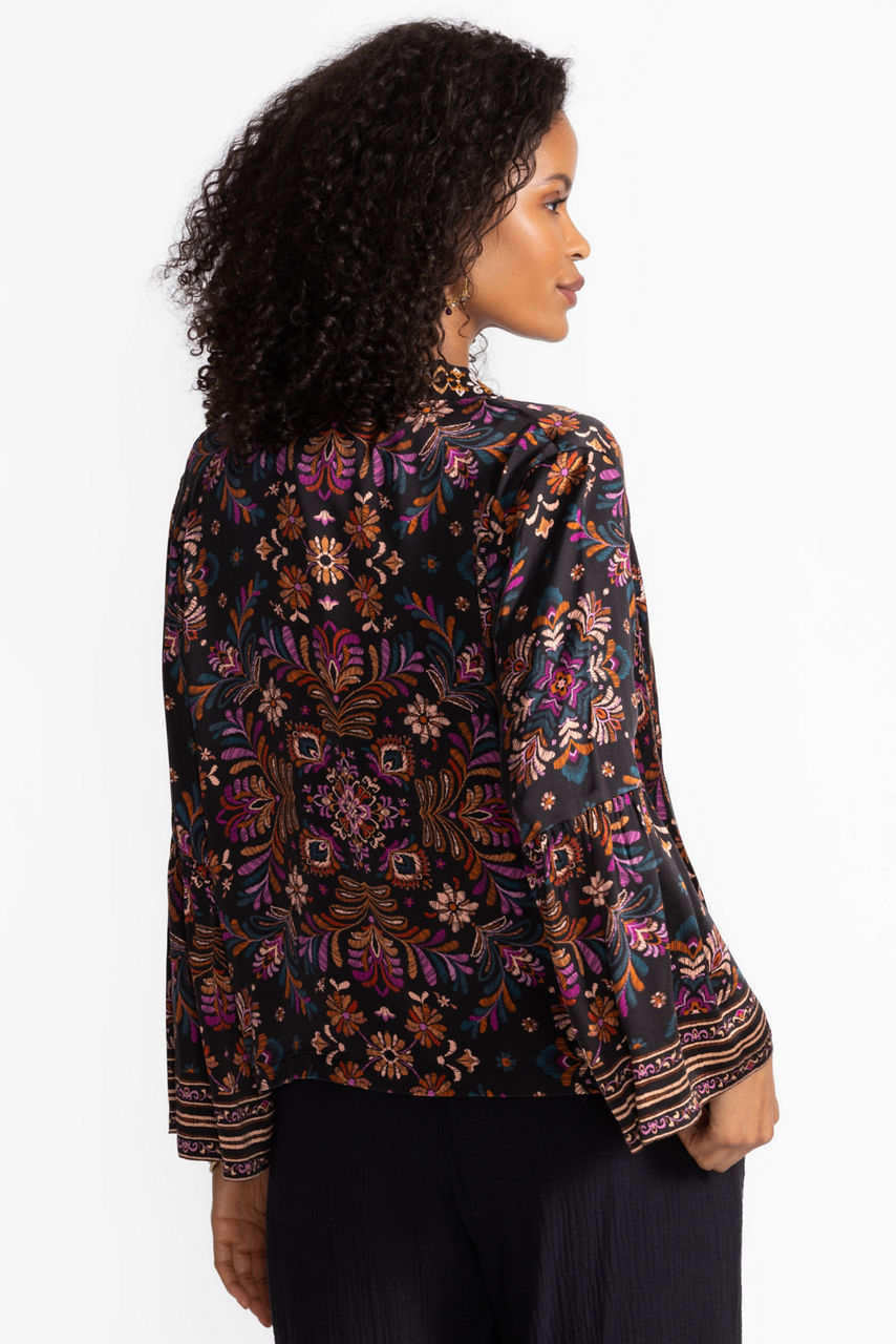 Crafted from a silk blend with a hint of stretch, the Brandi Ruffle Sleeve Bolero is embellished with vibrant color and a mesmerizing pattern. Featuring an open-front and ruffled sleeves, this eye-catching jacket is finished with intricate embroidered detailing. Layer over a silk cami and pair with a full skirt for a bold evening look perfect for a night out.