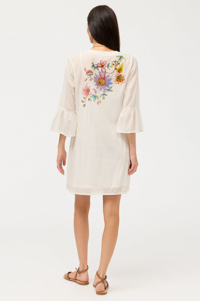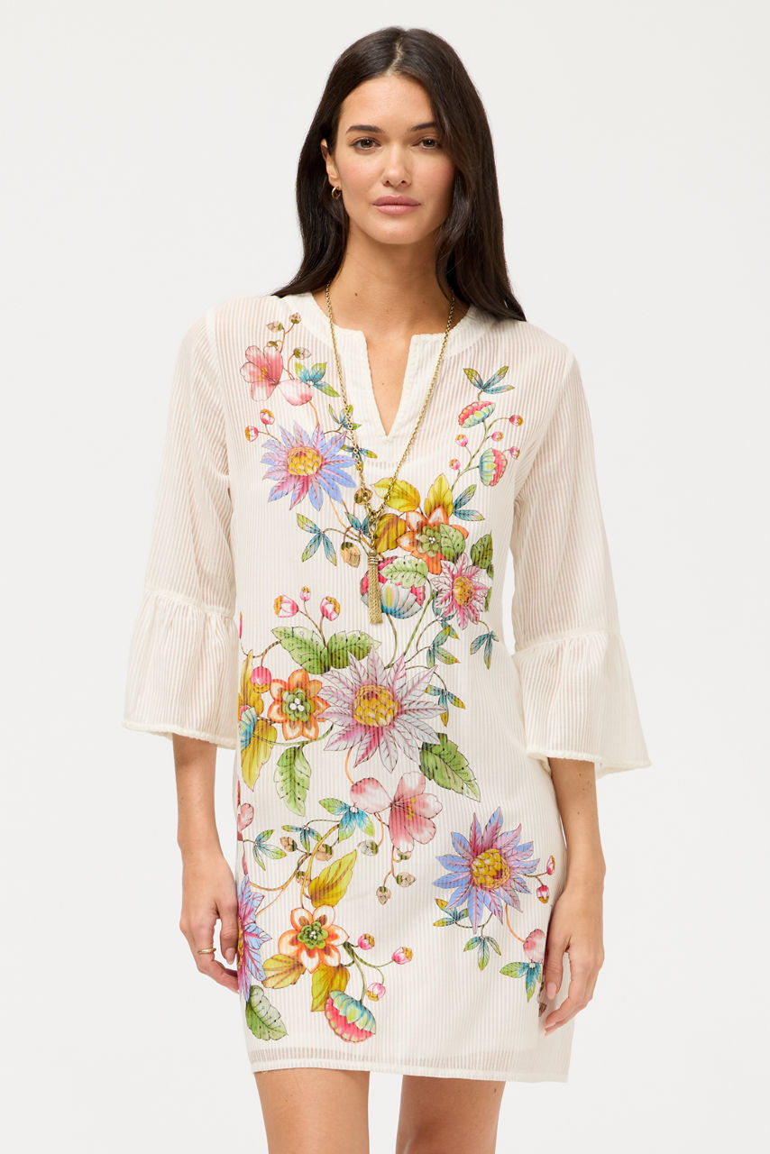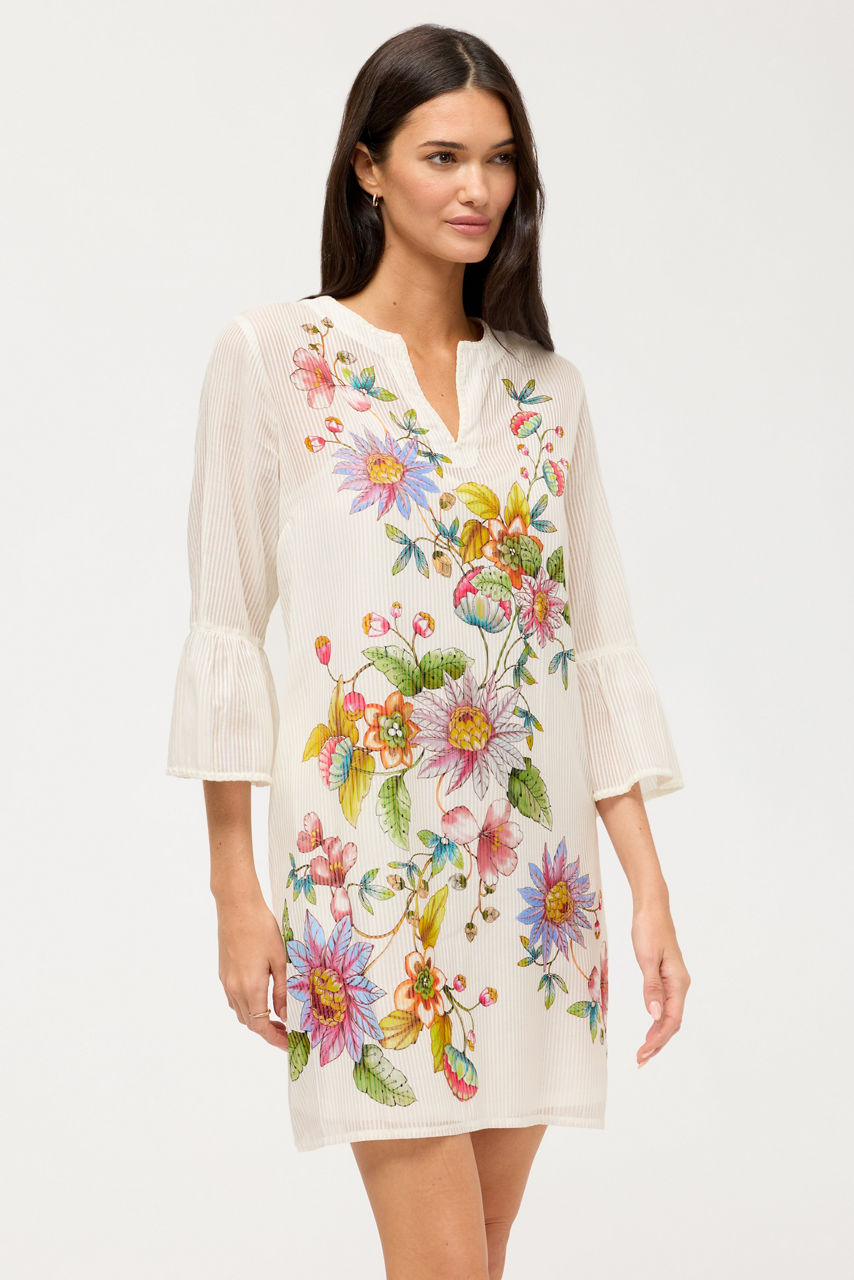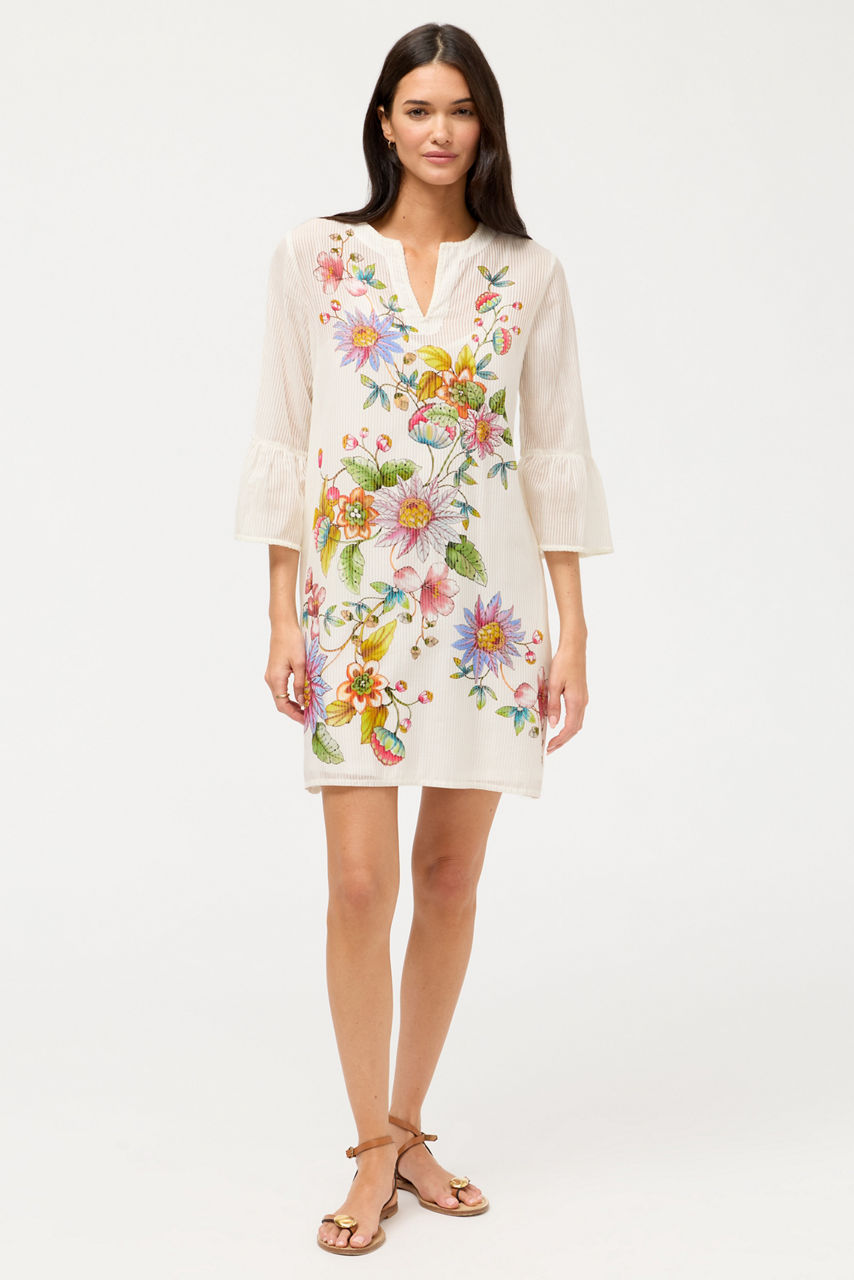 Crafted from a unique cotton and silk blend, the Orlaya Ruffle Sleeve Dress is embellished with vibrant printed floral detailing. Featuring a split V-neckline accented with embroidery, this slip-lined shift dress is finished with ruffles at the sleeves. Pair with colorful sandals and a wide-brim sun hat for a resort-inspired look.