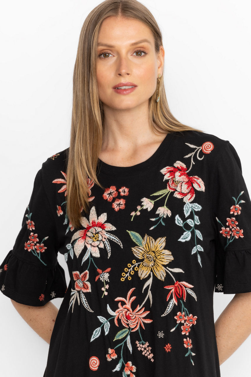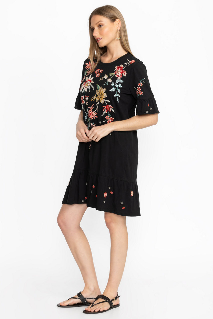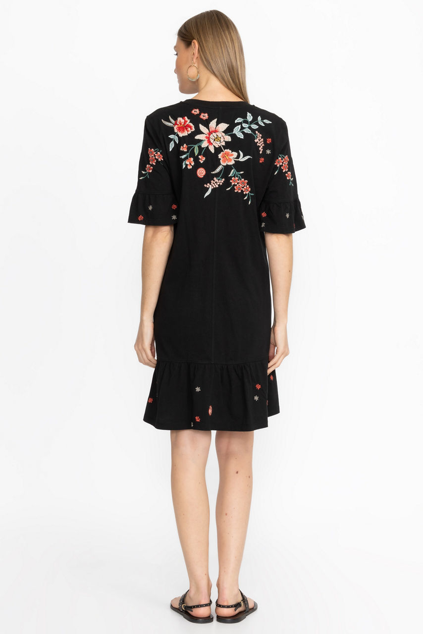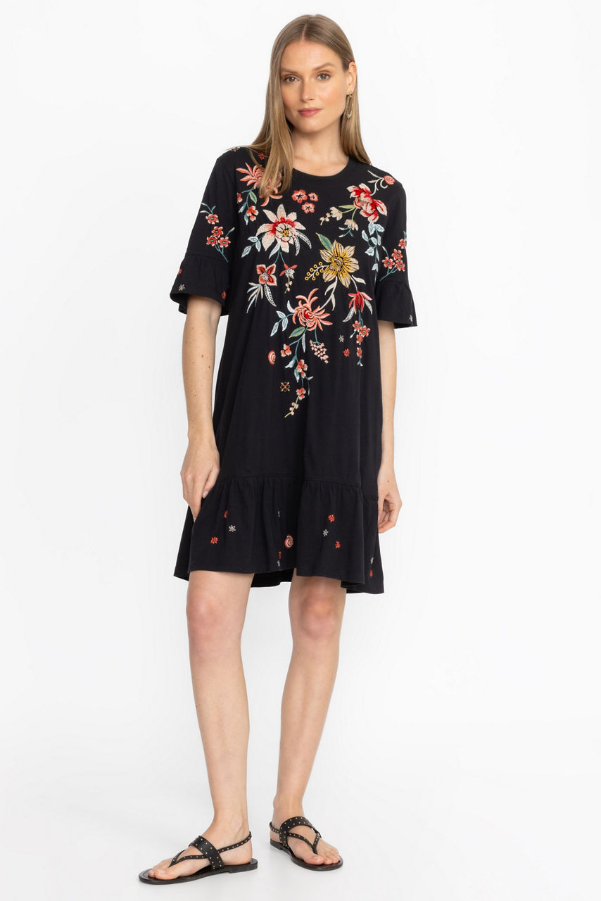 Embodying casual comfort with a modern twist, the Ruffle Sleeve Knit Dress is embellished with colorful floral embroidery. Crafted from 100% cotton and featuring a crew neckline, this easy drop-waist dress is finished with ruffling at the sleeve and hemline. Pair with comfortable shoes and a raffia crossbody bag for a day of sightseeing.