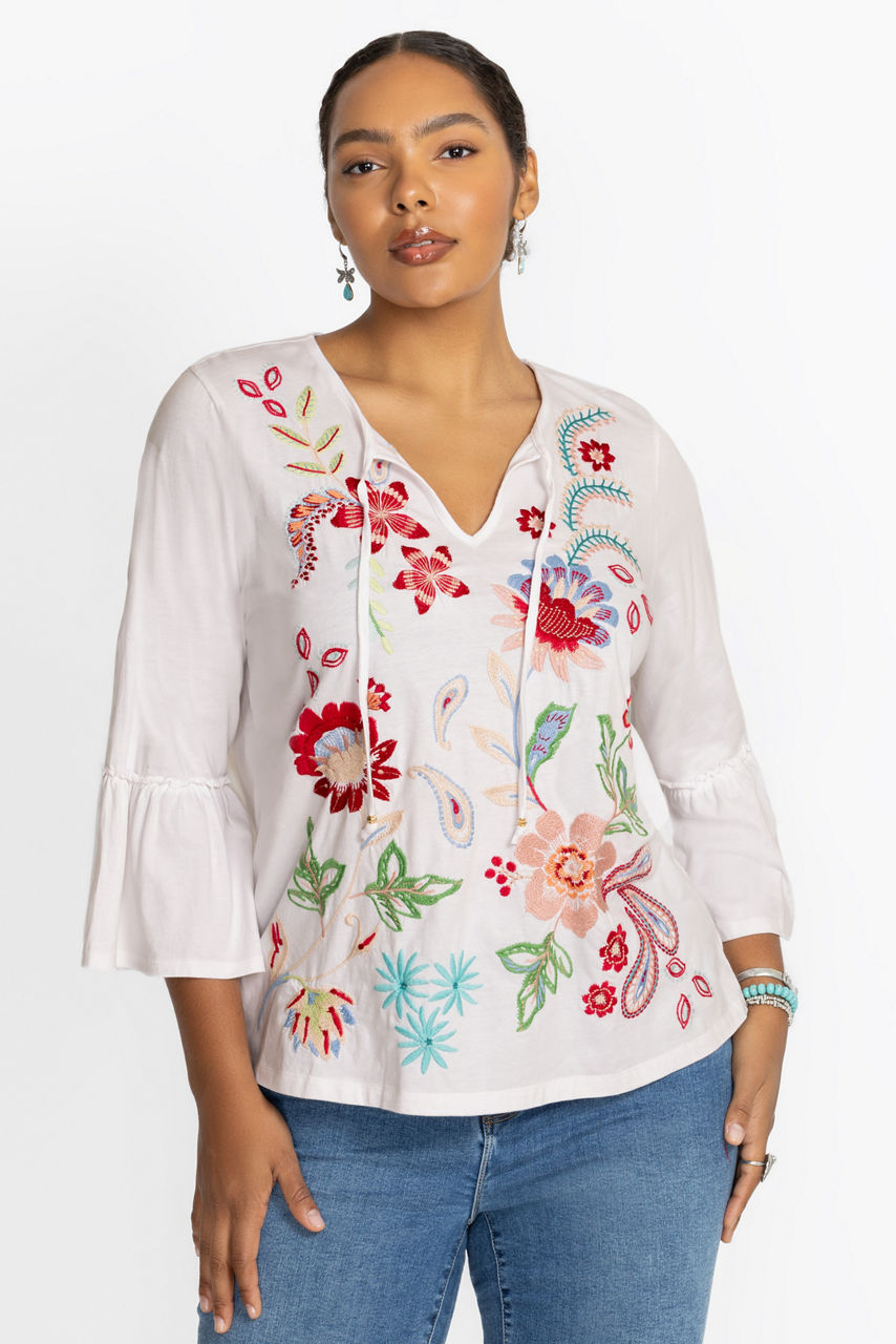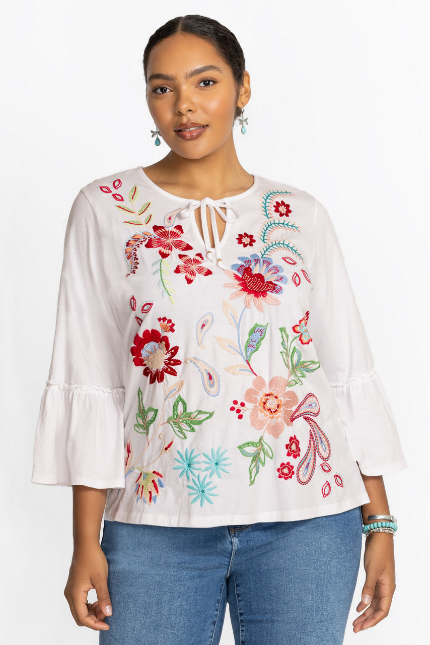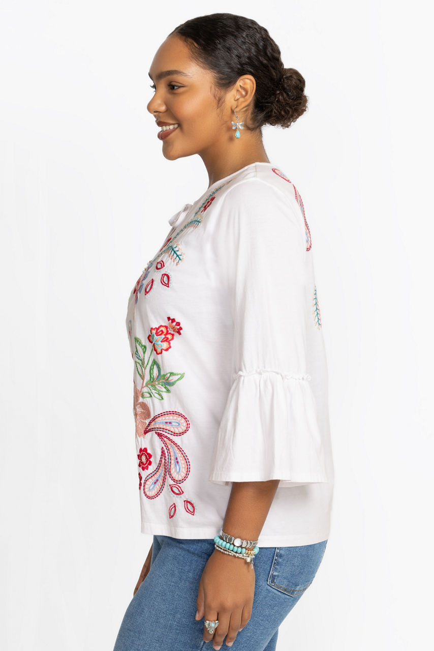 Offering a modern take on a classic long sleeve tee, the Freyde Ruffle Sleeve T-Shirt is crafted from 100% cotton. Designed with a split V-neckline adorned with decorative tassels, this tee is embellished with bold embroidered detailing and is finished with delicate ruffling at the sleeves. Pair with a denim skirt and trendy flats for a polished weekend look.