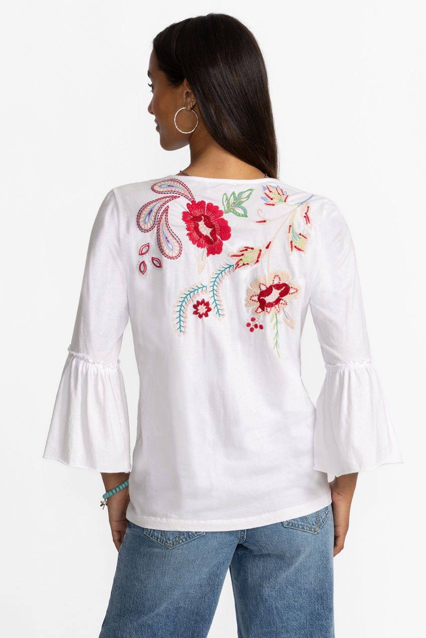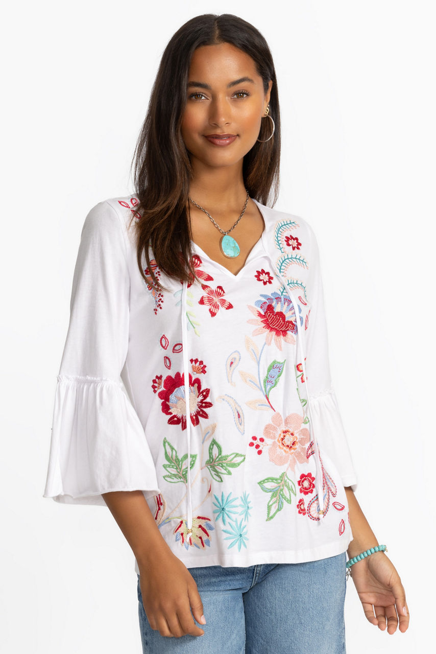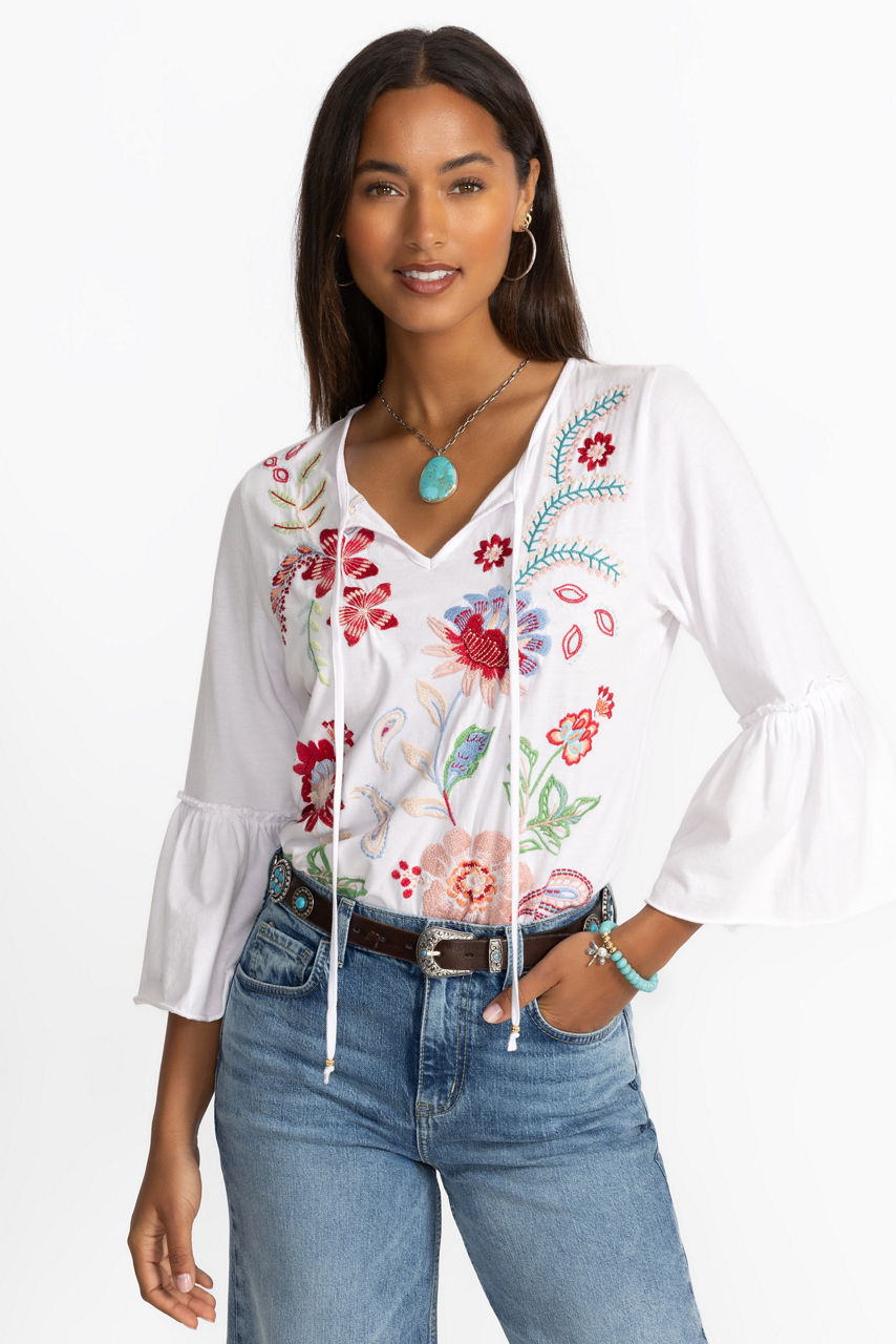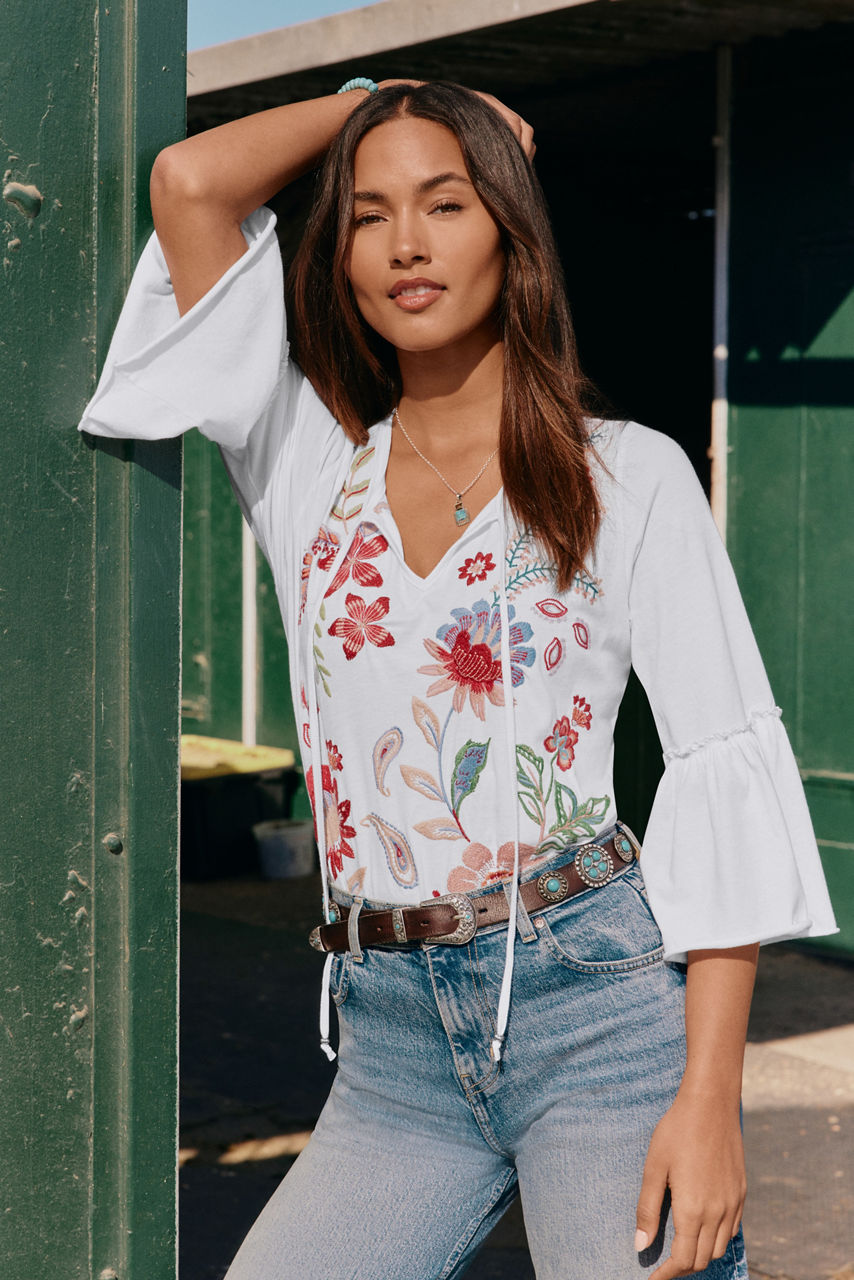 Offering a modern take on a classic long sleeve tee, the Freyde Ruffle Sleeve T-Shirt is crafted from 100% cotton. Designed with a split V-neckline adorned with decorative tassels, this tee is embellished with bold embroidered detailing and is finished with delicate ruffling at the sleeves. Pair with a denim skirt and trendy flats for a polished weekend look.