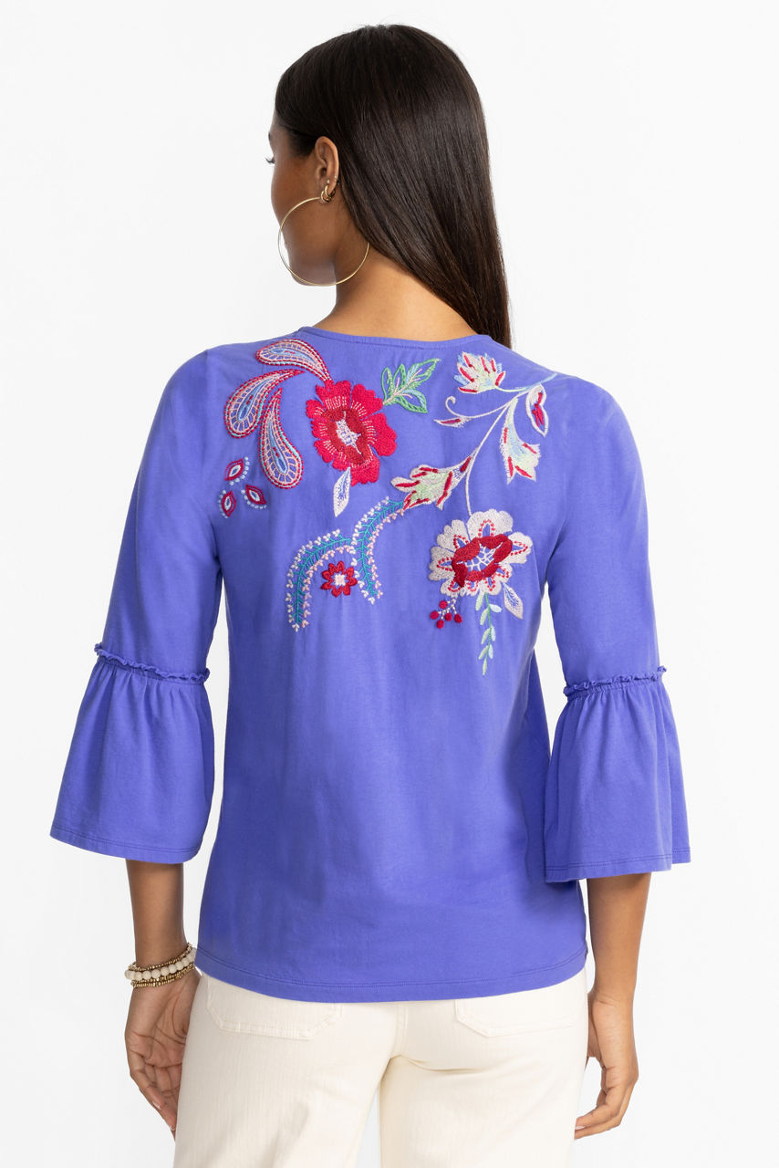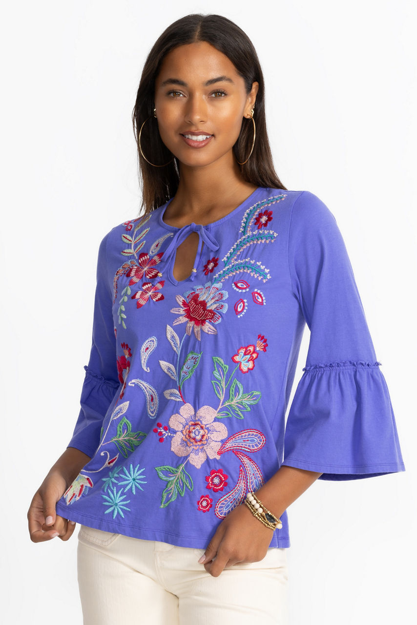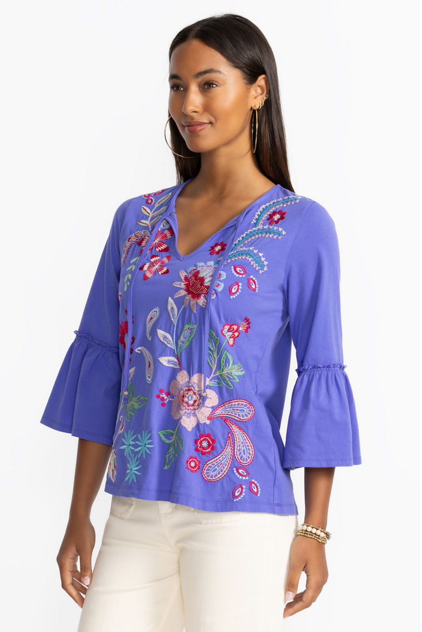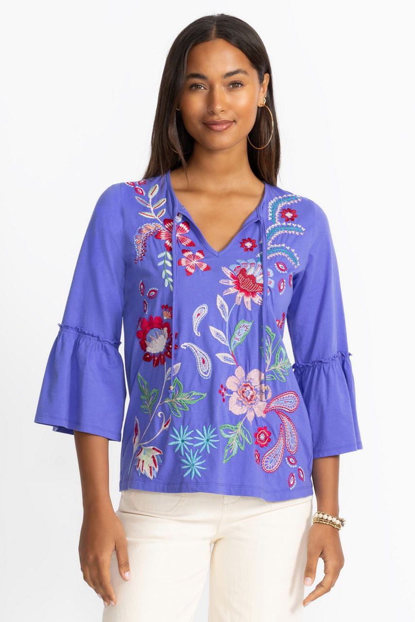 Offering a modern take on a classic long sleeve tee, the Freyde Ruffle Sleeve T-Shirt is crafted from 100% cotton. Designed with a split V-neckline adorned with decorative tassels, this tee is embellished with bold embroidered detailing and is finished with delicate ruffling at the sleeves. Pair with a denim skirt and trendy flats for a polished weekend look.
