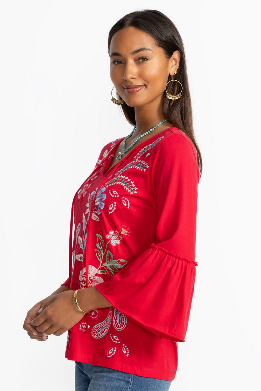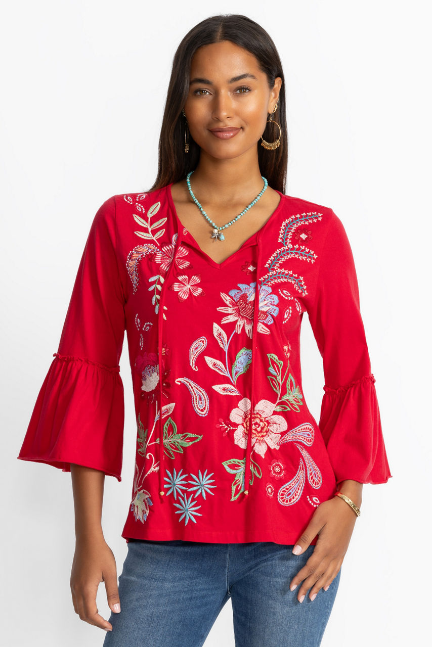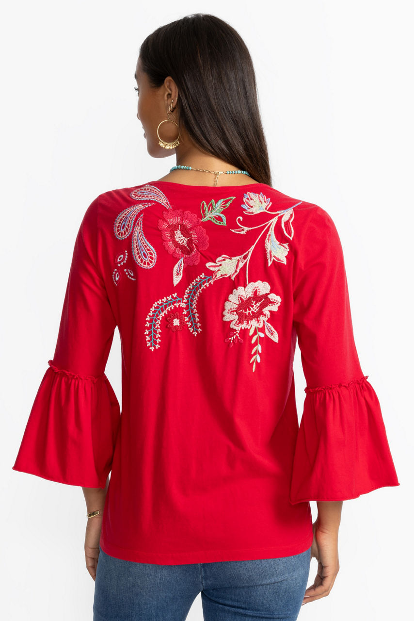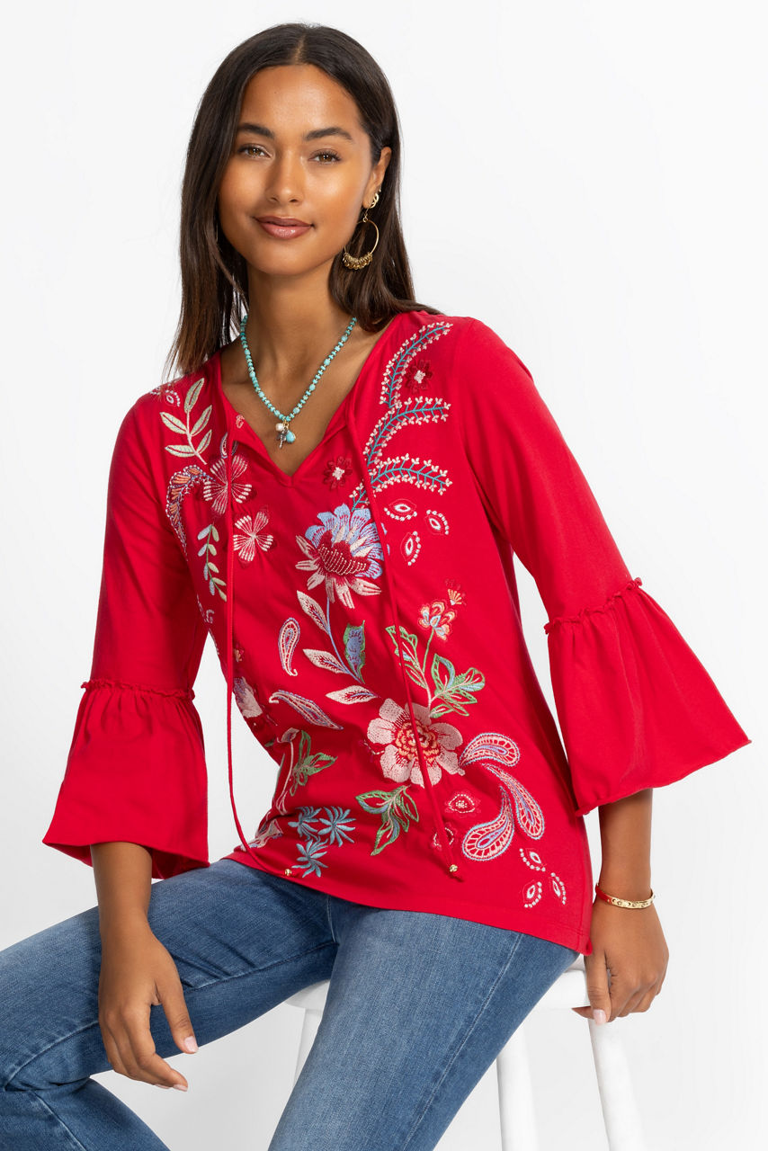 Offering a modern take on a classic long sleeve tee, the Freyde Ruffle Sleeve T-Shirt is crafted from 100% cotton. Designed with a split V-neckline adorned with decorative tassels, this tee is embellished with bold embroidered detailing and is finished with delicate ruffling at the sleeves. Pair with a denim skirt and trendy flats for a polished weekend look.