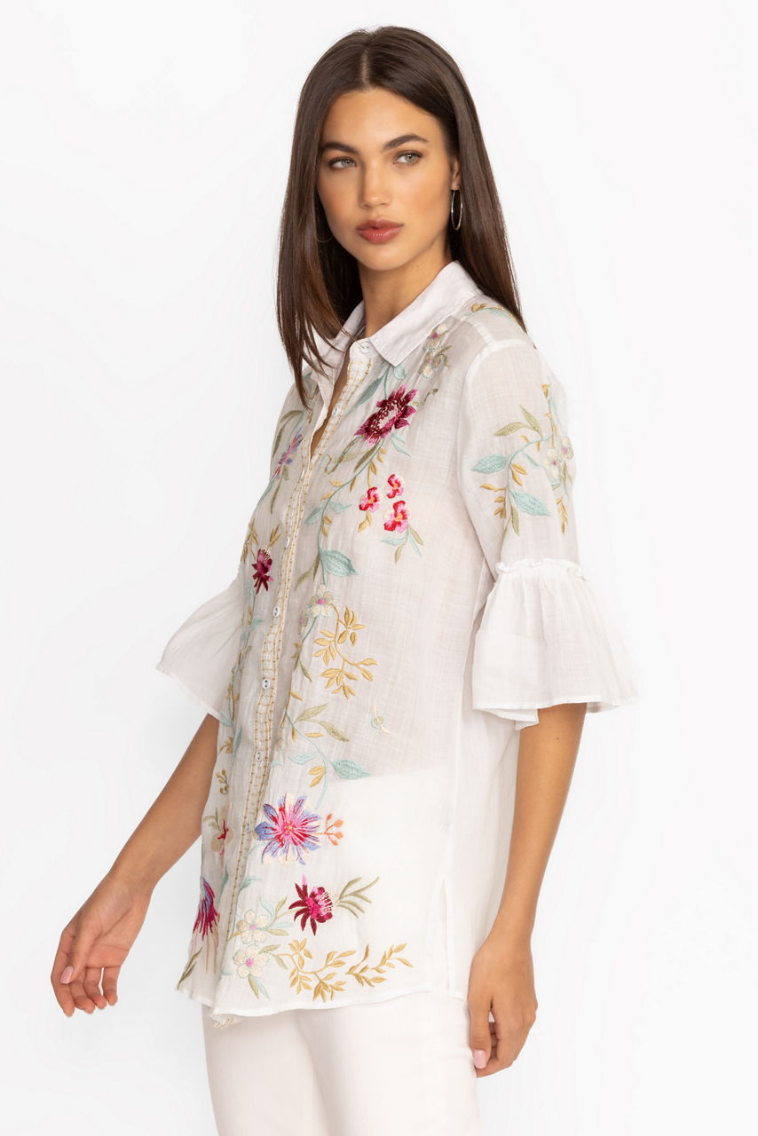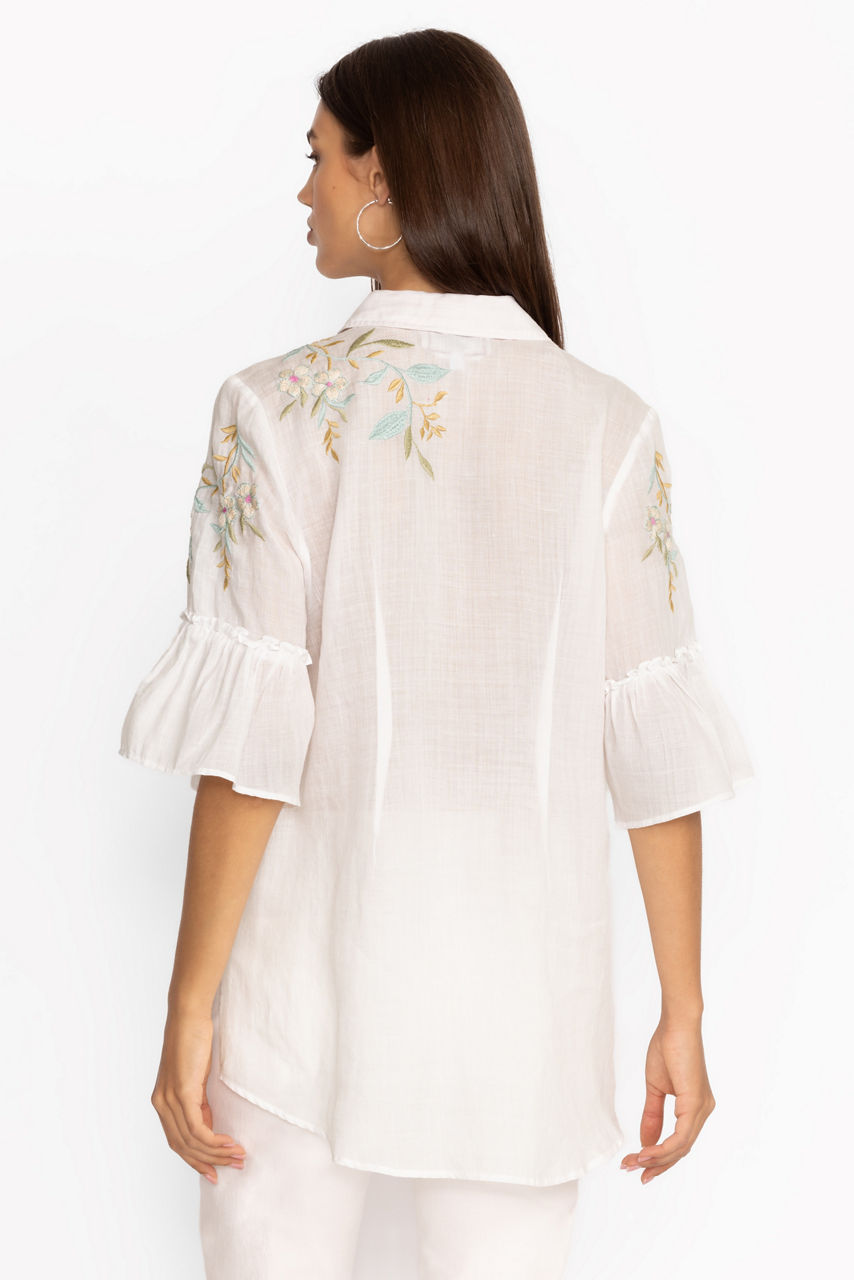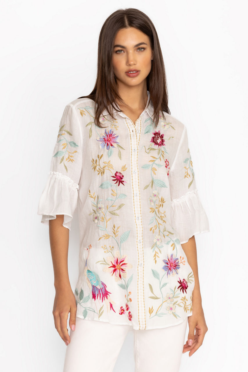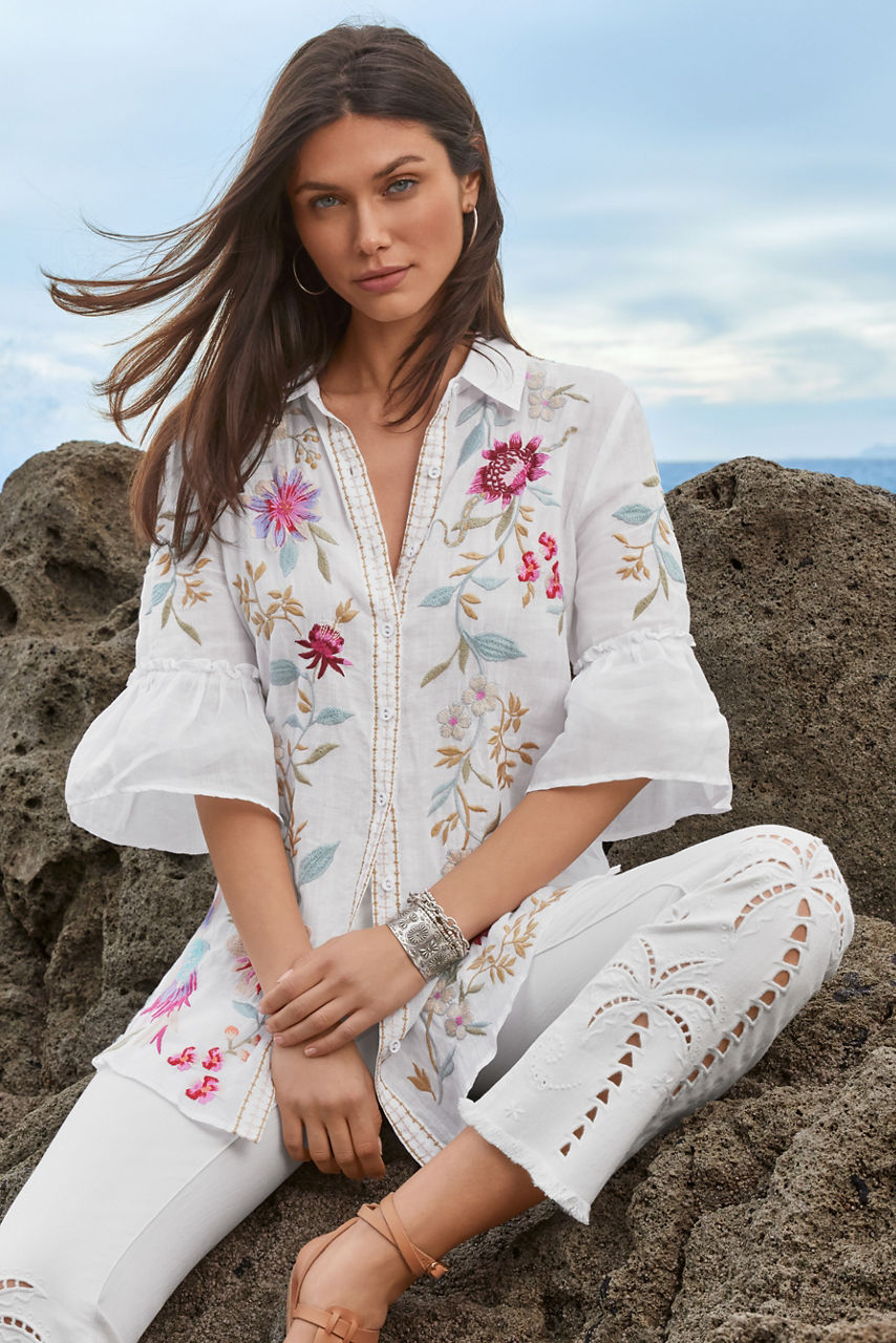 Crafted from a lightweight breathable fabric, the Darcie Ruffle Sleeve Tunic is delicately embellished with colorful floral embroidery. Featuring a classic collar and button-front, this blouse is finished with gathered sleeves and a relaxed tunic bodice. Pair with leggings and easy flats for a casual weekend look with lots of style.