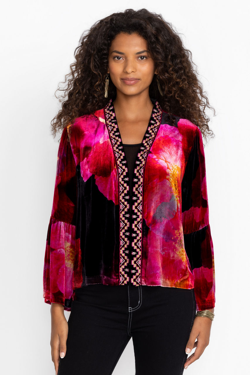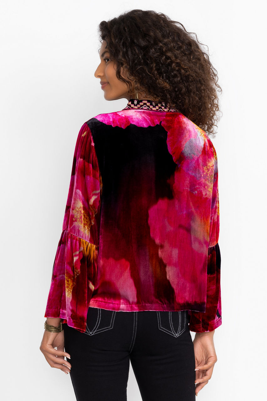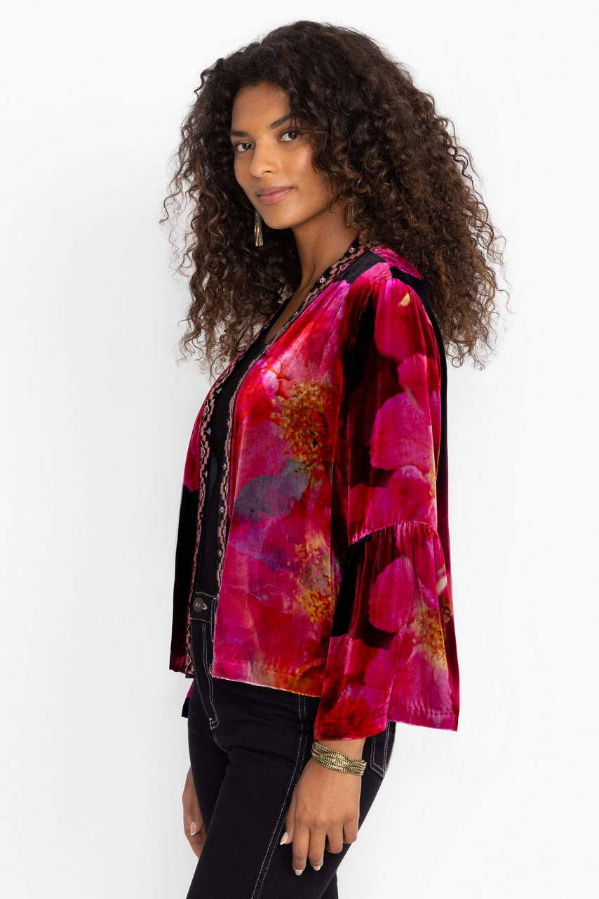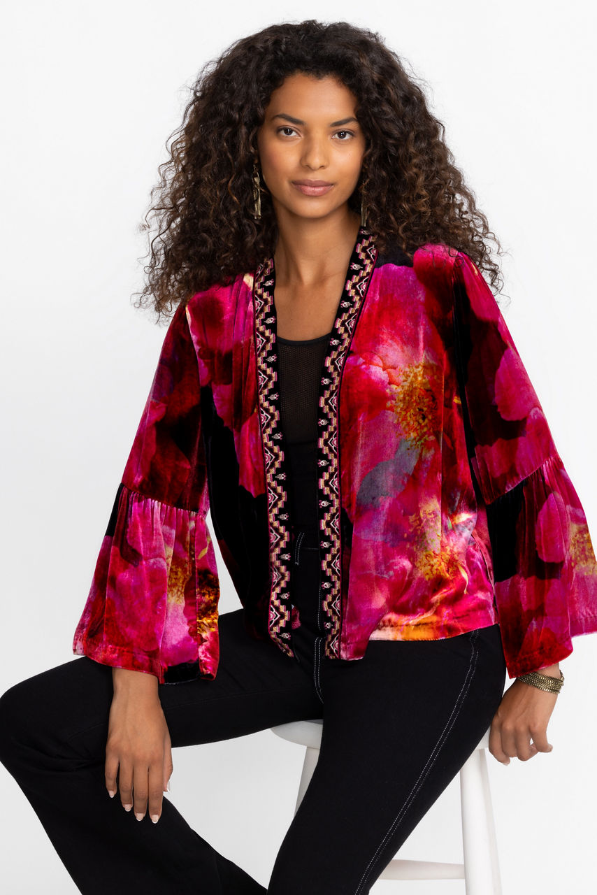 Crafted from a unique silk blend, the Ruffle Sleeve Velvet Bolero is washed in brilliant floral color. Featuring an open front bordered with intricate placement embroidered detailing, this cropped bolero is finished with a ruffled bell sleeve. Layer over a mock-neck top and fitted pants to make this bold jacket the center of attention.