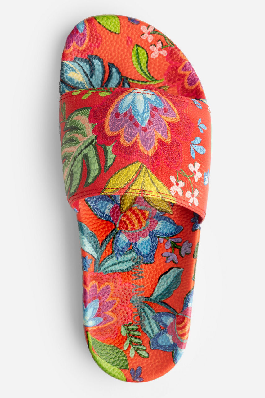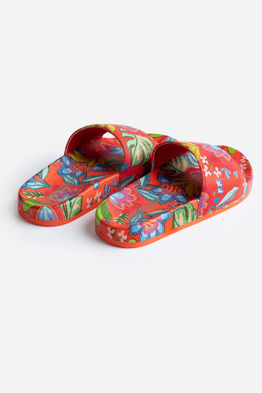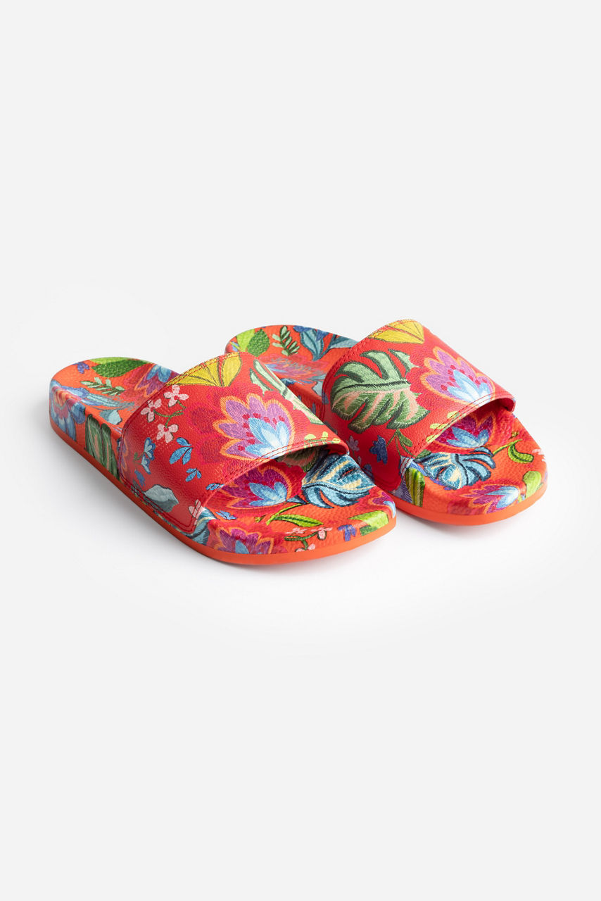 The Rumba Pool Slides add a vibrant splash of color to any poolside ensemble. Featuring a molded platform footbed and a wide comfortable strap across the top, these colorful slides are adorned with a colorful floral motif. Pair with the Rumba String Bikini and a breezy linen cover-up for a bold poolside look.