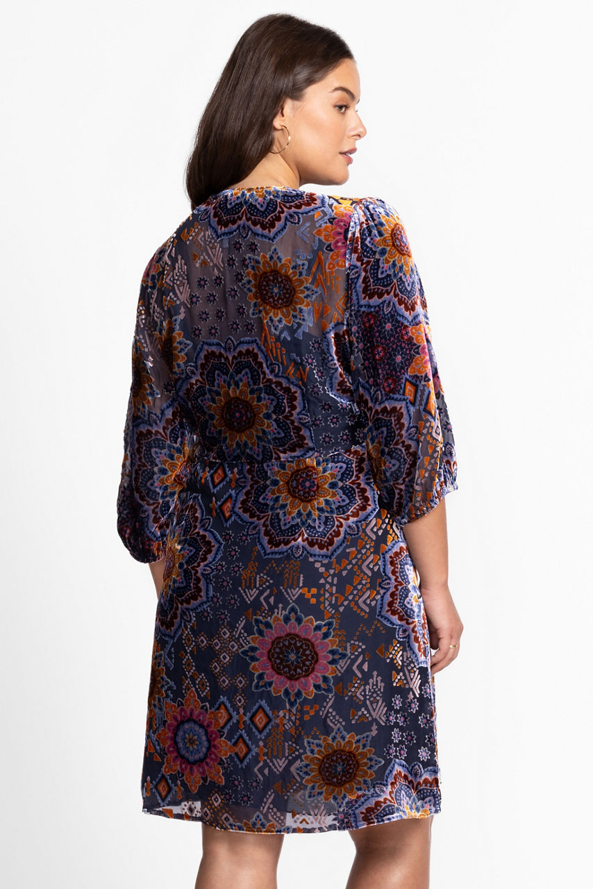 Boldly embellished with a retro-inspired print, the Ryan Dress is crafted from a unique silk blend with a burnout treatment. Designed with a deep V-neckline and a button-front closure, this slip-lined dress is finished with 3/4 length bishop sleeves. Pair with classic pumps and eclectic jewelry for an eye-catching evening ensemble.