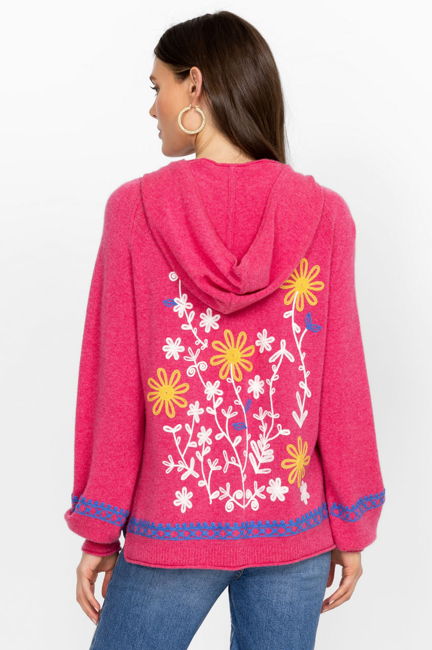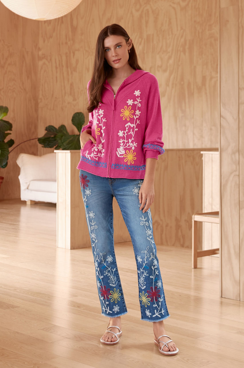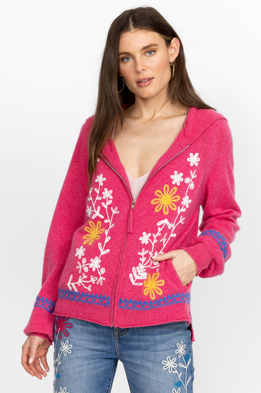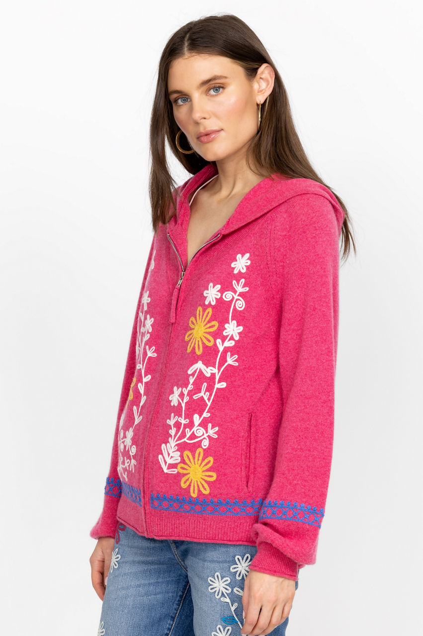 A versatile icon, the Ryan Zip Up Hoodie is brought to life through vivacious colors and happy motifs. Crafted from a sumptuous wool cashmere blend, this knitted hoodie is a cozy option for cooler days and features a zip front, long sleeves, a pattern along the edges, and a feminine floral placement embroidery in white and orange tones. Wear with joggers and a tee for an easy downtime look.