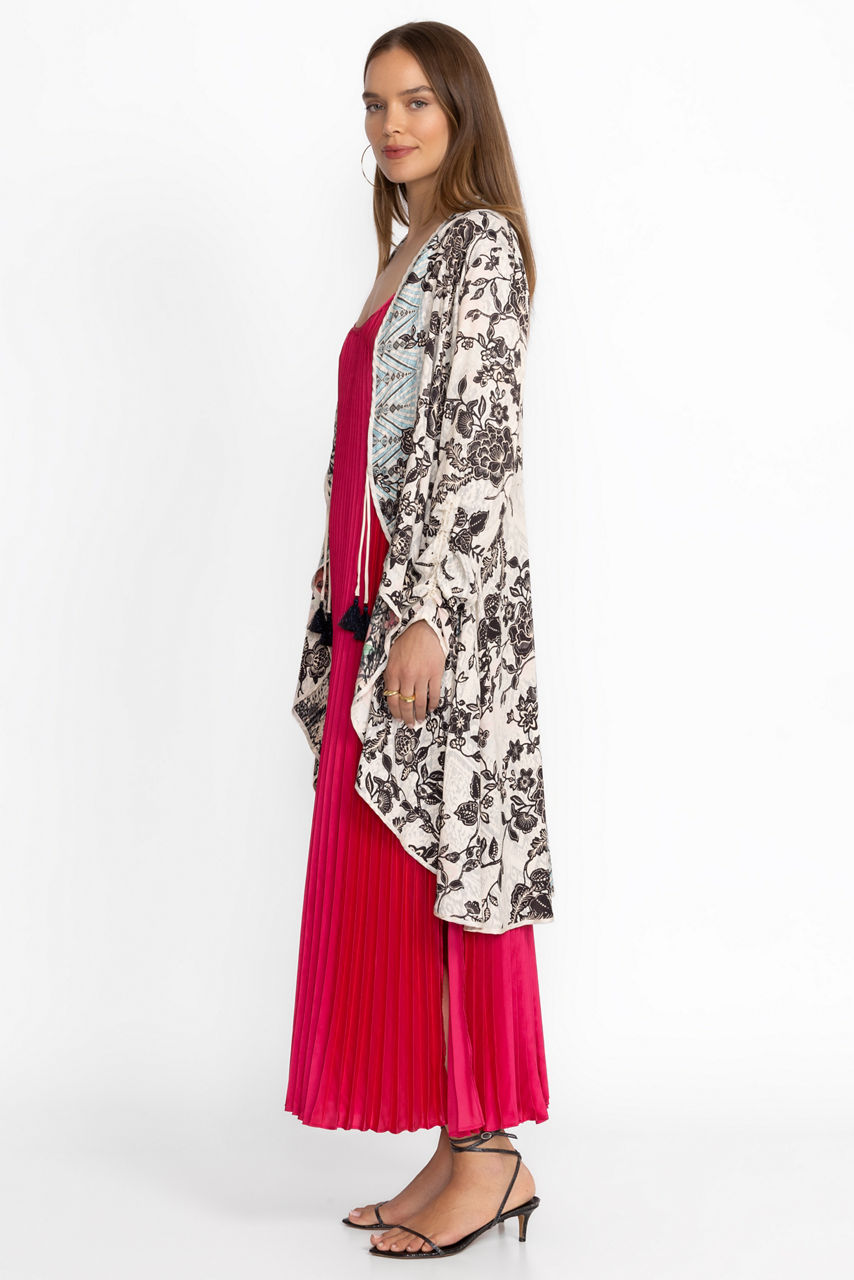 Carefully crafted from a long-lasting fabric, the Vassilia Ryder Long Coat is the perfect combination of style and versatility. Featuring a shawl collar and a tie-front with decorative tassels, this fully reversible coat offers two unique patterns to add to your wardrobe. Pair with fitted pants and a silk tank for a bold look with a hint of dramatic flair.