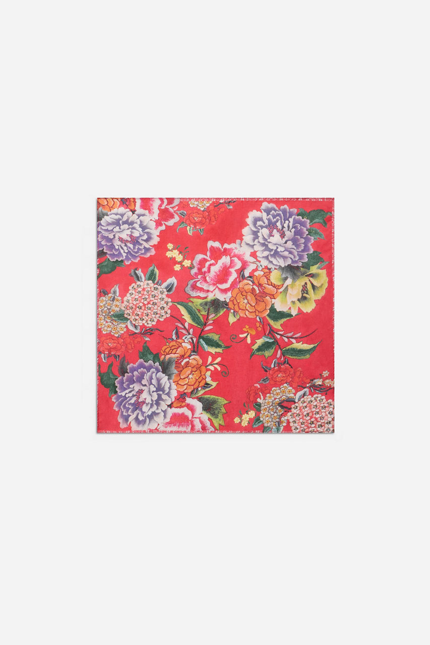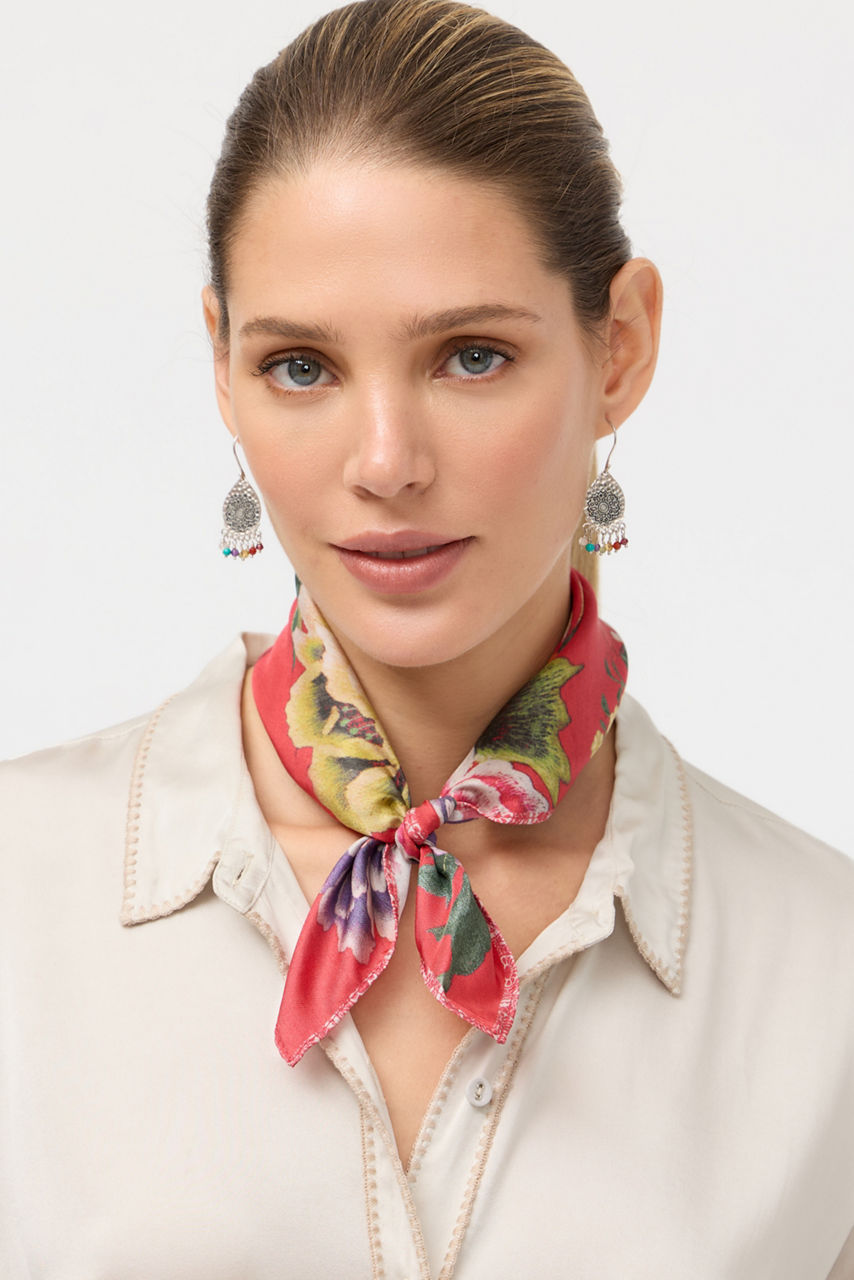 Indulge in 100% sumptuous silk with the Ryuu Neck Scarf, featuring a delicately rolled hem and an opulent floral design bursting with color. Its rich texture and intricate pattern evoke effortless luxury. Tie it at your neck, weave it through your hair, or accent your bag for a touch of boho chic.