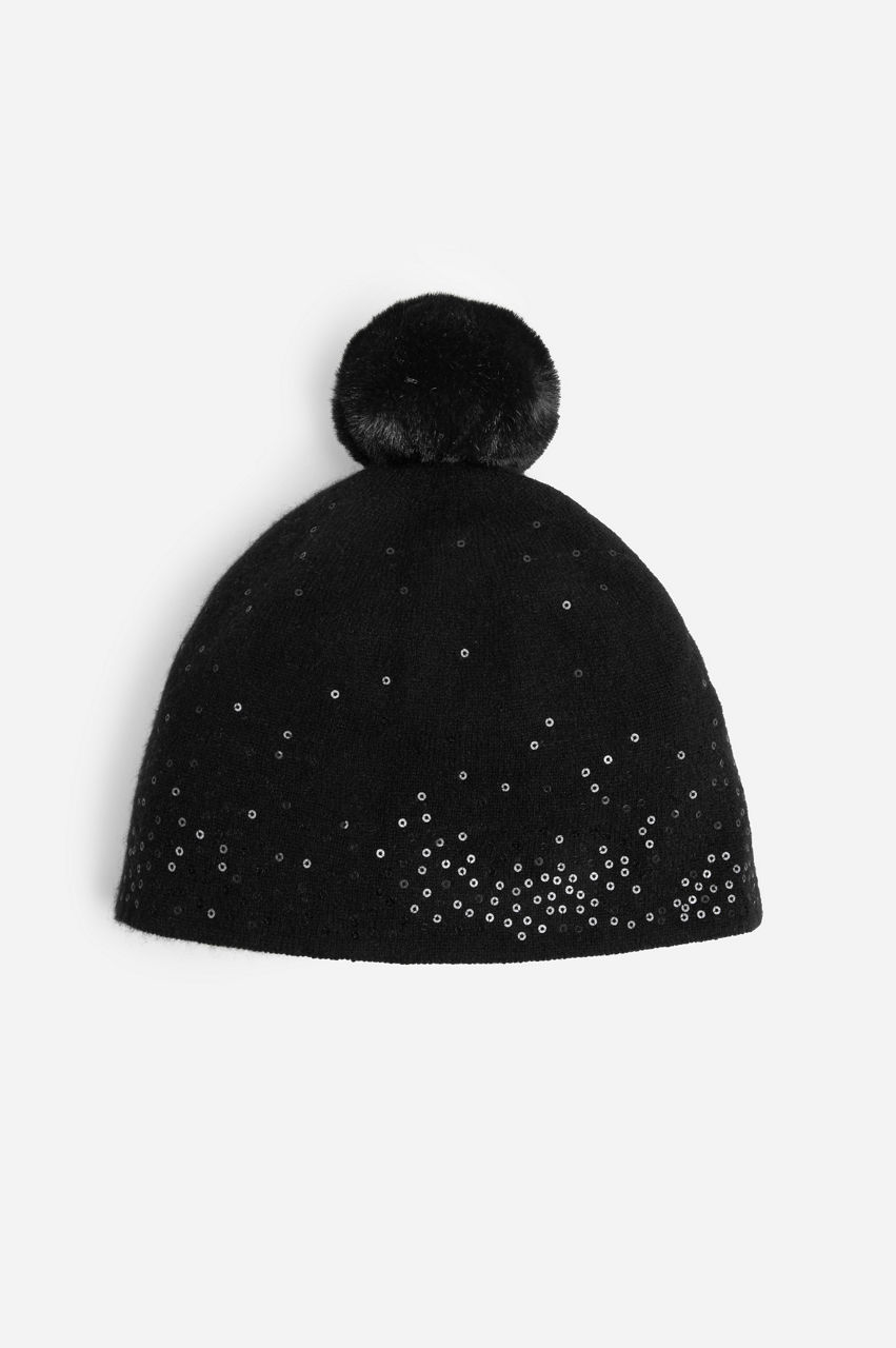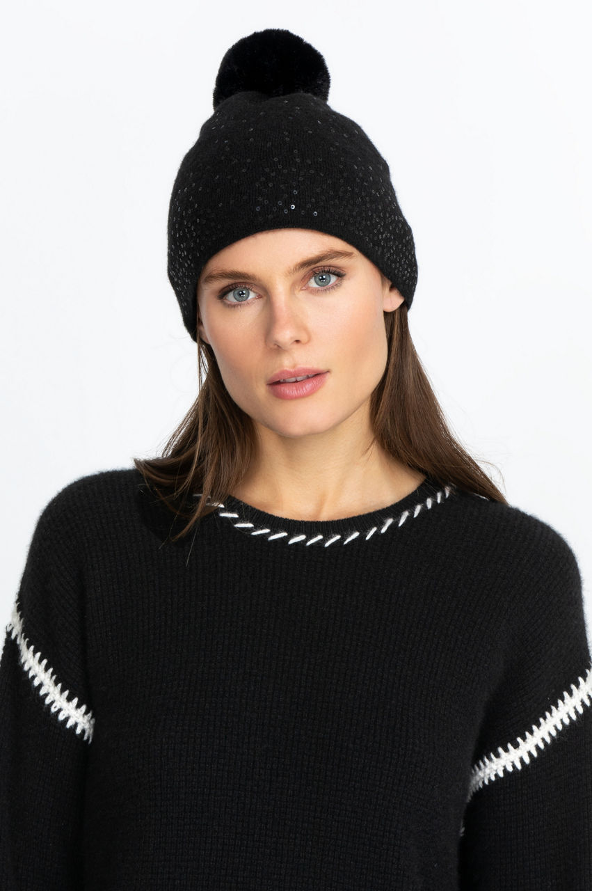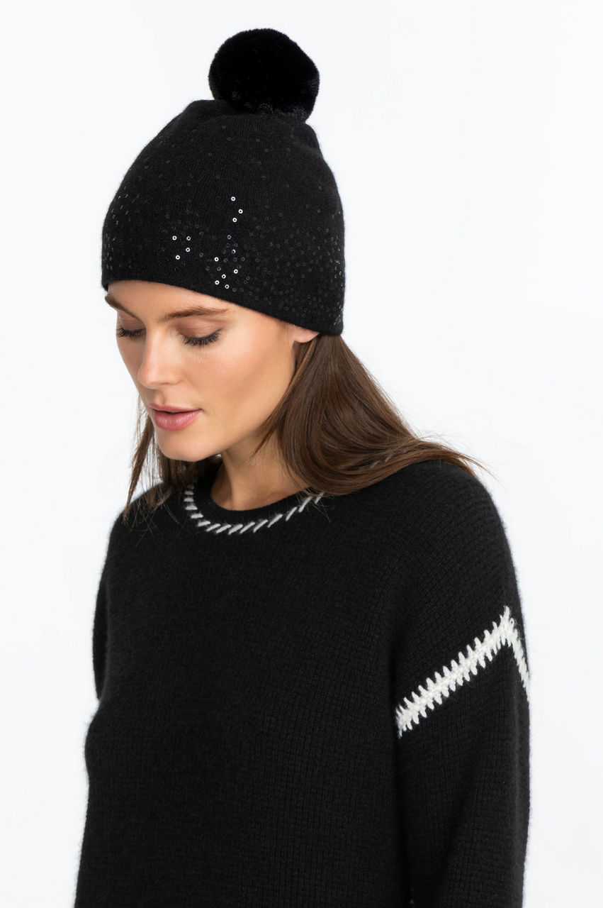 Stay warm and stylish with the Sabi Cashmere Beanie. This accessory is the perfect finishing touch to a chic wintertime outfit with its pom-pom detail and contrasting dot pattern. The pom-pom looks great with a faux fur-lined coat while the cashmere blend will complement any soft sweater.